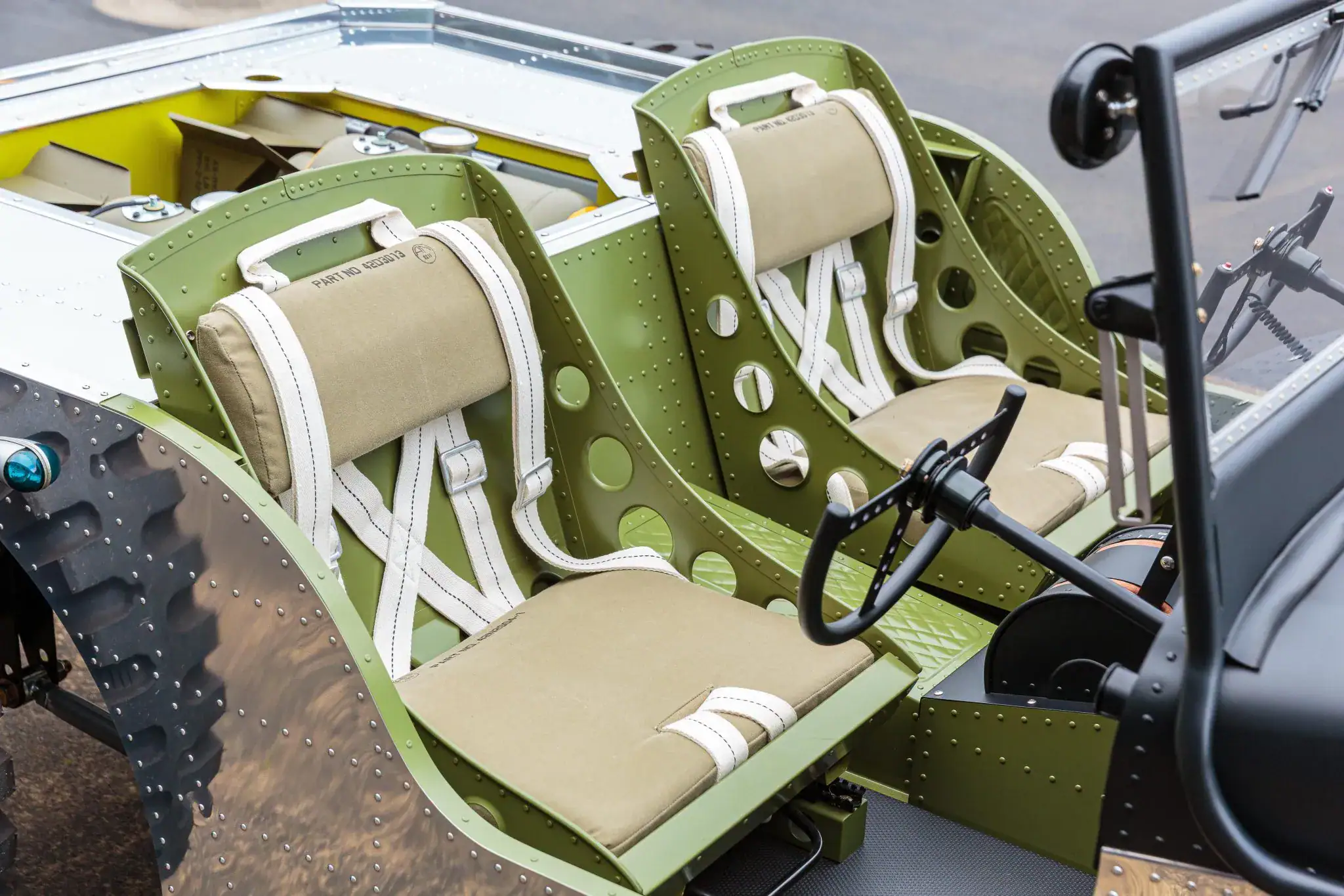 Il y a aussi des indicateurs de niveau de carburant, de température du liquide de refroidissement, de pression d’huile et de tension électrique. Les compteurs kilométriques numériques affichent des valeurs différentes, et le vendeur estime que le véhicule a parcouru moins de 480 km depuis sa création. Des sacs de parachute servent de coussins sur les sièges de type bombardier. Des essuie-glaces à commande manuelle ont été prévus pour le pare-brise inclinable.