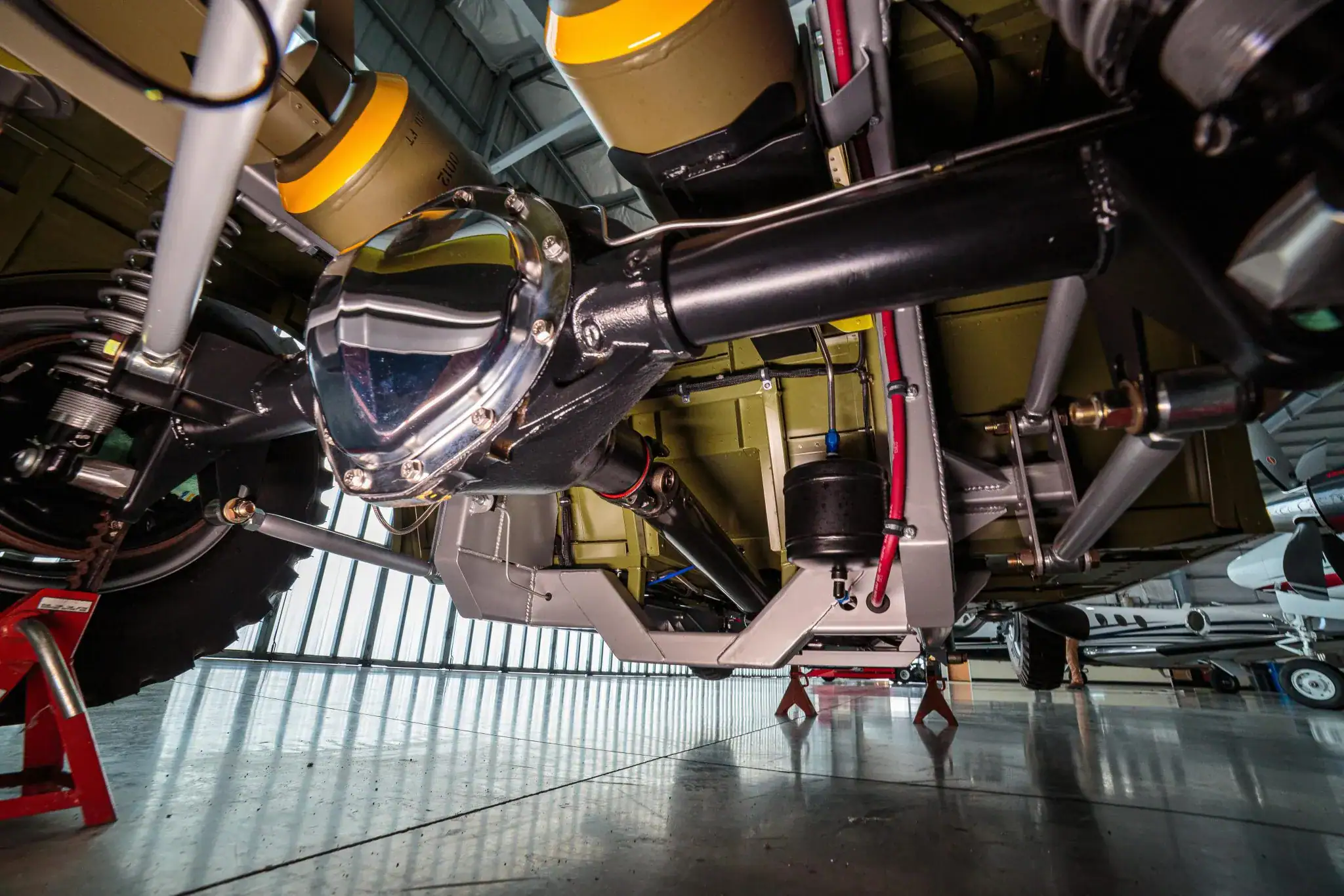 Les jantes en acier de 16 pouces sont chaussées de pneus militaires Firestone de 6 pouces à l’avant et de 7,5 pouces à l’arrière. La suspension avant, dite “suicide”, intègre un essieu avant de Ford F-100 percé, supporté par des tirants de suspension sur mesure, un ressort à lames transversal et des amortisseurs chromés. La suspension arrière à quatre bras est équipée d’une barre Panhard et d’amortisseurs réglables.