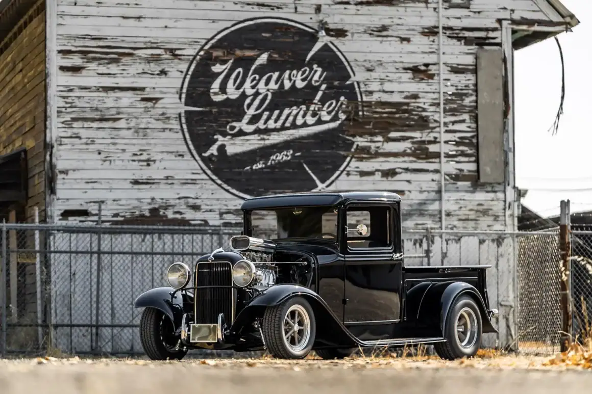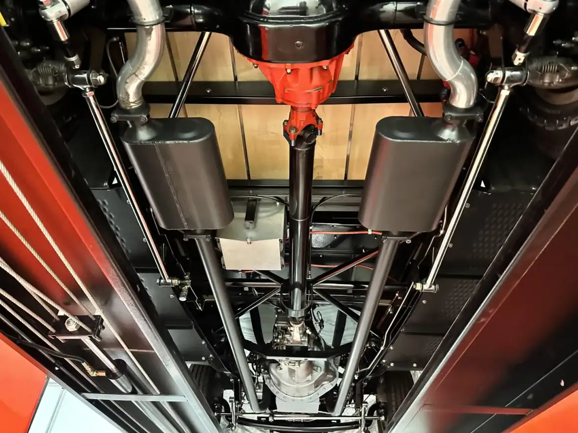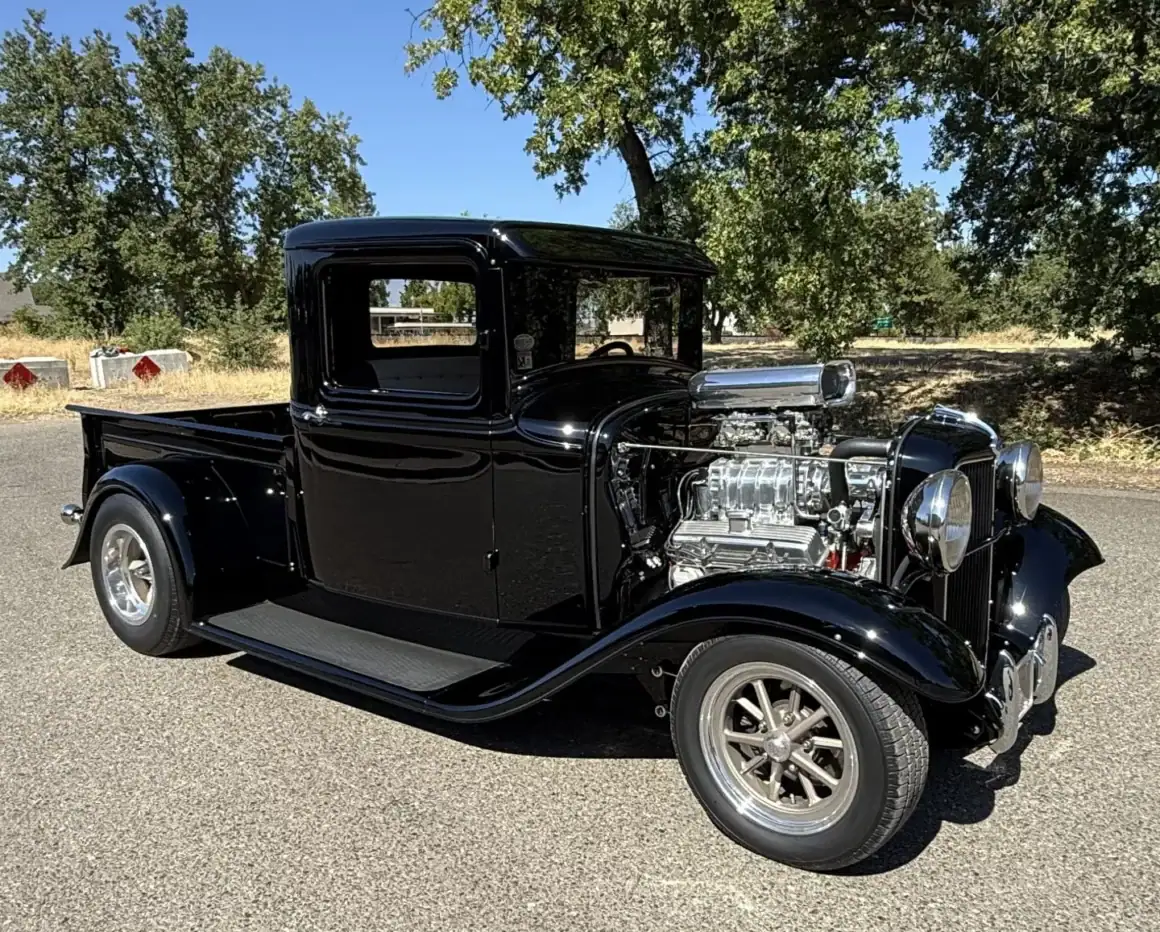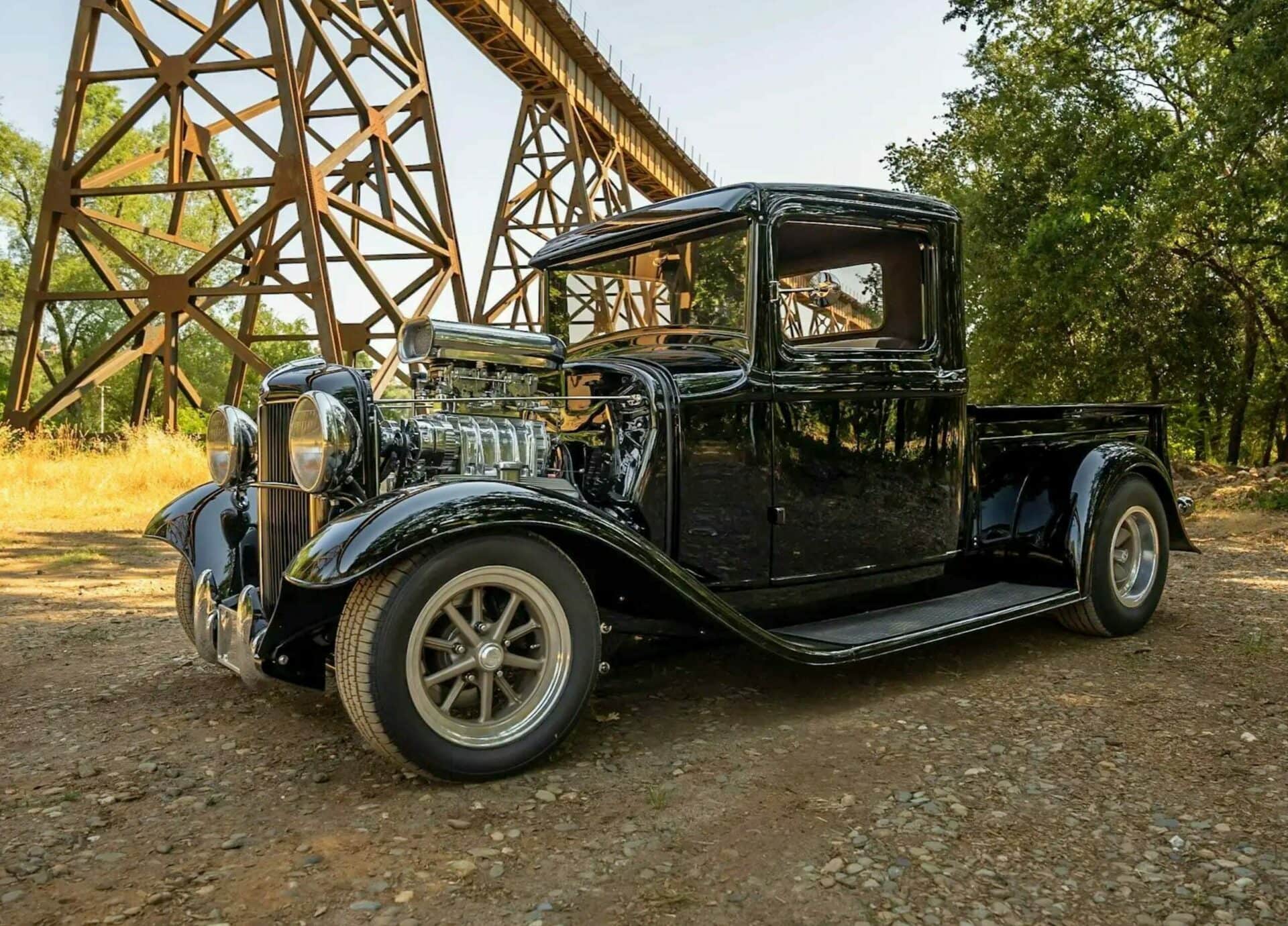 Bref… Ce Ford’34 Pick-up à carrosserie en acier et à ailes complètes, a été modifié en Hot Rod il y a environ 25 ans, avec un châssis réalisé “maison” sur mesure et équipé d’un V8 350ci suralimenté d’un Blower 4-71 et de deux carburateurs Edelbrock coiffés d’une prise d’air Hilborn, le tout relié à une boîte manuelle Muncie à quatre vitesses et à un pont/différentiel Ford 9″. Le Pick-up est équipé de jantes alliage ET de 15″ avec disques aux quatre roues.