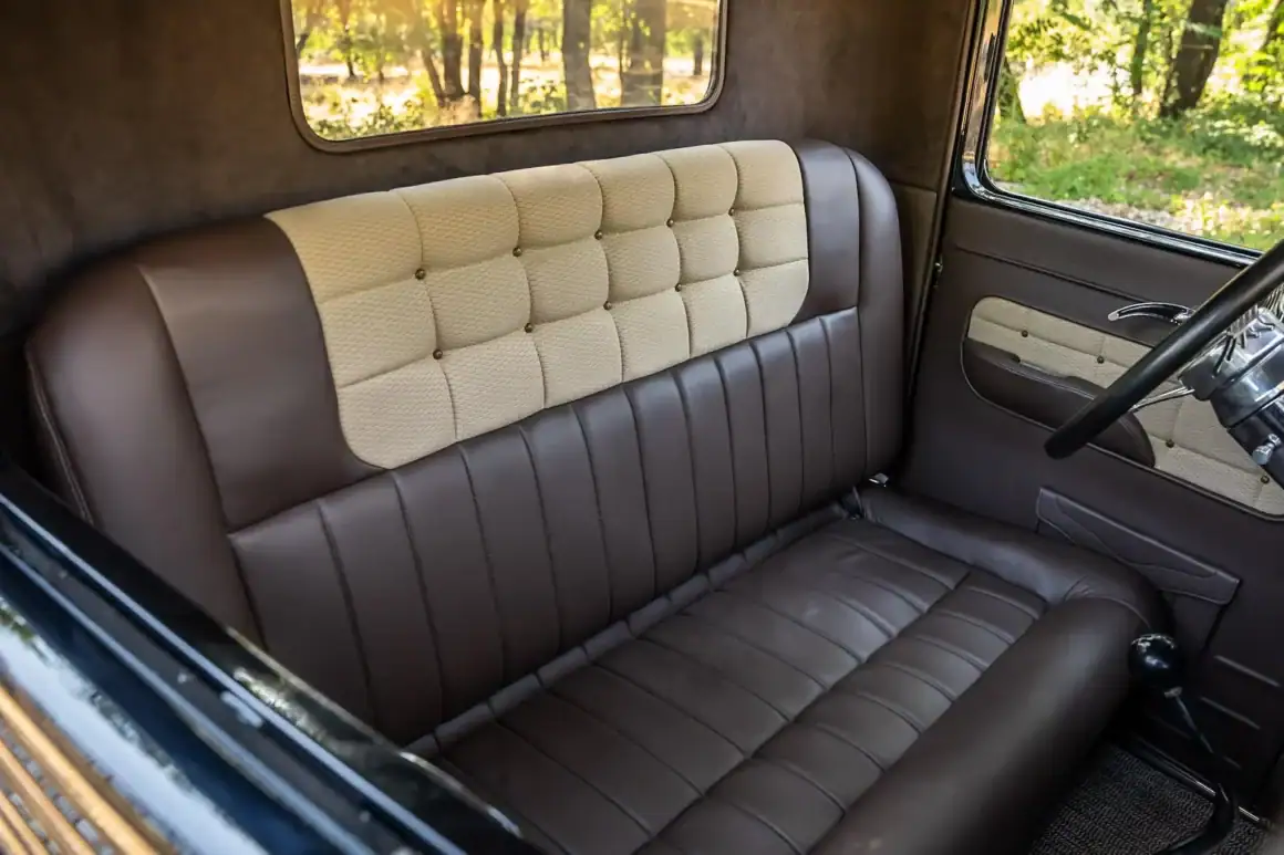 L’essieu avant est rigide avec quatre barres et un ressort à lames transversal. Le train arrière est triangulé avec coilovers réglables. La cabine est équipée de compteurs Mooneyes, de vitres électriques, d’une banquette sous forme de 2 sièges en 1 sur mesure et d’un volant banjo sur une colonne inclinable. La benne PU est en érable “bouclé”. Au cours de l’année écoulée, le compresseur a été reconstruit, l’intérieur a été remis à plat et les pneus décalés changés…
