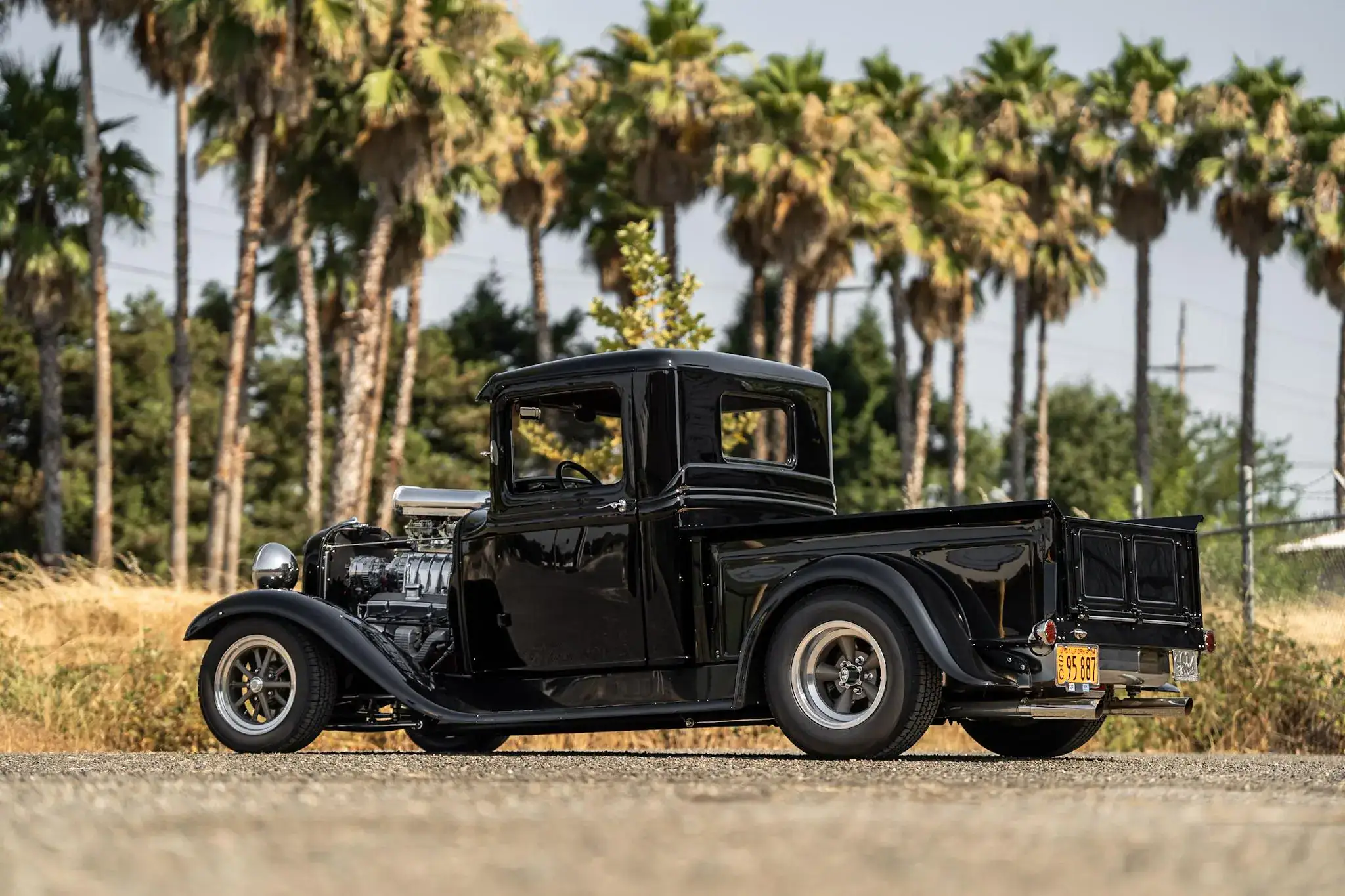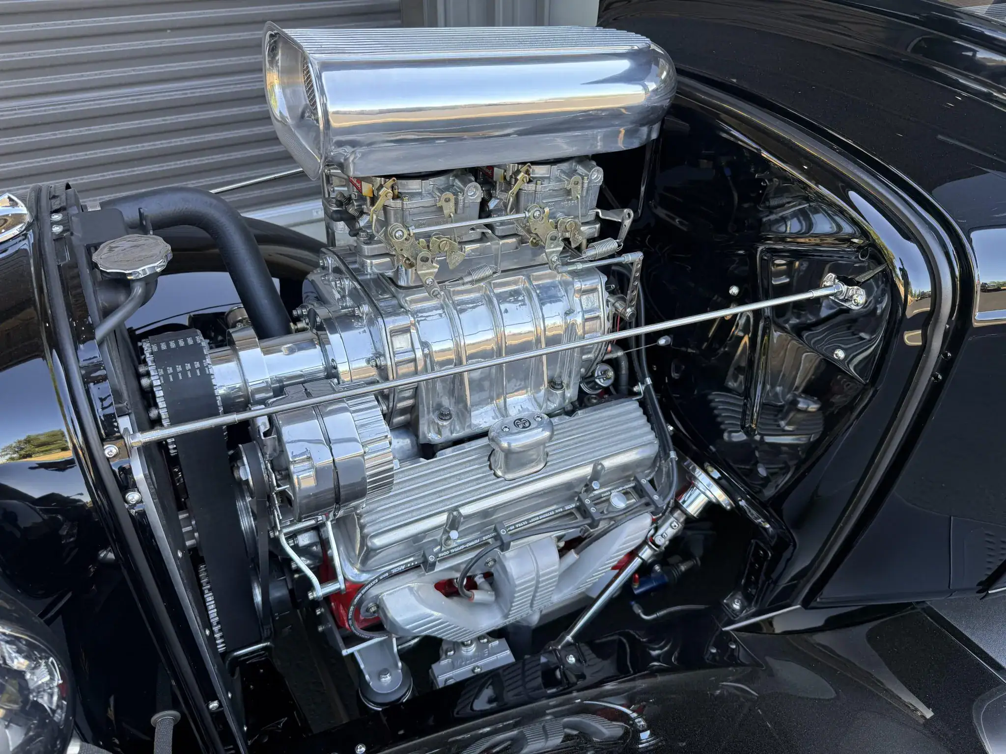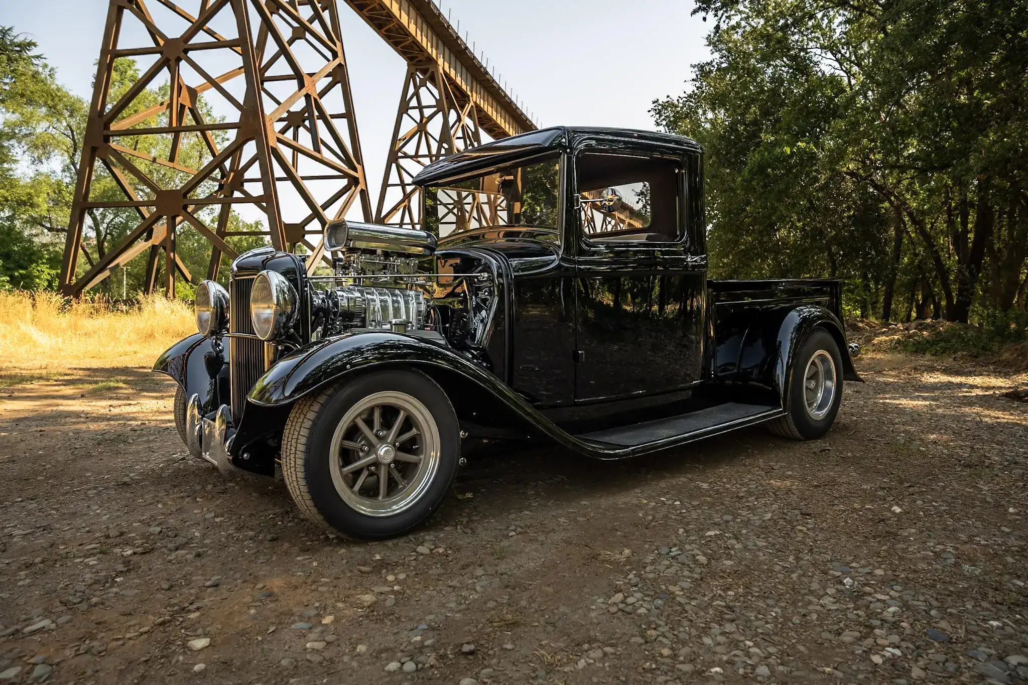 Bref… Ce Ford’34 Pick-up à carrosserie en acier et à ailes complètes, a été modifié en Hot Rod il y a environ 25 ans, avec un châssis réalisé “maison” sur mesure et équipé d’un V8 350ci suralimenté d’un Blower 4-71 et de deux carburateurs Edelbrock coiffés d’une prise d’air Hilborn, le tout relié à une boîte manuelle Muncie à quatre vitesses et à un pont/différentiel Ford 9″. Le Pick-up est équipé de jantes alliage ET de 15″ avec disques aux quatre roues.