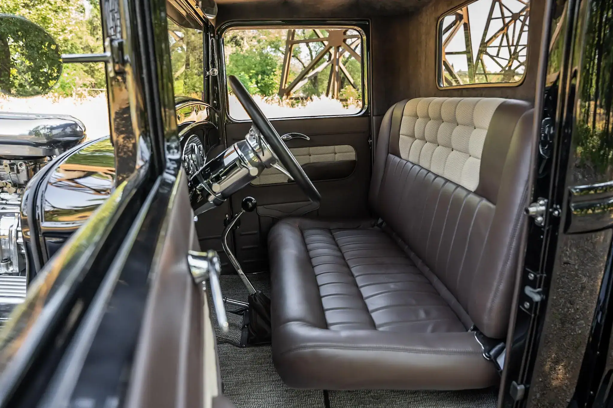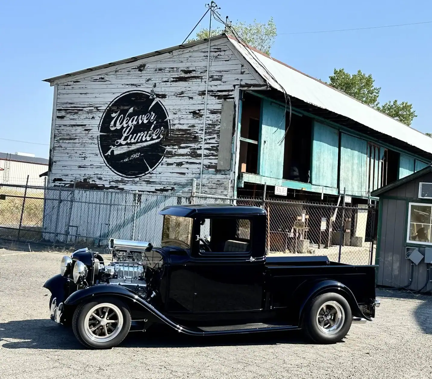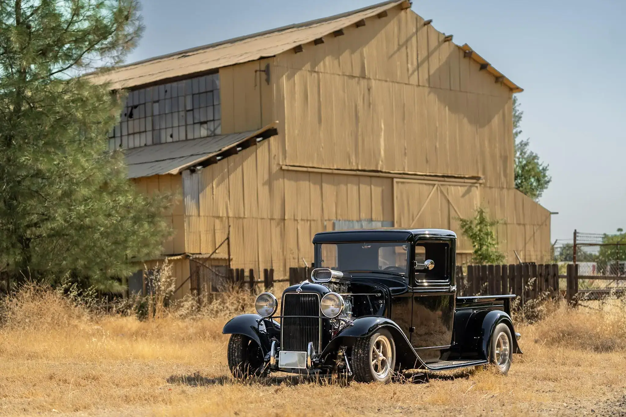 Bref… Ce Ford’34 Pick-up à carrosserie en acier et à ailes complètes, a été modifié en Hot Rod il y a environ 25 ans, avec un châssis réalisé “maison” sur mesure et équipé d’un V8 350ci suralimenté d’un Blower 4-71 et de deux carburateurs Edelbrock coiffés d’une prise d’air Hilborn, le tout relié à une boîte manuelle Muncie à quatre vitesses et à un pont/différentiel Ford 9″. Le Pick-up est équipé de jantes alliage ET de 15″ avec disques aux quatre roues.