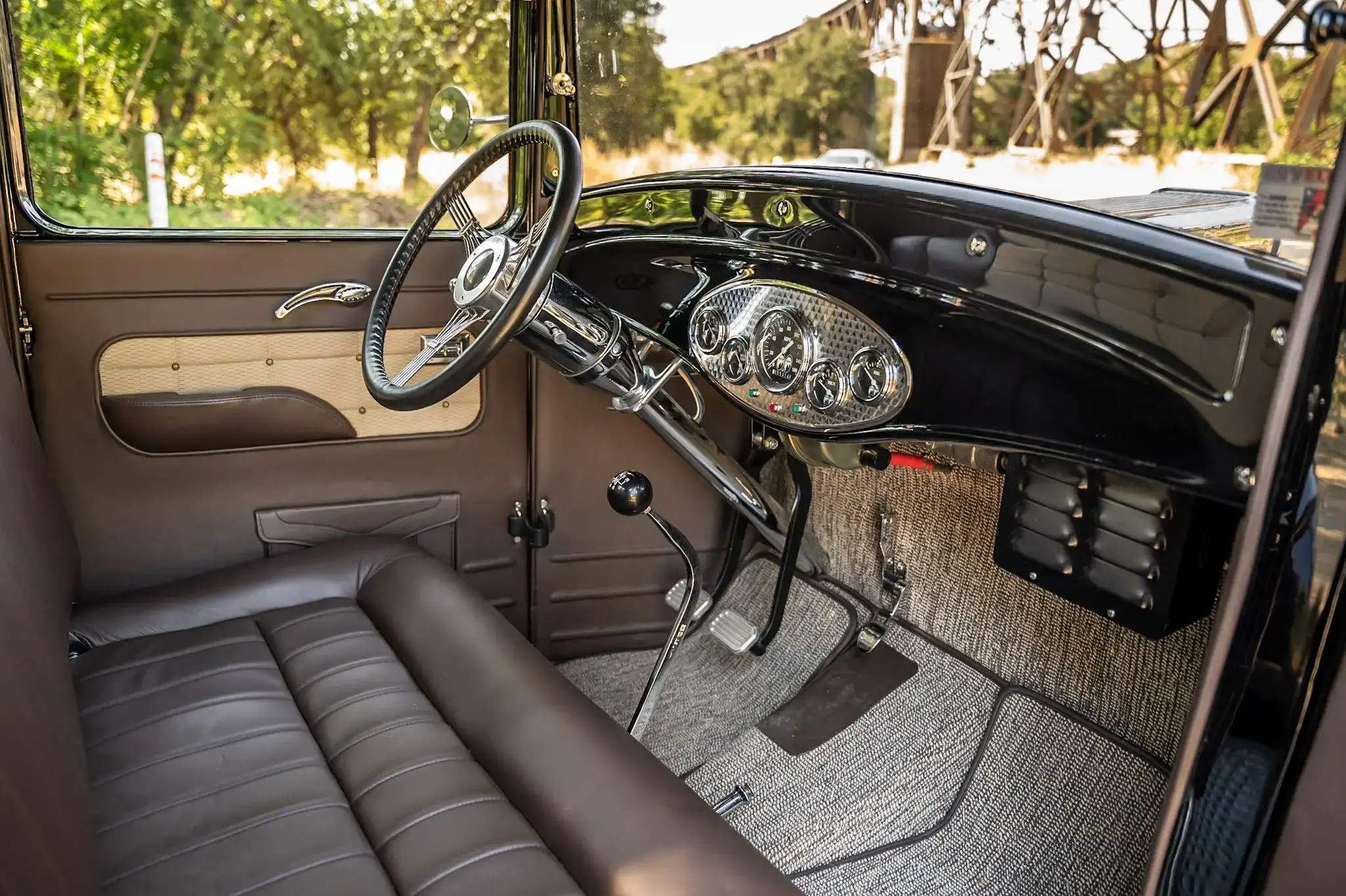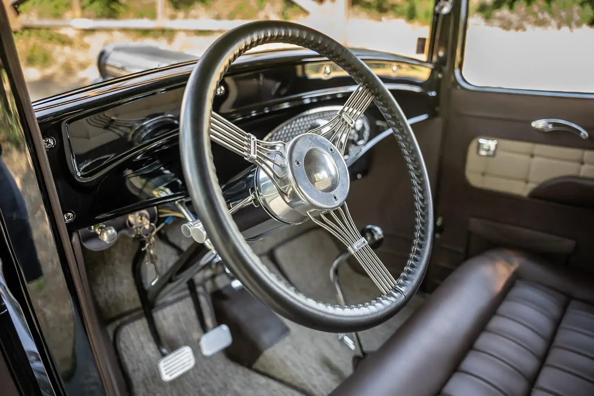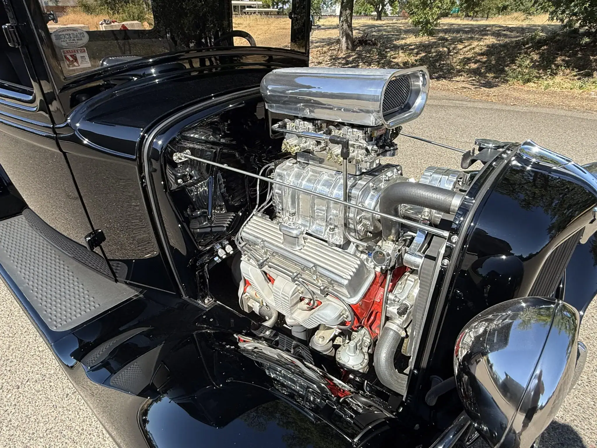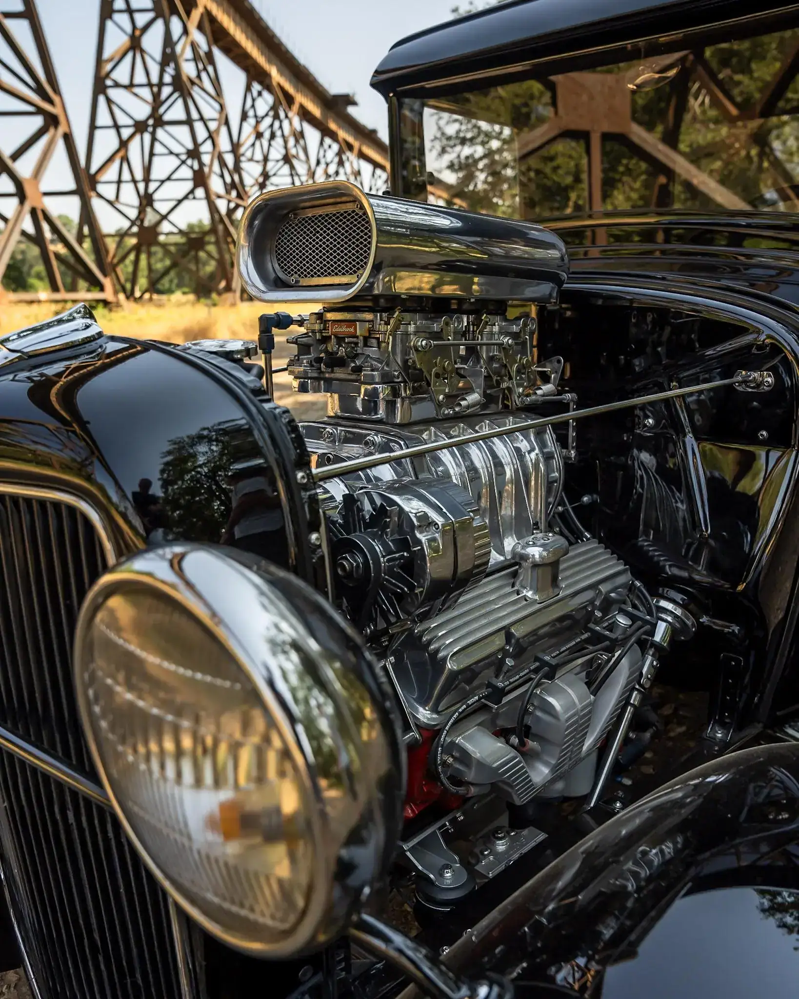 Le “Title” est californien, et il est “propre”, indiquant que c’est une Ford de 1934 répertoriée “VIN 18751019”... Les collecteurs à ailerons Sanderson sont reliés à un système d’échappement double, les caches de soupapes sont “à ailerons” de même que les respirateurs Mooneyes. Voilà… Prix espéré 45.000$… Dernier problème : trop de photos pour pas assez de texte !!! Pour tout positionner ce serait une photo par 2 lignes de texte…