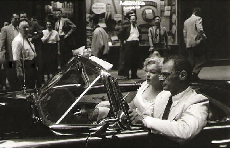 Arthur Miller se tenait avec Mrs Strasberg, le professeur d’art dramatique de sa femme et moi-même… dans l’obscurité ; il paraissait renfermé en lui-même, un peu timide, mal à l’aise. C’était Marilyn qui le rendait ainsi…