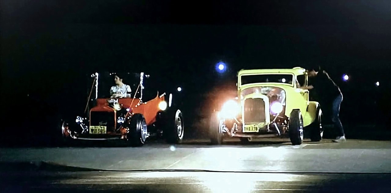 Ils partent en effet entamer leurs études universitaires sur la côte est. Après s’être retrouvés au Mel’s Drive-In avec leurs copains, Steve prête sa Chevrolet Impala blanche de 1958 à Terry Fields (Grenouille) avec qui John Milner propriétaire d’un Hot Rod jaune passe une dernière nuit à parader en voiture avec leurs petites amies le long du Strip, la grand rue que sillonnent sans cesse les véhicules rutilants d’autres nombreux jeunes à la recherche d’aventures amoureuses et sexuellement “touche-pipi” avec des fillettes en longues chaussettes et jupes plissées pendant que les autoradios diffusent du rock ‘n’ roll…