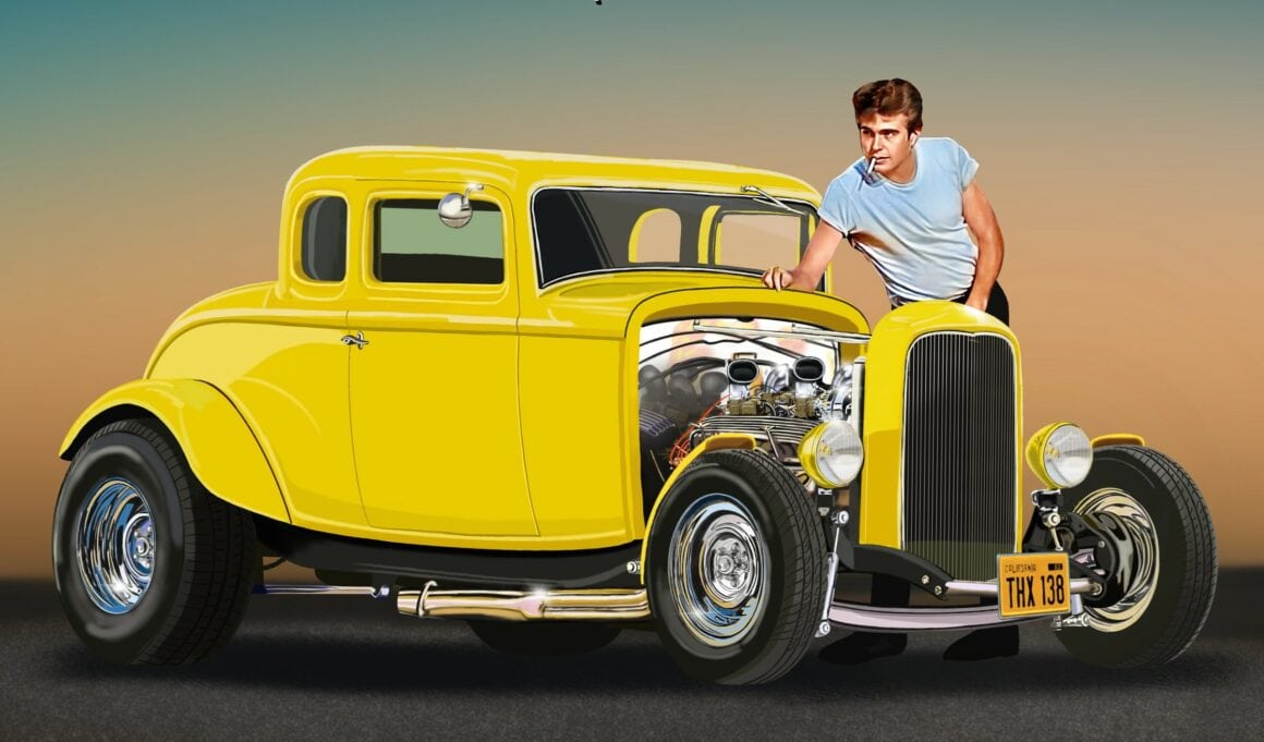 Henry Travers est le gars qui s’était vu confier la tâche enviable de superviser la construction du Hot Rod jaune. Pratiquement tout le tournage a eu lieu en Californie du Nord, donc la logique dictait de choisir un garage dans la région pour la construction réelle de la voiture et son suivi (entretien), Henry Travers a choisi Bob Hamilton à Ignacio. Lucas voulait un style “Coupé Highboy” avec des ailes “bobbées” pour souligner les lois sur les ailes alors obligatoires auxquelles les Hot Rodders étaient continuellement confrontés dans les années’60. La construction supplémentaire comprenait donc l’ajout d’ailes avant.