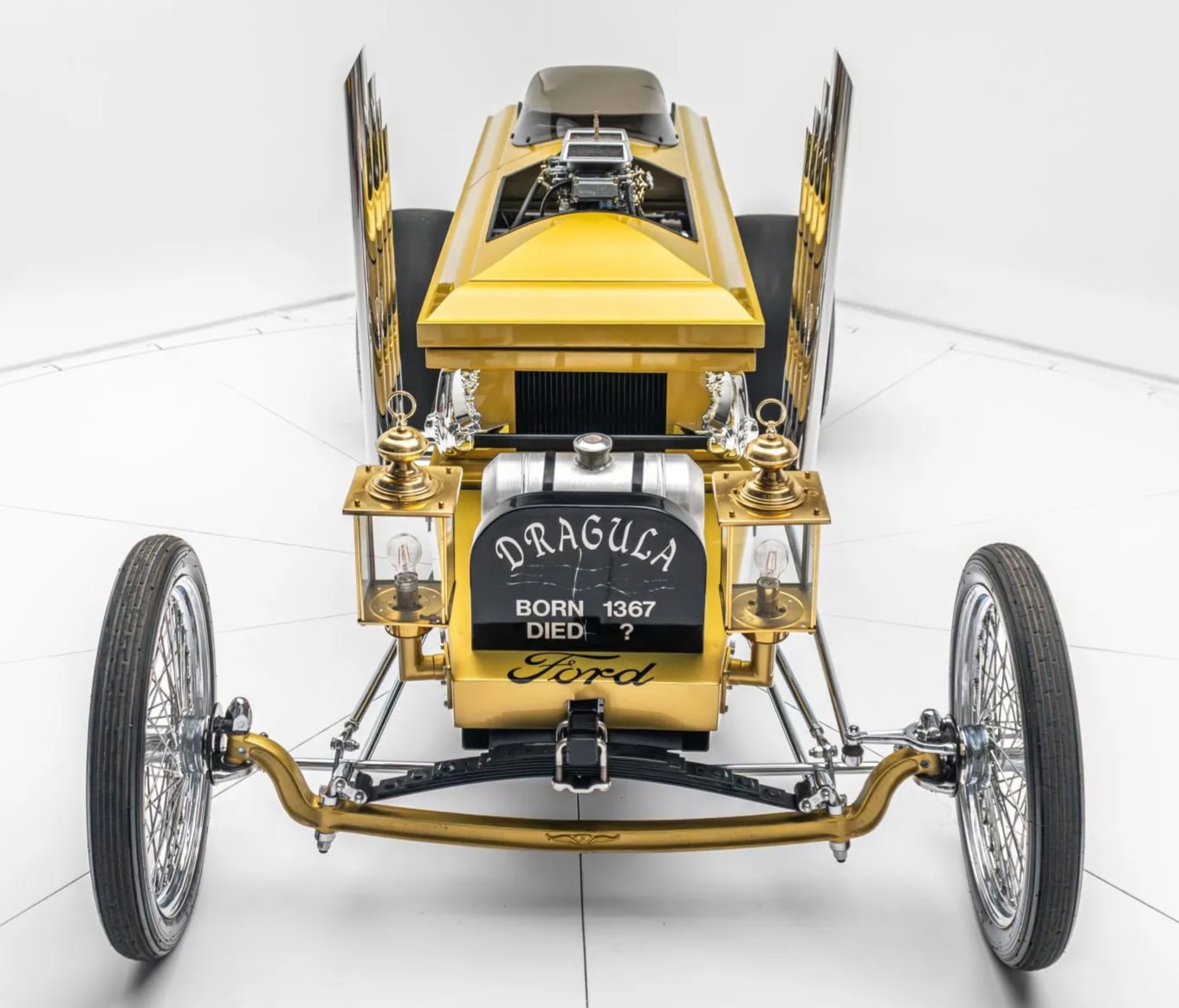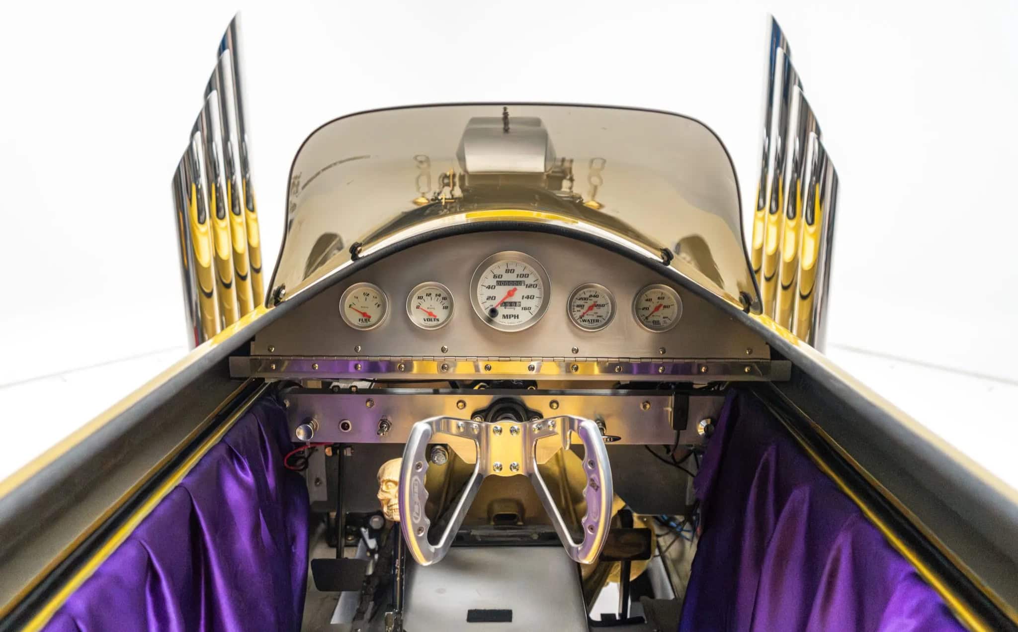À l’intérieur, on découvre un siège baquet, une commande d’accélérateur manuelle, un volant “papillon”, des instruments de bord Equus et des bandes lumineuses LED. Ce modèle personnalisé est actuellement proposé à la vente en Floride par Bullet Motorsports, avec un acte de vente et un historique d’entretien récent. Présentée dans l’épisode “Hot Rod Herman” de la série TV Américaine “Les Monstres” , cette “Drag-U-La” est une copie/réplique…