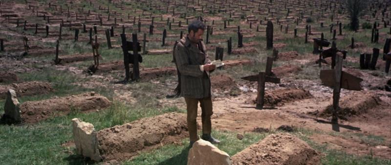 Tuco commence à chercher, puis se met à courir entre les tombes dans une course effrènée, ce point d’orgue du film est précédé d’un morceau génial, le travelling virevoltant autour de l’immense cimetière, se stoppant brusquement sur l’image de la pierre tombale et du visage bêtement stupéfait de Eli Wallach… Il est intéressant de savoir que le cimetière n’existait pas et qu’il a été exclusivement bâti pour le film, 250 soldats espagnols ont construit ces deux mille tombes sur la demande du réalisateur dans les plaines d’Almeria ! Cette scène comporte en son centre une arène, évoquant les cirques antiques, dans laquelle s’affronteront les trois rivaux dans un “tournoi” ayant pour spectateurs ces milliers de morts !!! La plus belle scène (à mon sens) dans le film, qui nous plonge de façon humoristique, sarcastique dans une méditation sur la mort, la folie de la guerre et la quête de l’argent, à tout prix…