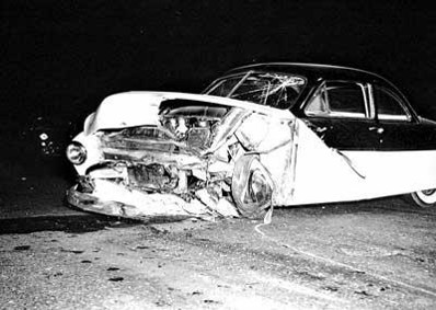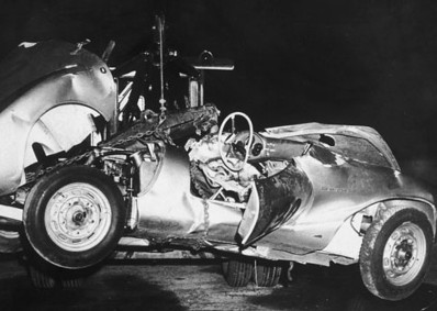 Le jeune Turnspeed déboule dans une Ford Tudor, arrive au croisement de la 466 et de la 41 fauchant Dean derrière son volant, le crash est terrible, le choc éjecte du cockpit le mécano, qui s’écrase sur le bitume, la mâchoire brisée et la jambe cassée, le conducteur de la Ford s’en tire avec seulement des contusions l’acteur meurt sur le coup, la légende se met instantanément en place. James Dean avait 24 ans !