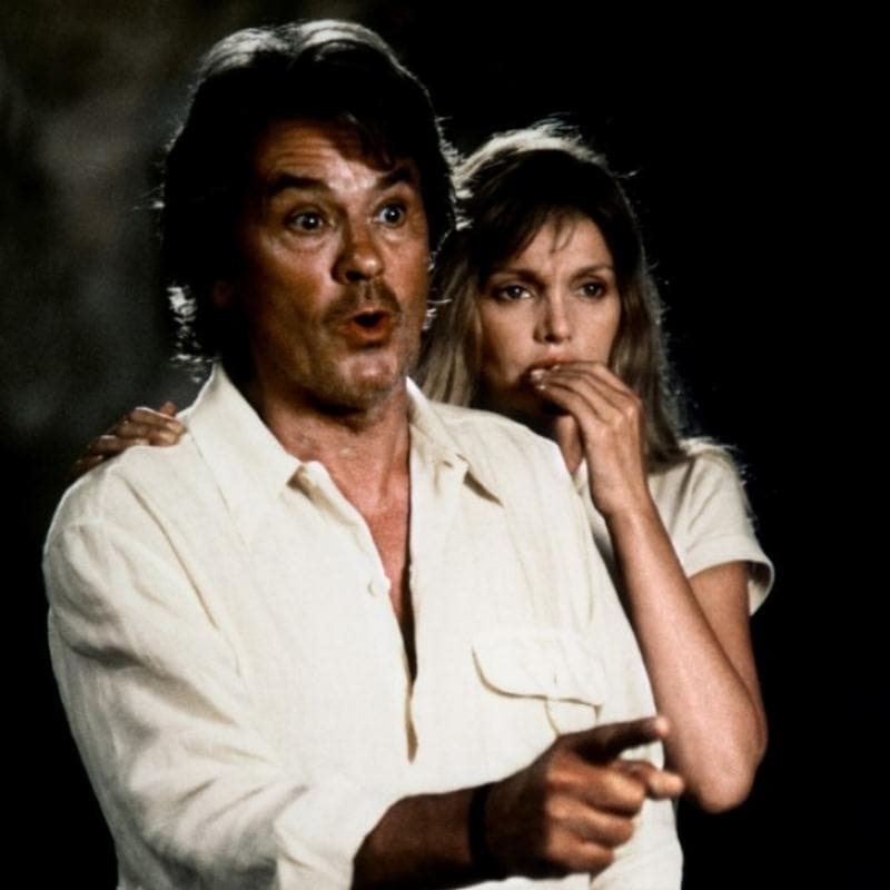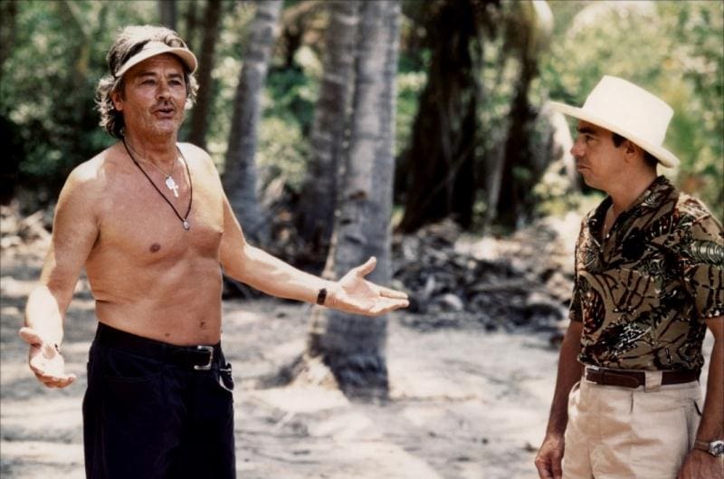 Dans ce cadre d’une immense laideur, plusieurs personnages falots s’ébrouent autour d’Alexandre (joué par Alain Delon), écrivain français déchu, alcoolique, dépressif, qui vit un exil fanfaron dans une hacienda en carton dont la déco millimétrée (et complètement nase), exciterait certainement beaucoup les rédactrices pré-ménopausées de Elle Décoration.
