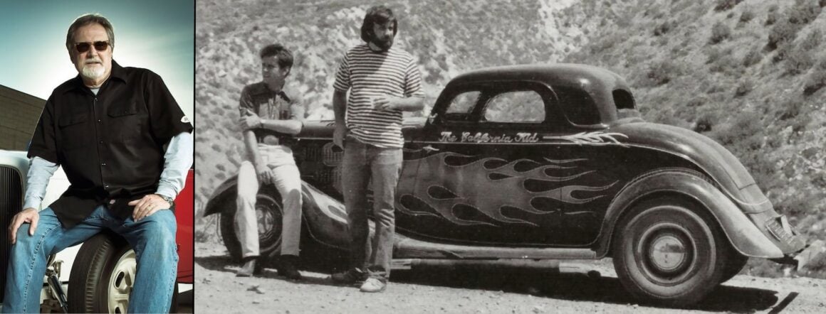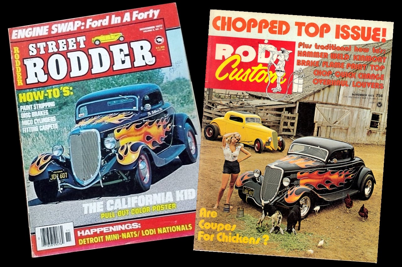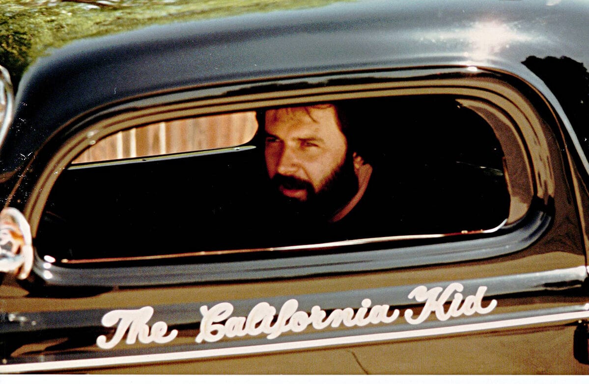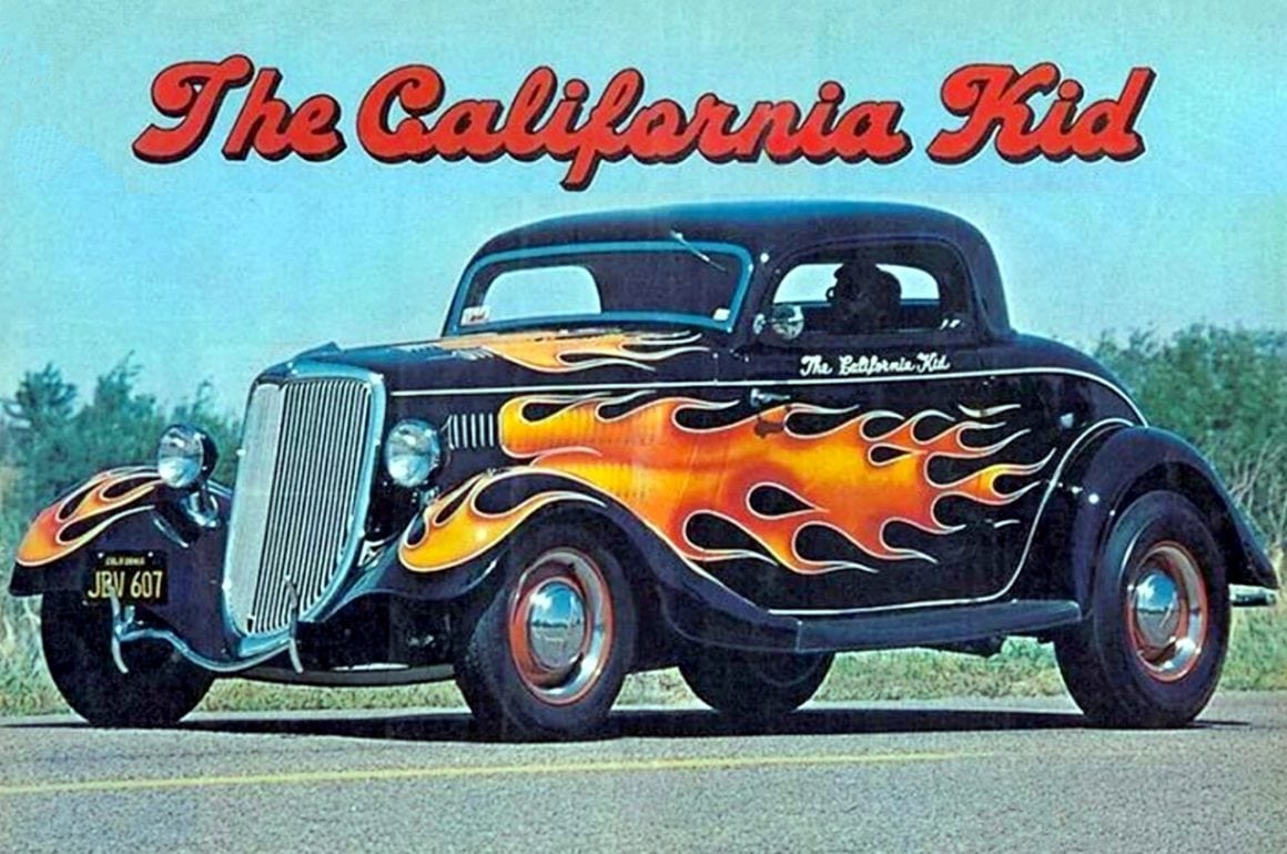 Pete Chapouris, le constructeur du Hot-Rod “The California Kid” (à qui l’on doit aussi celui de “American graffiti”) est né le 16 décembre 1942. Élevé dans la banlieue de Los Angeles, il a commencé à personnaliser des voitures dès ses 15 ans en’ 57. Après avoir travaillé à la fois comme technicien en dynamométrie et soudeur, Chapouris a connu un grand succès lorsque son coupé Ford 34 enflammé a été publié en couverture de novembre 1973 du magazine américain Rod&Custom, une mise en scène dans une ferme, aux côtés de la Ford jaune à deux portes de Jake Jacobs, entourée d’animaux en train de paître, c’était audacieusement estampillé : “Les coupes sont-elles pour les poulets ?”, l’image de couverture est devenue un classique instantané.