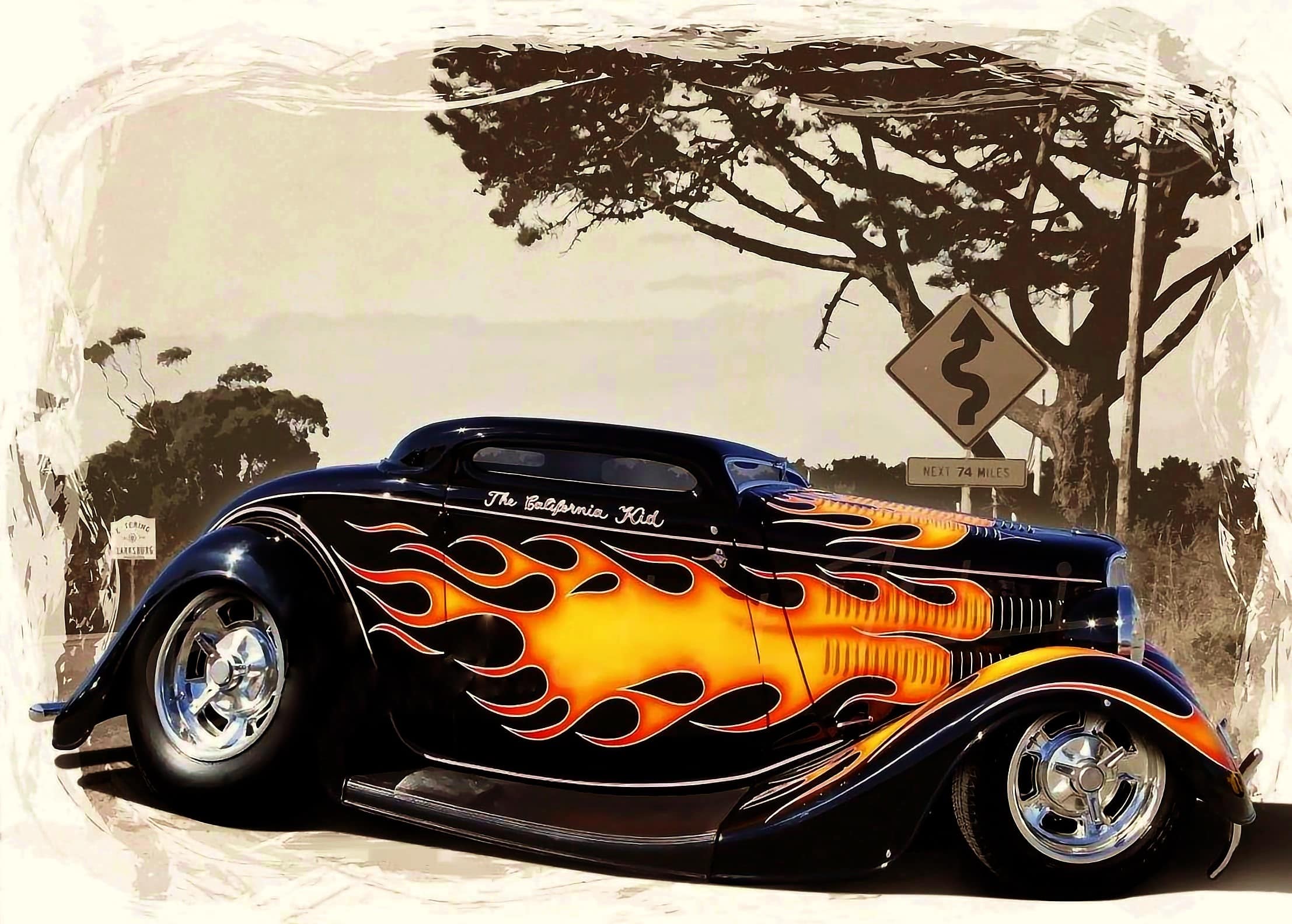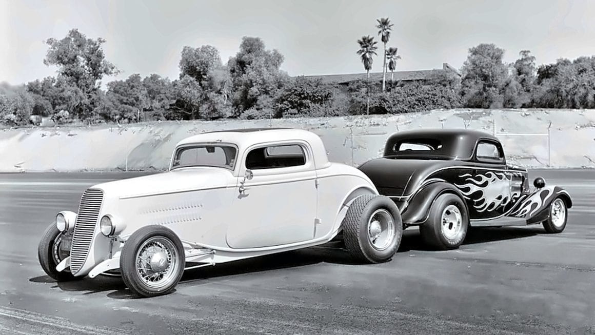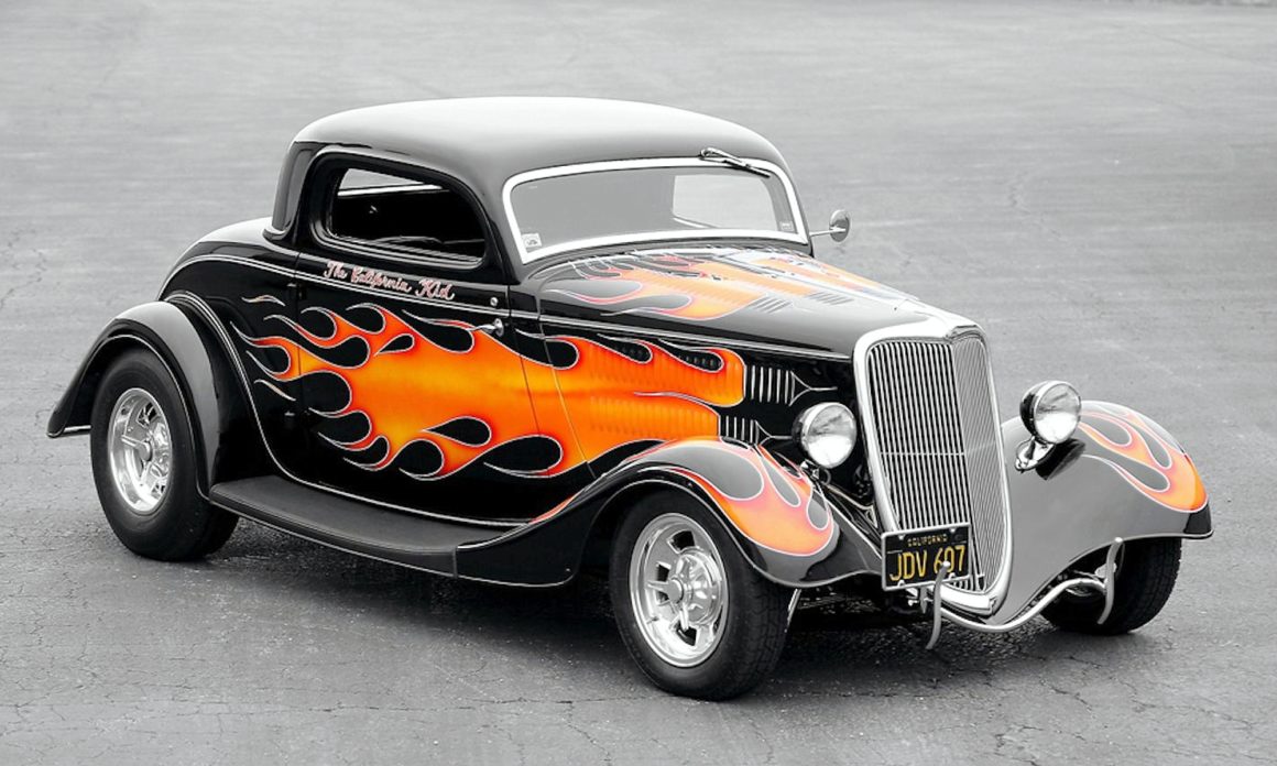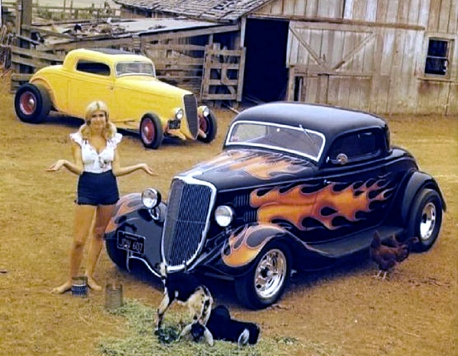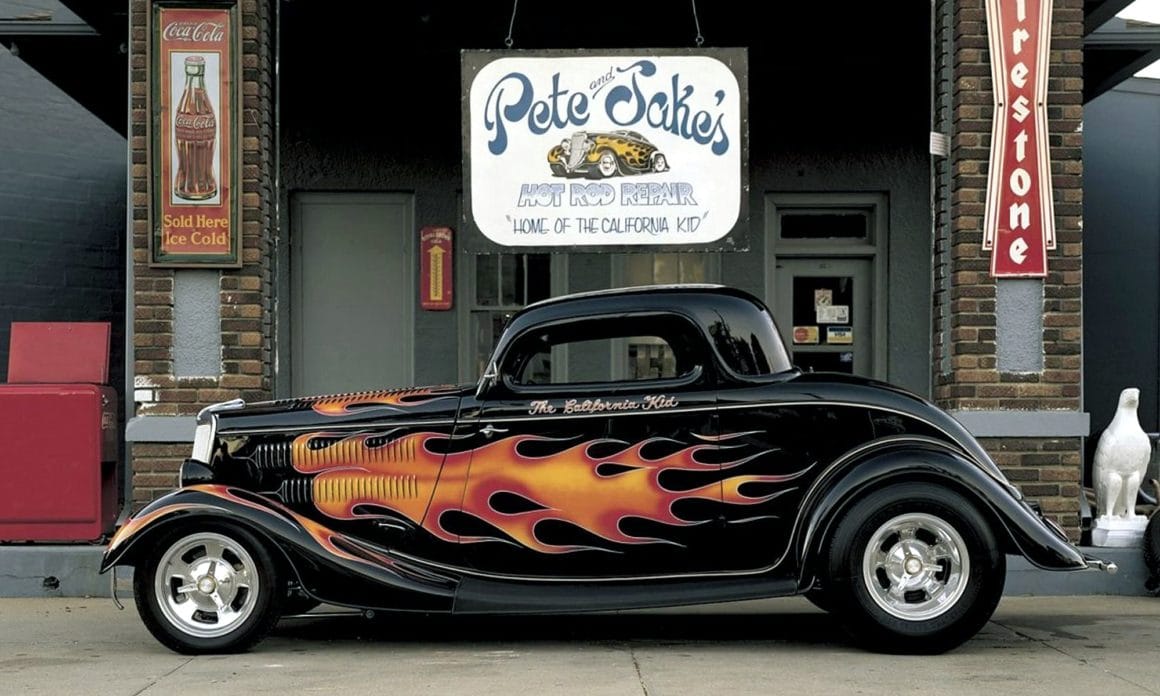 Pete Chapouris, le constructeur du Hot-Rod “The California Kid” (à qui l’on doit aussi celui de “American graffiti”) est né le 16 décembre 1942. Élevé dans la banlieue de Los Angeles, il a commencé à personnaliser des voitures dès ses 15 ans en’ 57. Après avoir travaillé à la fois comme technicien en dynamométrie et soudeur, Chapouris a connu un grand succès lorsque son coupé Ford 34 enflammé a été publié en couverture de novembre 1973 du magazine américain Rod&Custom, une mise en scène dans une ferme, aux côtés de la Ford jaune à deux portes de Jake Jacobs, entourée d’animaux en train de paître, c’était audacieusement estampillé : “Les coupes sont-elles pour les poulets ?”, l’image de couverture est devenue un classique instantané.