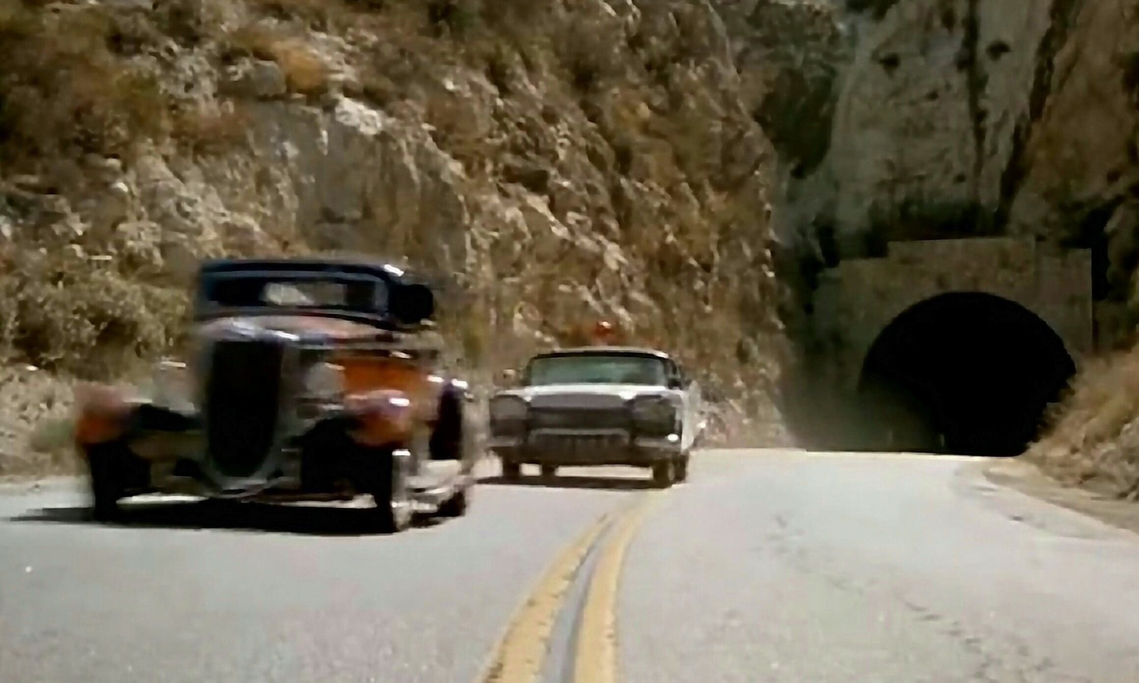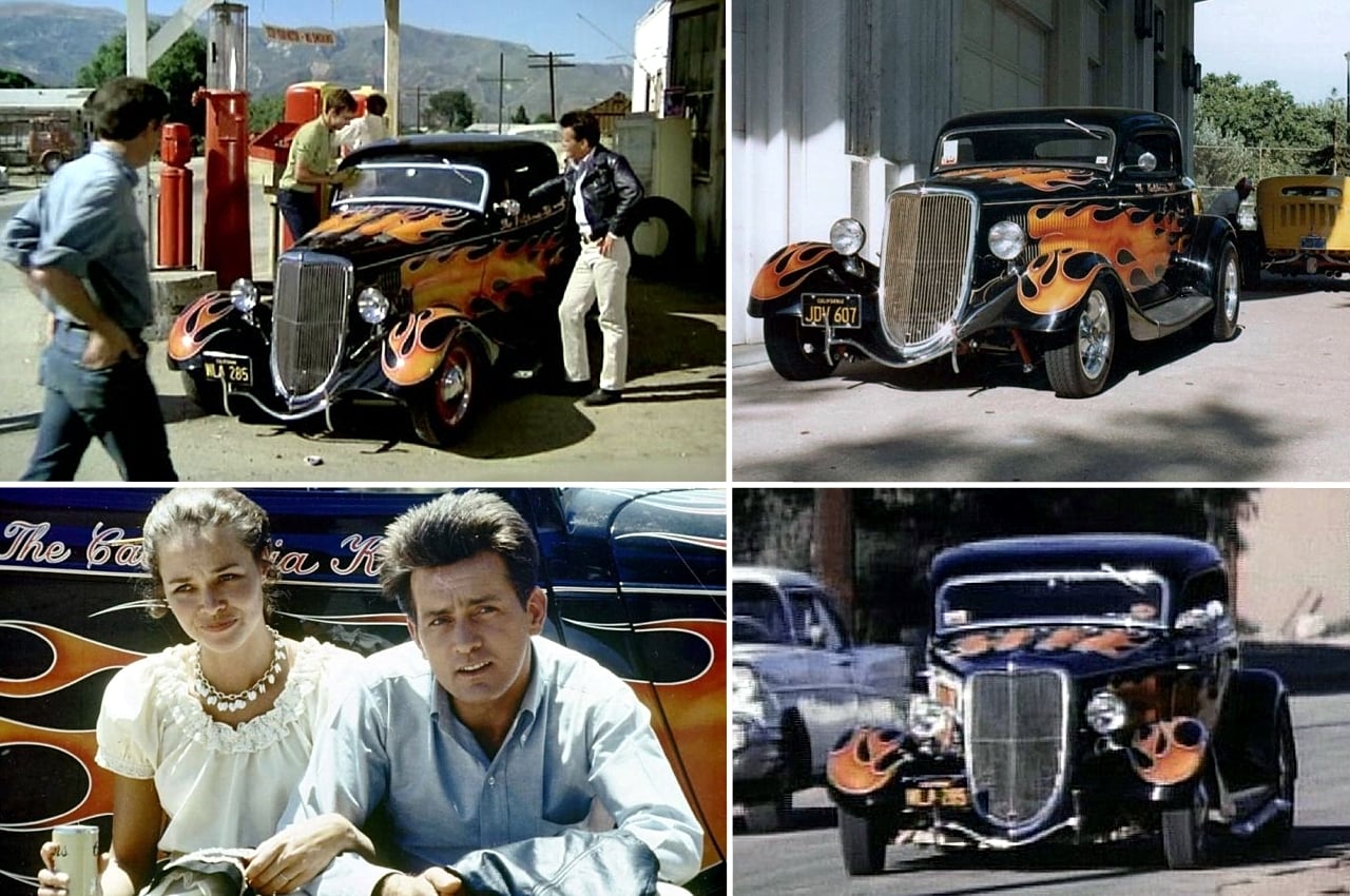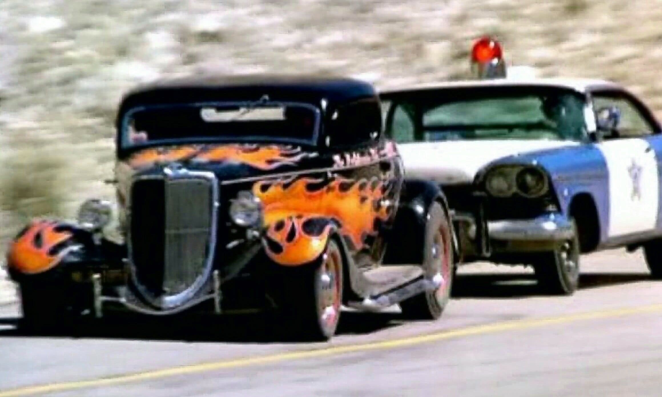 Juste au moment où ils traversent un tunnel sur la route à 2 voies, le shérif Roy sort de sa cachette dans sa Plymouth bleue et blanche, une boule de gomme rouge vif virevoltant sur le toit, dans la première de plusieurs poursuites en voiture qui font crisser les pneus, avant de “nerfer” la Ford hors de la route là ou est indiqué “Slow to 30 Dangerous Curve” et eux, comme les autres, dégringolent de la colline jusqu’à leur mort. Le shérif recule, sort, se tient au bord de la falaise, les mains sur les hanches et secoue la tête… Pffffff ! La scène suivante, sur la musique du générique d’ouverture et le générique du titre, se présente la star du film. Non, pas le California Kid qu’est Martin Sheen (alias Mike McCord), mais son coupé de 1934, au toit Top Choppé et aux flammes sauvages…