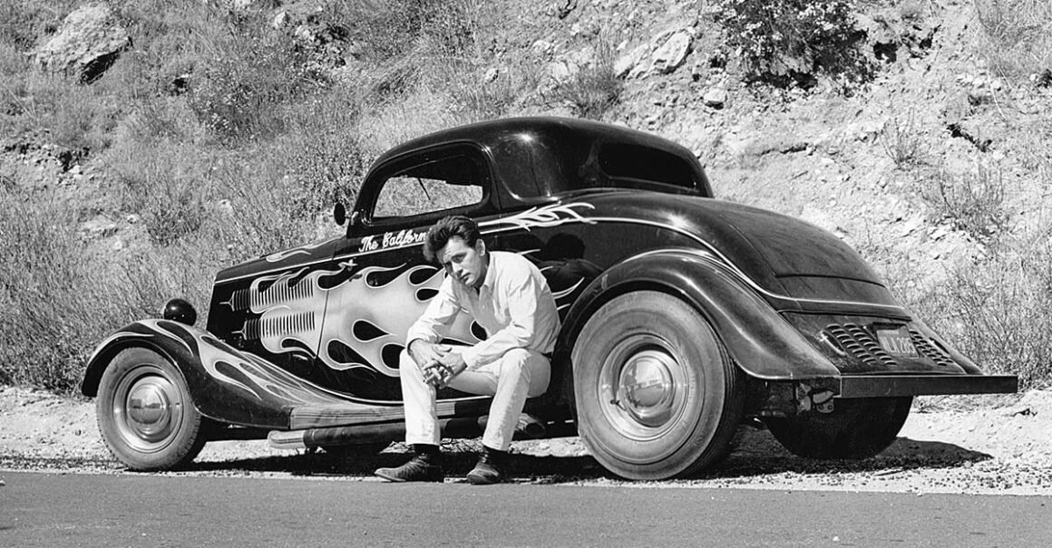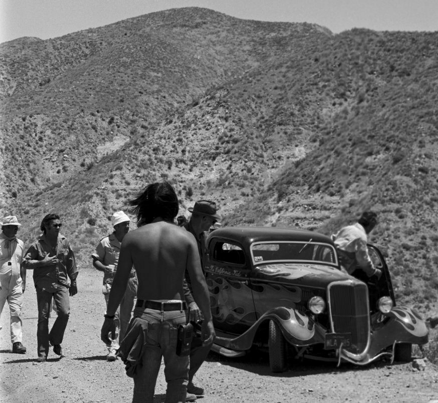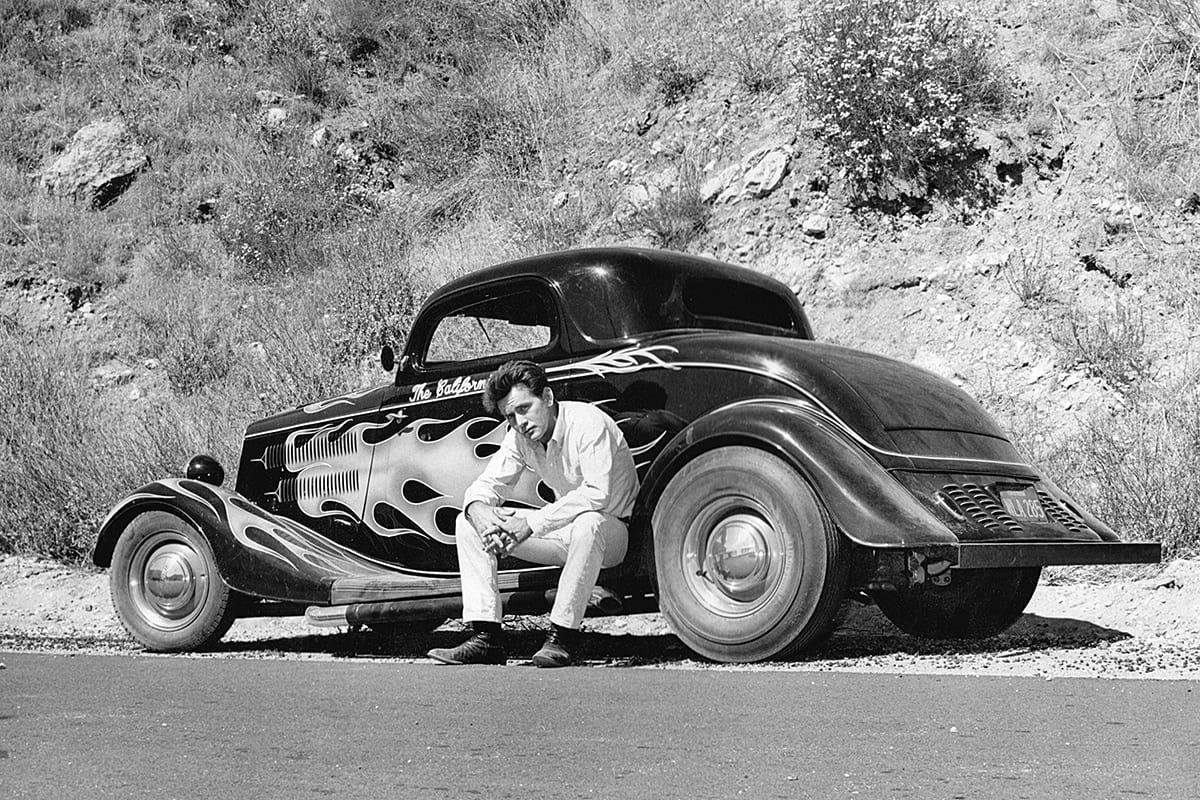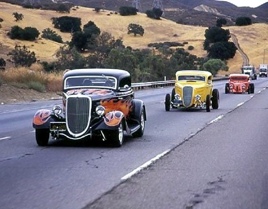 Juste au moment où ils traversent un tunnel sur la route à 2 voies, le shérif Roy sort de sa cachette dans sa Plymouth bleue et blanche, une boule de gomme rouge vif virevoltant sur le toit, dans la première de plusieurs poursuites en voiture qui font crisser les pneus, avant de “nerfer” la Ford hors de la route là ou est indiqué “Slow to 30 Dangerous Curve” et eux, comme les autres, dégringolent de la colline jusqu’à leur mort. Le shérif recule, sort, se tient au bord de la falaise, les mains sur les hanches et secoue la tête… Pffffff ! La scène suivante, sur la musique du générique d’ouverture et le générique du titre, se présente la star du film. Non, pas le California Kid qu’est Martin Sheen (alias Mike McCord), mais son coupé de 1934, au toit Top Choppé et aux flammes sauvages…