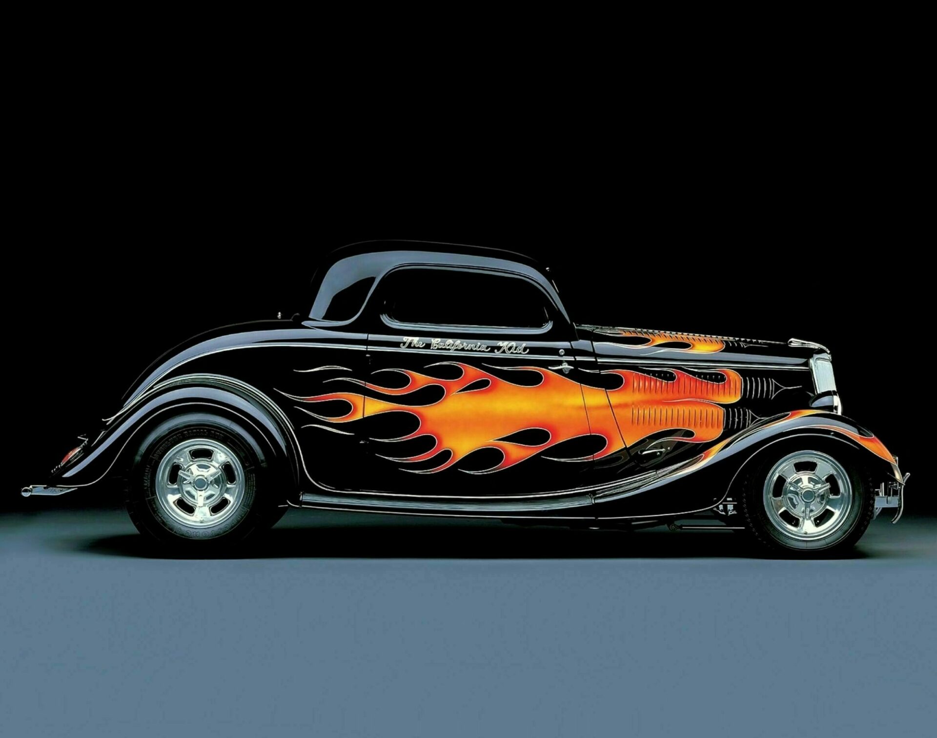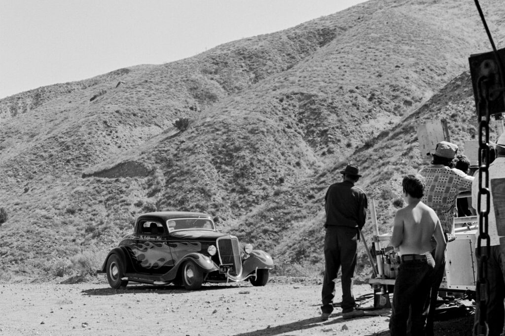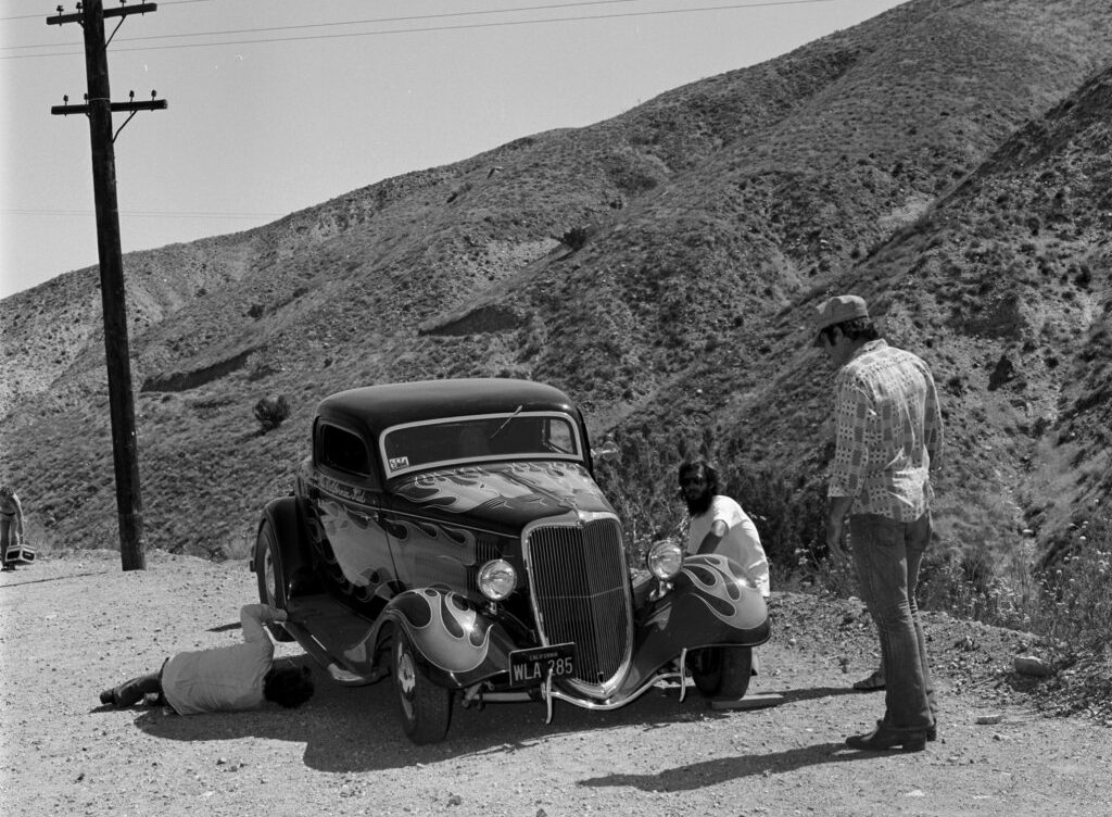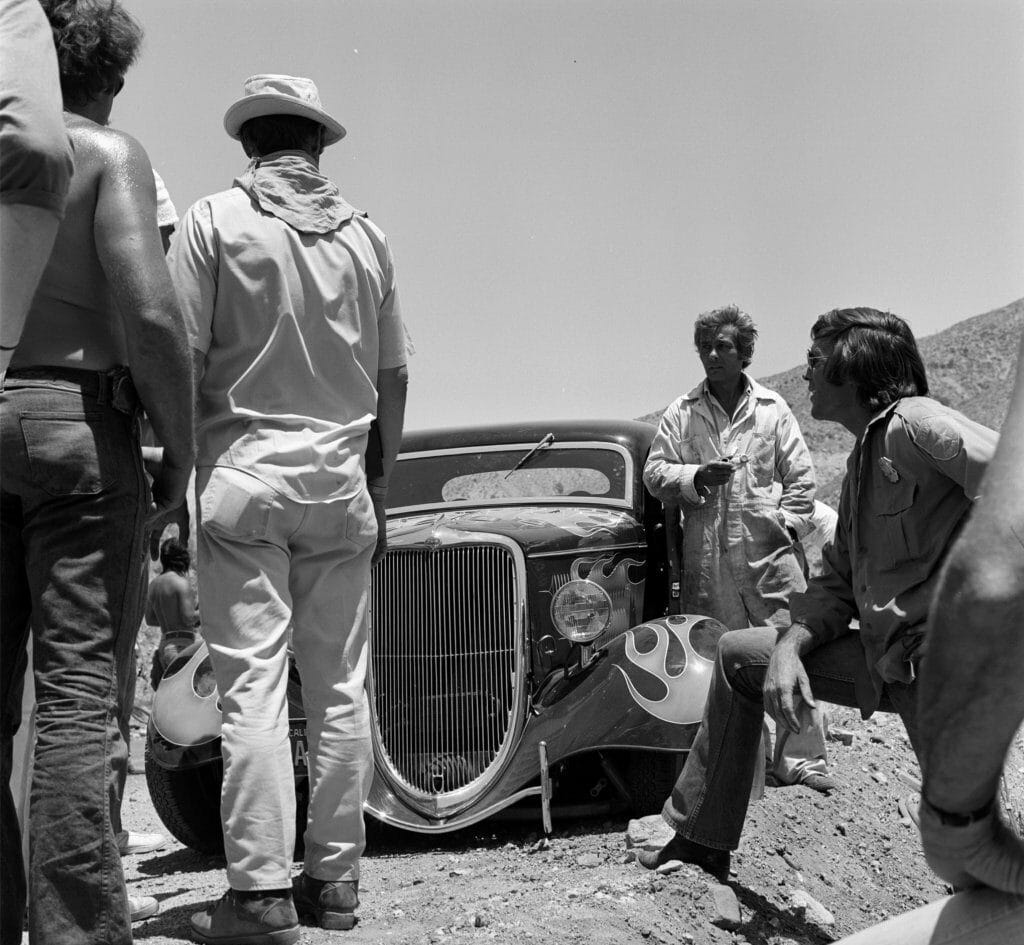 La bande-son pour le moteur du Coupé “The California Kid” provenait du rugissement guttural d’une puissante Corvette 7 litres. Remarquez que le Rod de “The California Kid” se présente comme disposant d’une boite manuelle 4 rapports alors qu’en réalité il s’agissait d’une boite automatique. Des tuyaux latéraux d’échappement avaient également été boulonnés en dessous des marchepieds pour le film (UUUghhh !)… Ils étaient faux, juste pour le look type Seventies… La “nerf-bar” arrière bien connue installée par Pete Chapouris a été supprimée pour le film et remplacée par un moche pare-chocs en tubes carrés pour que la scène finale ne détruise pas le beau pt’tit cul du Hot-Rod que vient taper la bagnole du Shériff…. Que du Cinéma !