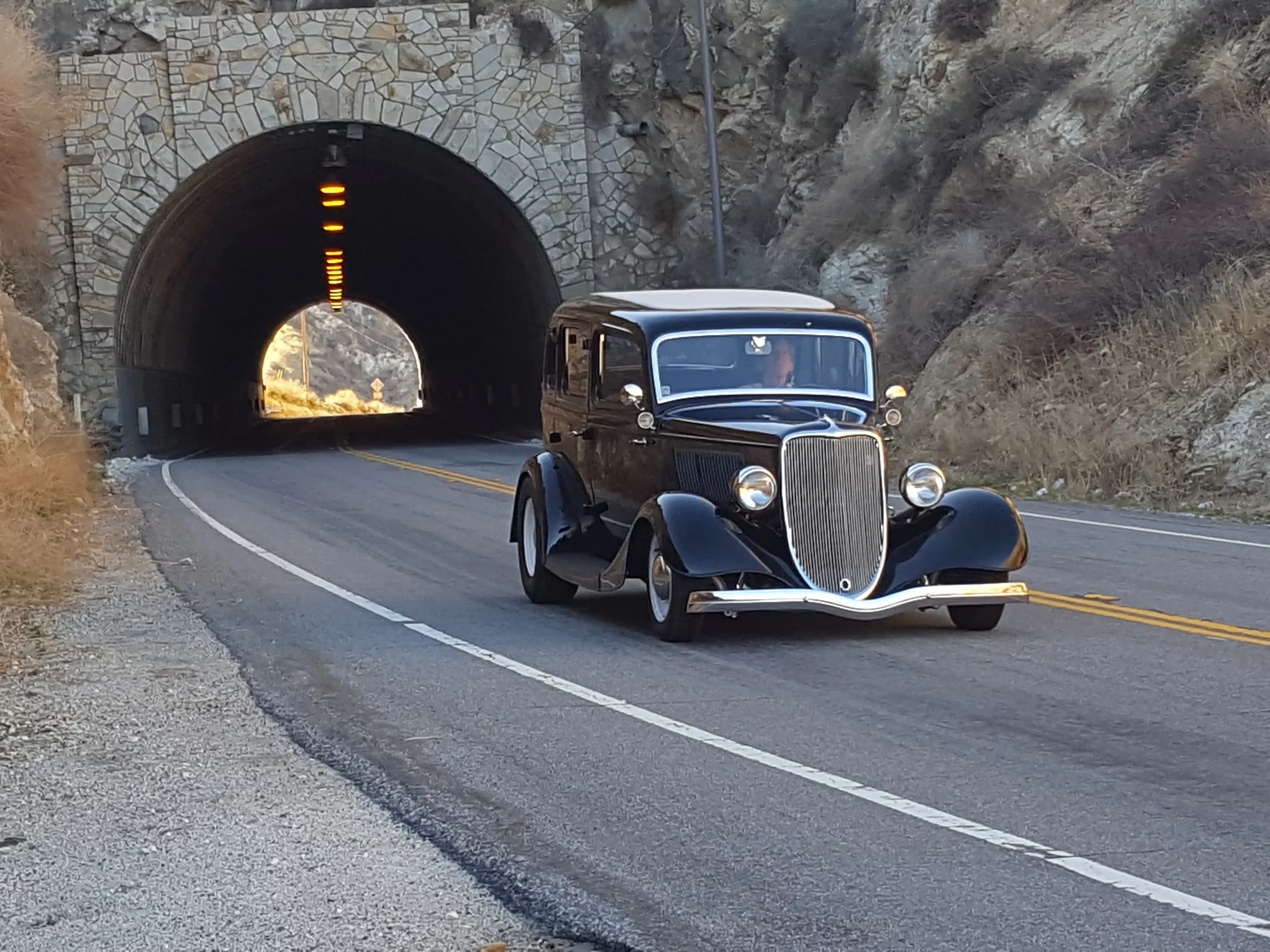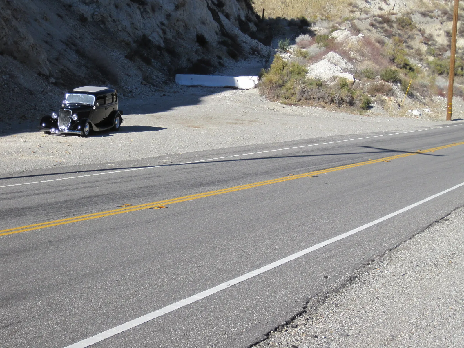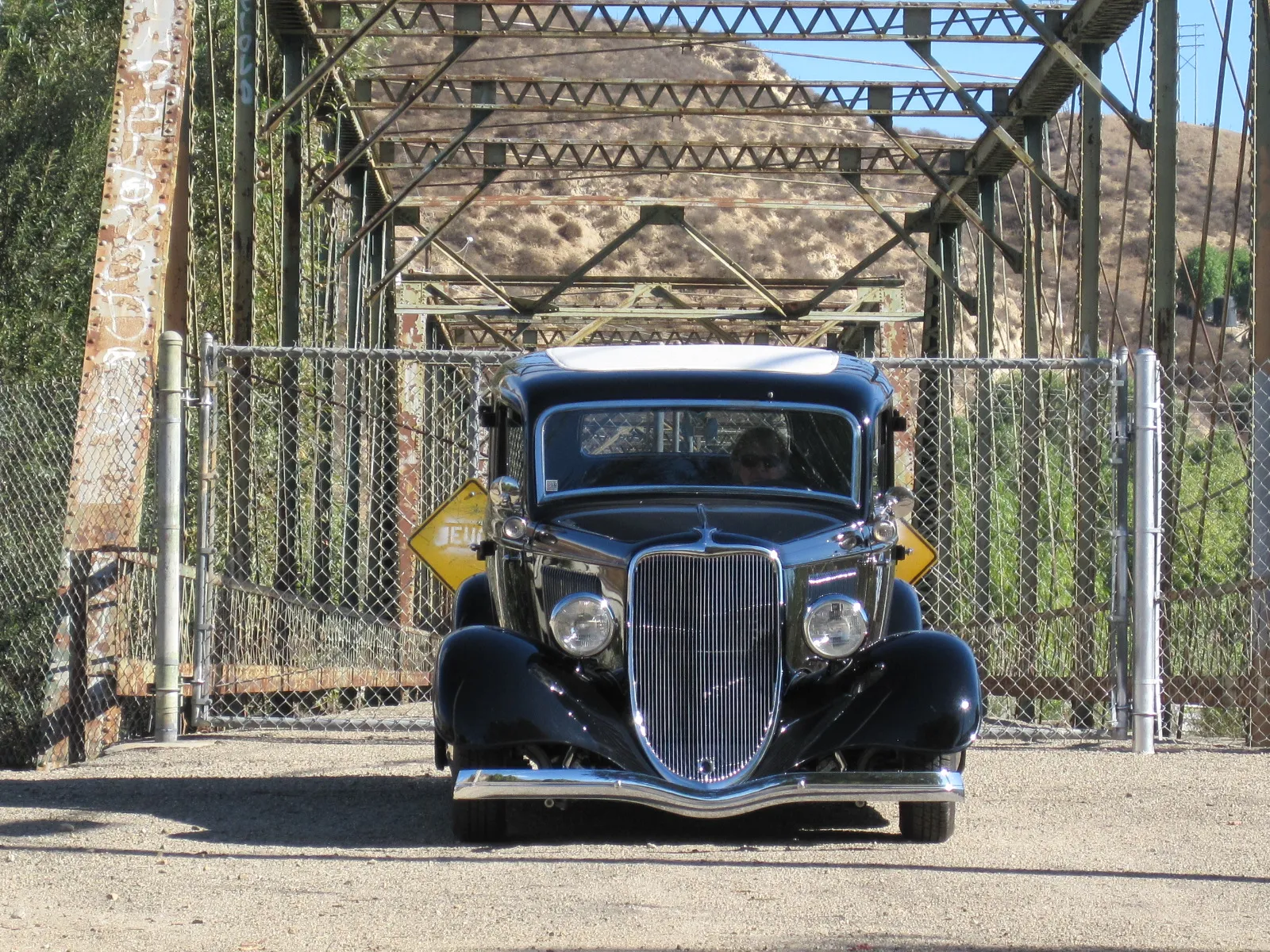 J’ai donc fait un petit détour par Piru juste parce que c’est amusant de visualiser les scènes du film et la poursuite sur la route de montagne chaparral, en particulier le tunnel, que j’ai pensé être sur l’ancienne Sierra Highway à travers Soledad Canyon, à l’est de l’I-5, que les Hot-Rodders utilisaient pour se rendre à Muroc et El Mirage bien avant qu’ils ne construisent l’autoroute 14…. Ouais mes Popu’s, j’ai habité tout un temps aux USA à l’époque de mes magazines TOPWheels et Chromes&Flammes, partie en Californie, à New York et en Floride ce qui ne me rajeuni pas… Piru, Californie, décor de “The California Kid” est maintenant clôturé, avec un nouveau pont juste à côté. Mais je n’ai pas pu résister à l’envie de poser la photo du haut… Bof !!!