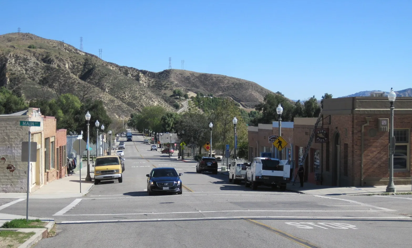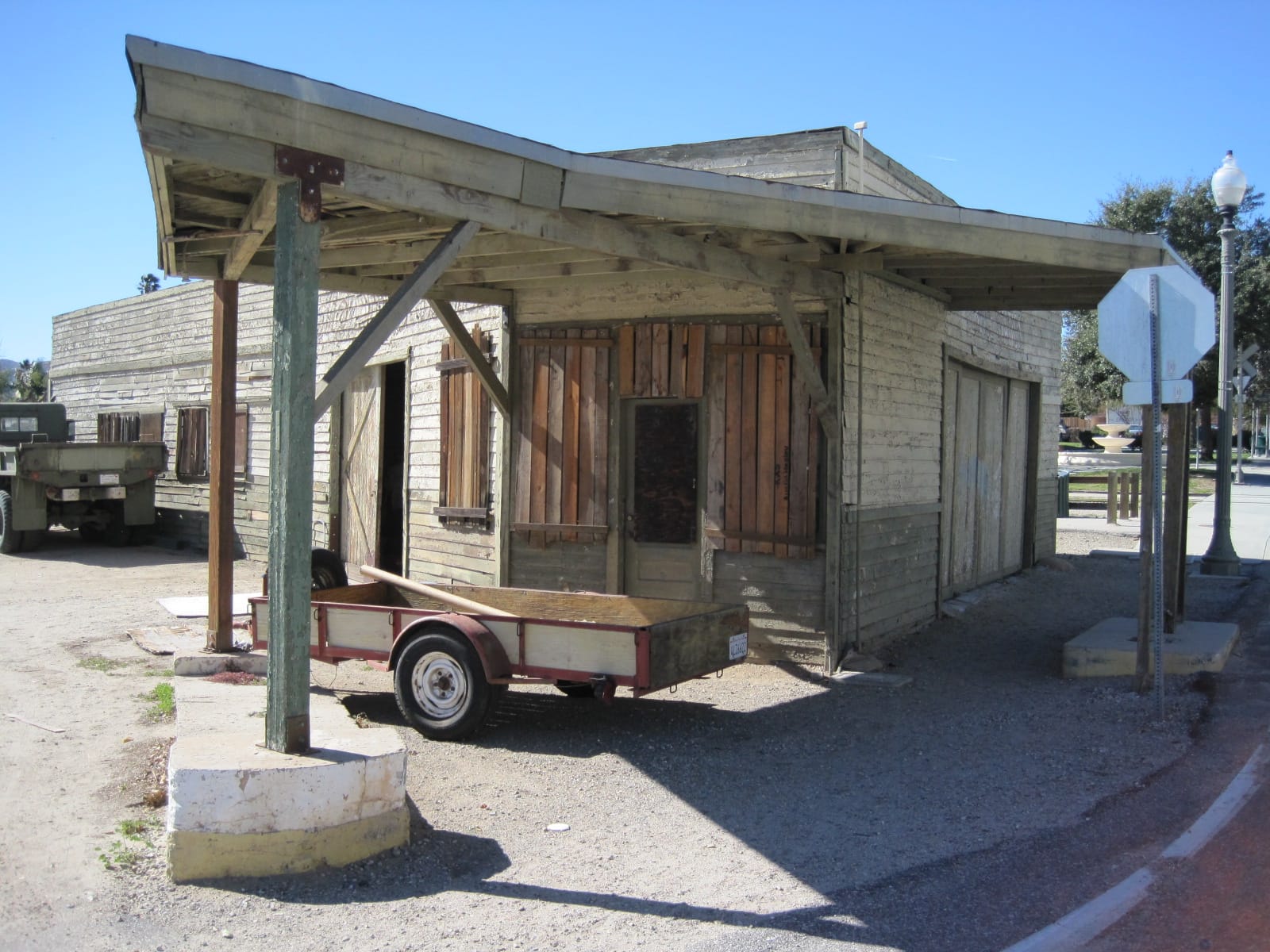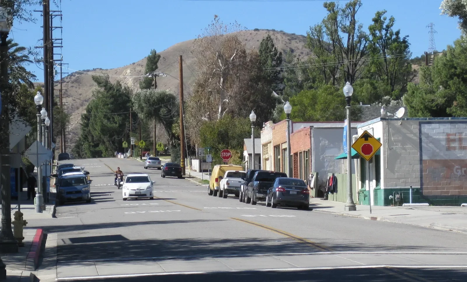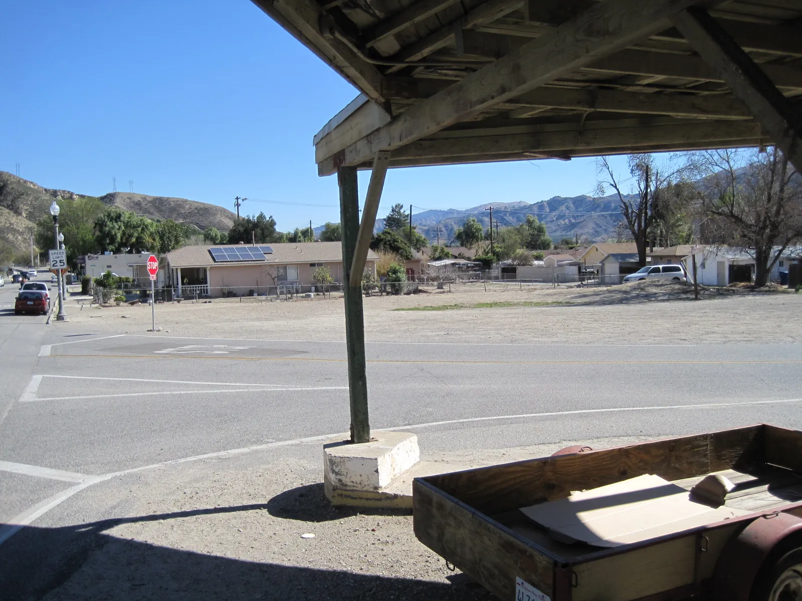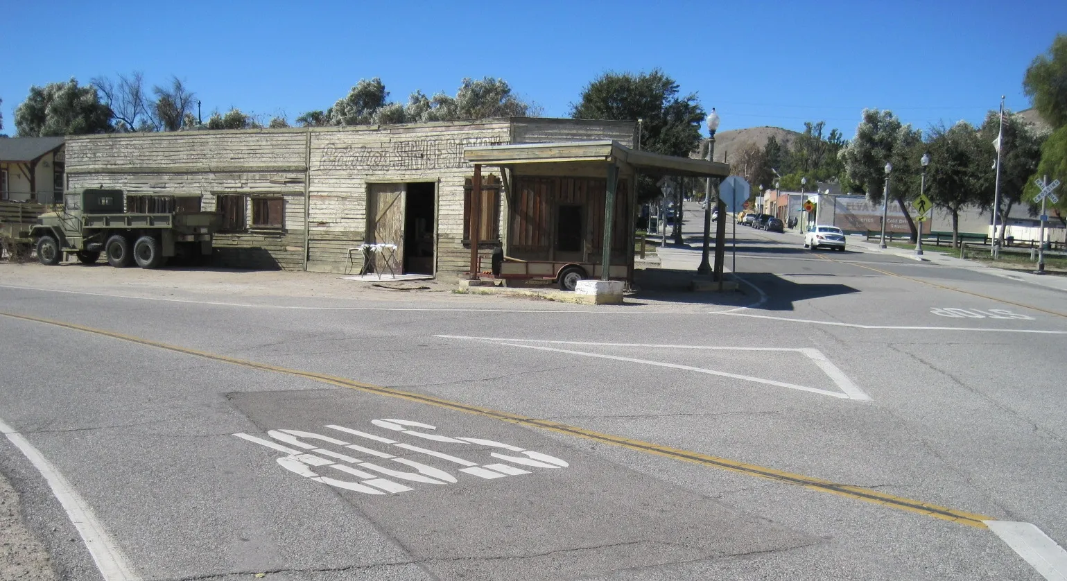 Et c’est essentiellement le centre-ville de Piru long d’un pâté de maisons dans lequel le Kid est entré après avoir quitté le pont et traversé la voie ferrée que vous voyez au premier plan. Le panneau d’arrêt est l’endroit où il a fait demi-tour pour rebrousser chemin. Tout d’abord, et c’est effrayant, il faut se rappeler que ce film a été réalisé il y a près d’un demi siècle alors que j’avais une vingtaine d’année… 74 ans actuellement ! Pfffffffffffff ! Toutes les scènes d’intérieur du tribunal et des bureaux de police ont été filmées aux studios Universal, à une cinquantaine de kilomètres de là. L’endroit où le shérif Roy arrête le Kid et lui donne une contravention pour avoir dépassé la limite de 3 mph à travers la ville, est juste après le pont où il y a encore des orangeraies aujourd’hui. Voilà… Je n’irai pas plus loin…