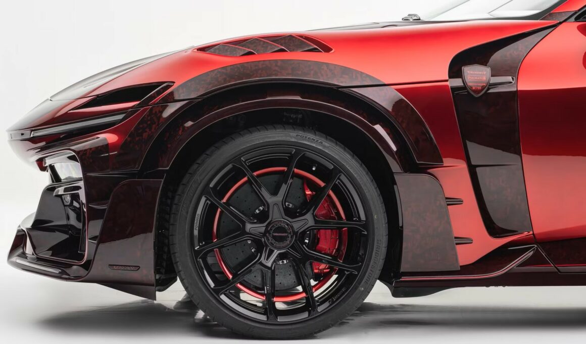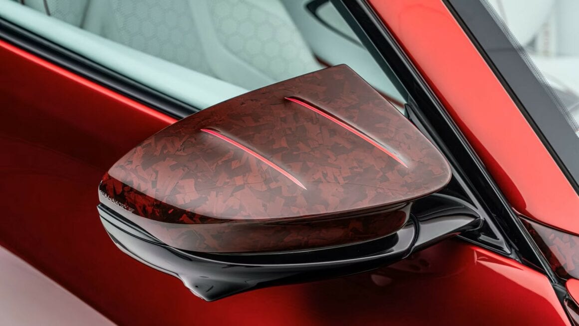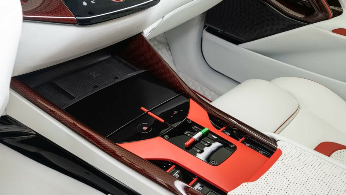 La peinture de cette chose est une teinte spéciale que Mansory appelle Vermillion. Elle met en valeur les parties en fibre de carbone exposées. Elle se retrouve même sur les pédales et accentue une grande partie de l’intérieur. D’autres couleurs sont toutefois disponibles, et Mansory est capable de faire presque tout ce que vous demandez.