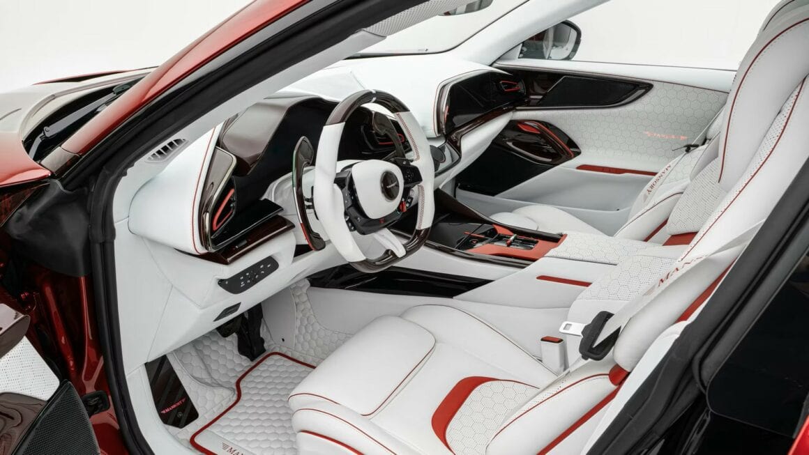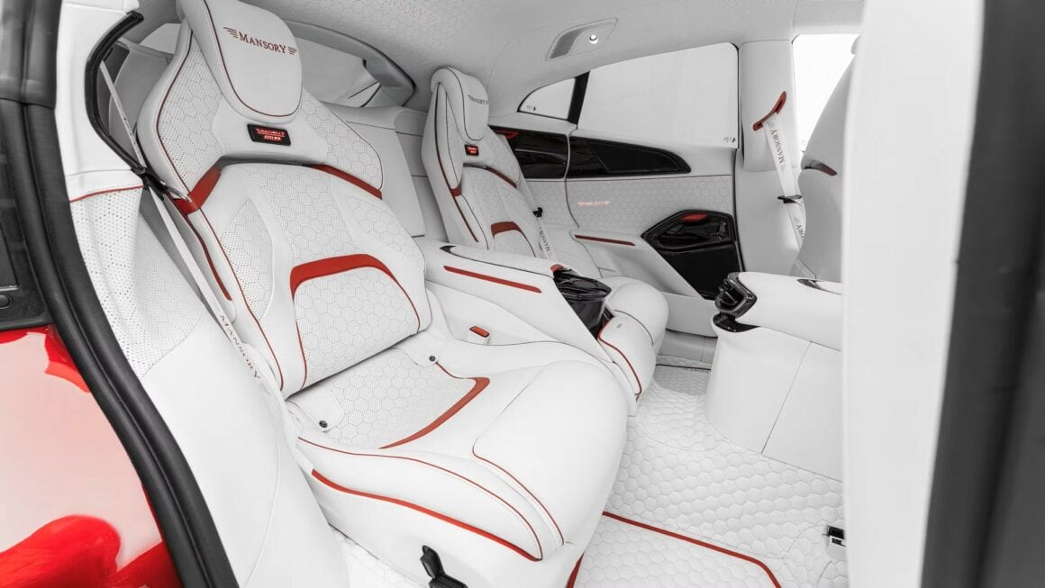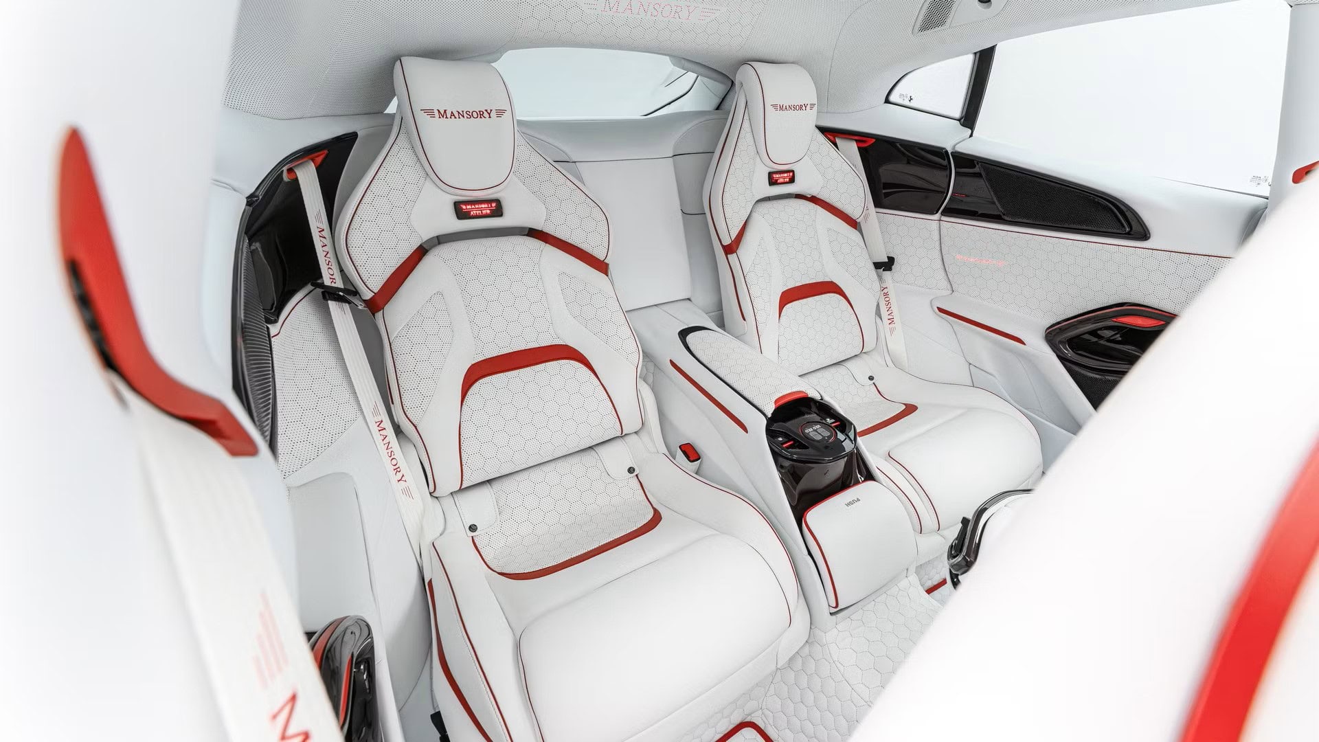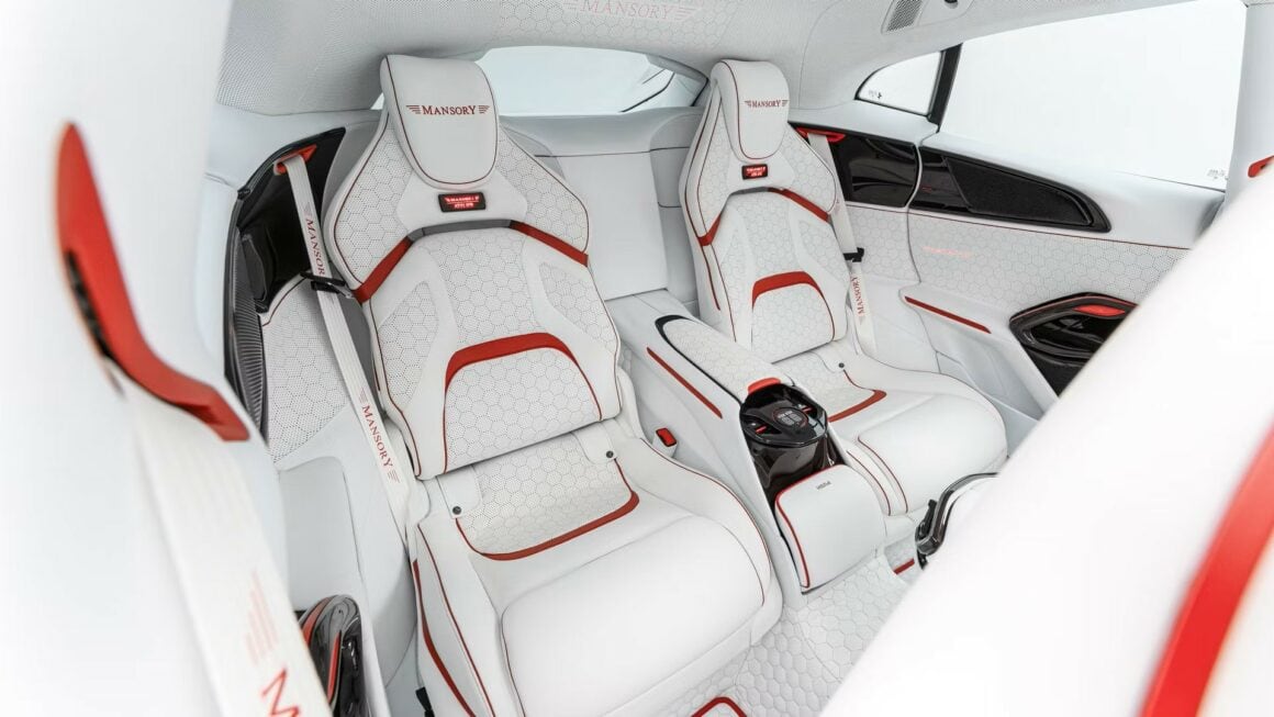 Cela suffit à la faire passer de 0 à 60 mph légèrement plus vite que les 3,3 secondes d’usine… Bien sûr, Mansory est également allé trifouiller à l’intérieur. Le cuir a été remplacé par un matériau spatial à thème complexe de perforations hexagonales qui s’étend sur presque tout l’habitacle. Le volant a été remplacé par un machin en carbone made in Mansory qui a badgé les sièges et brodé les ceintures.