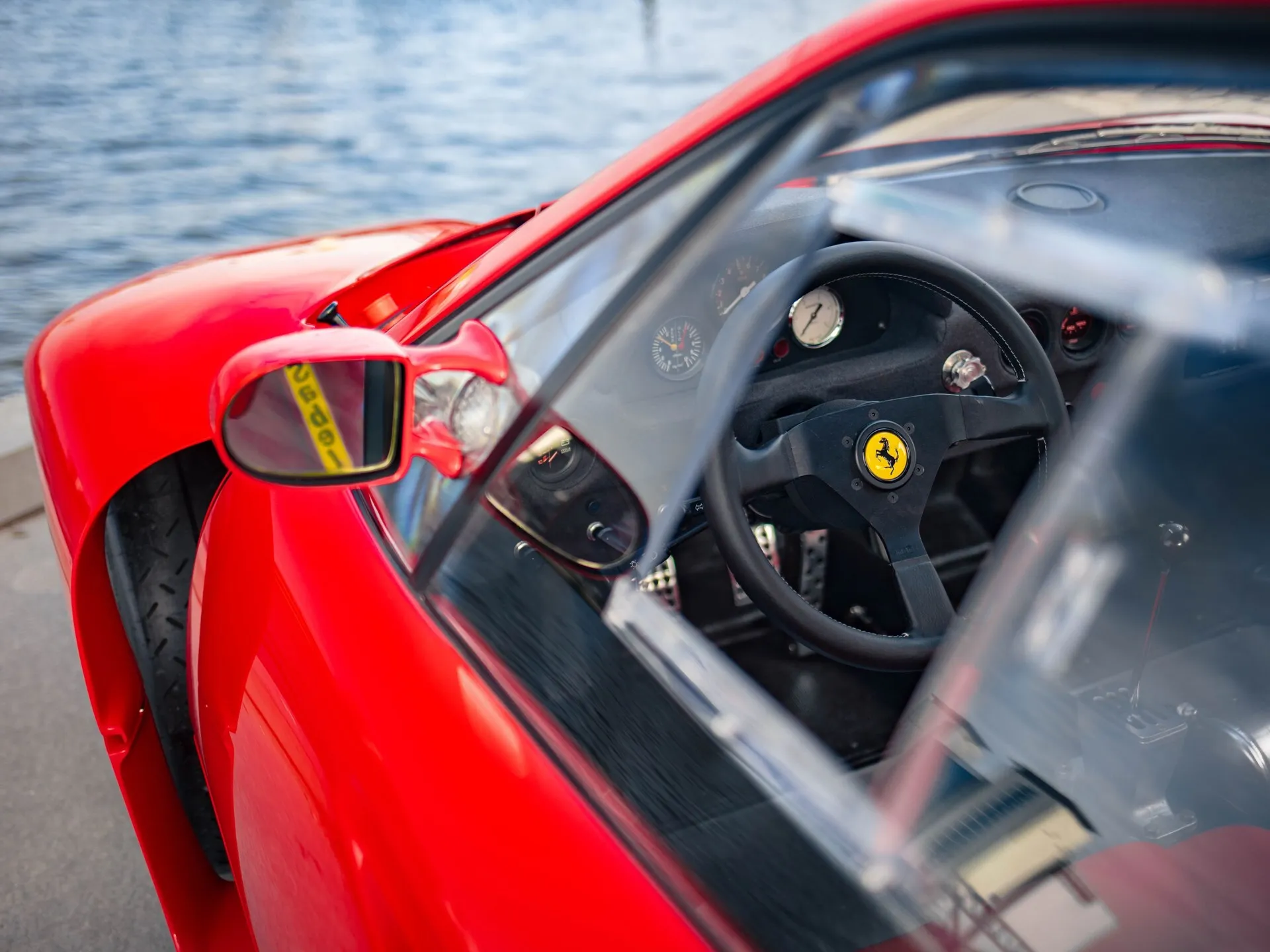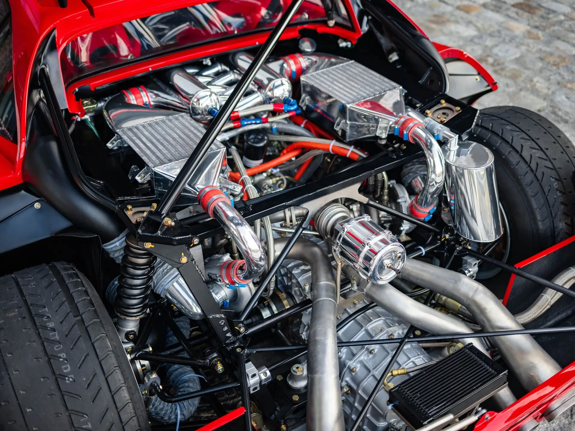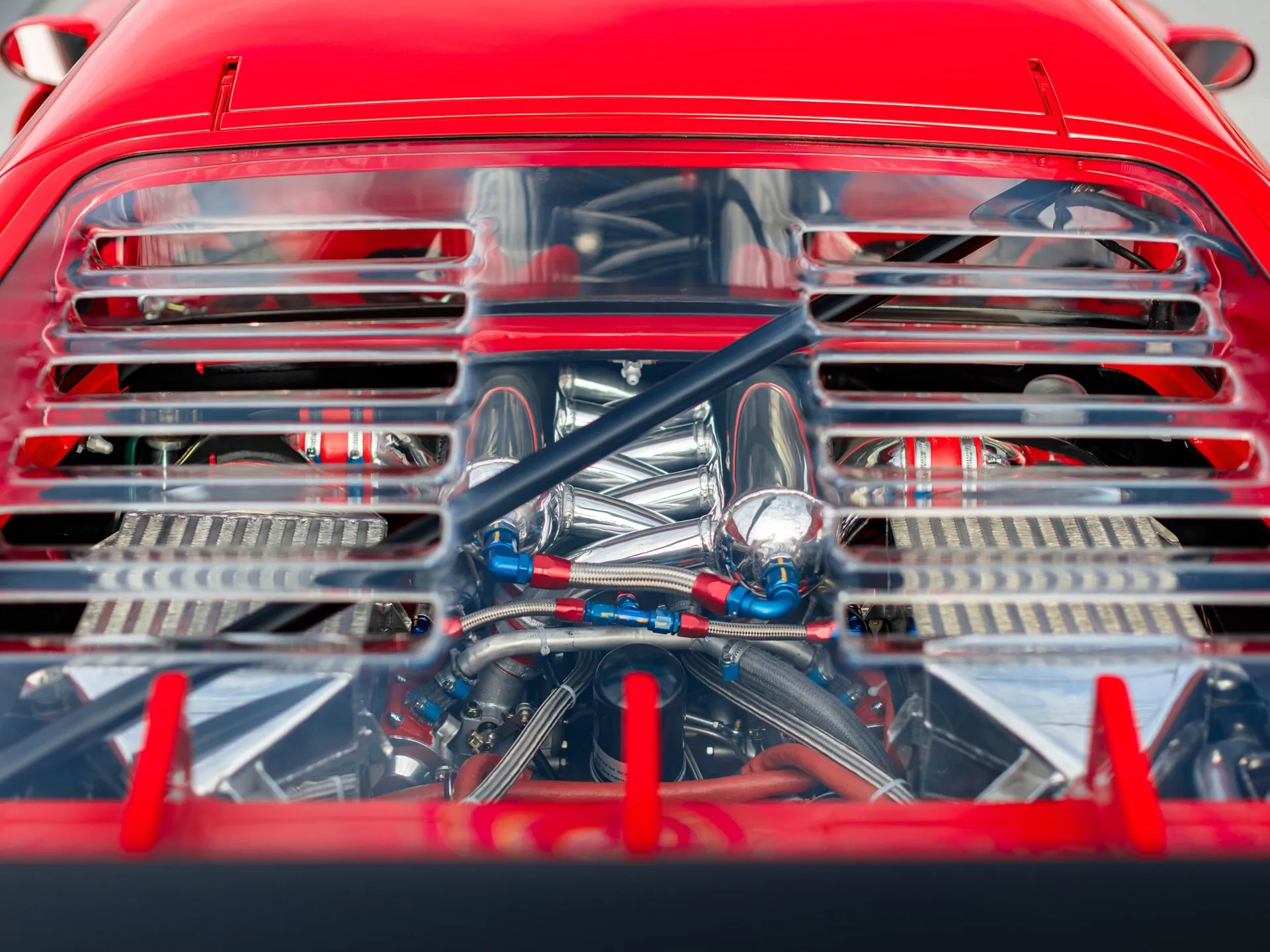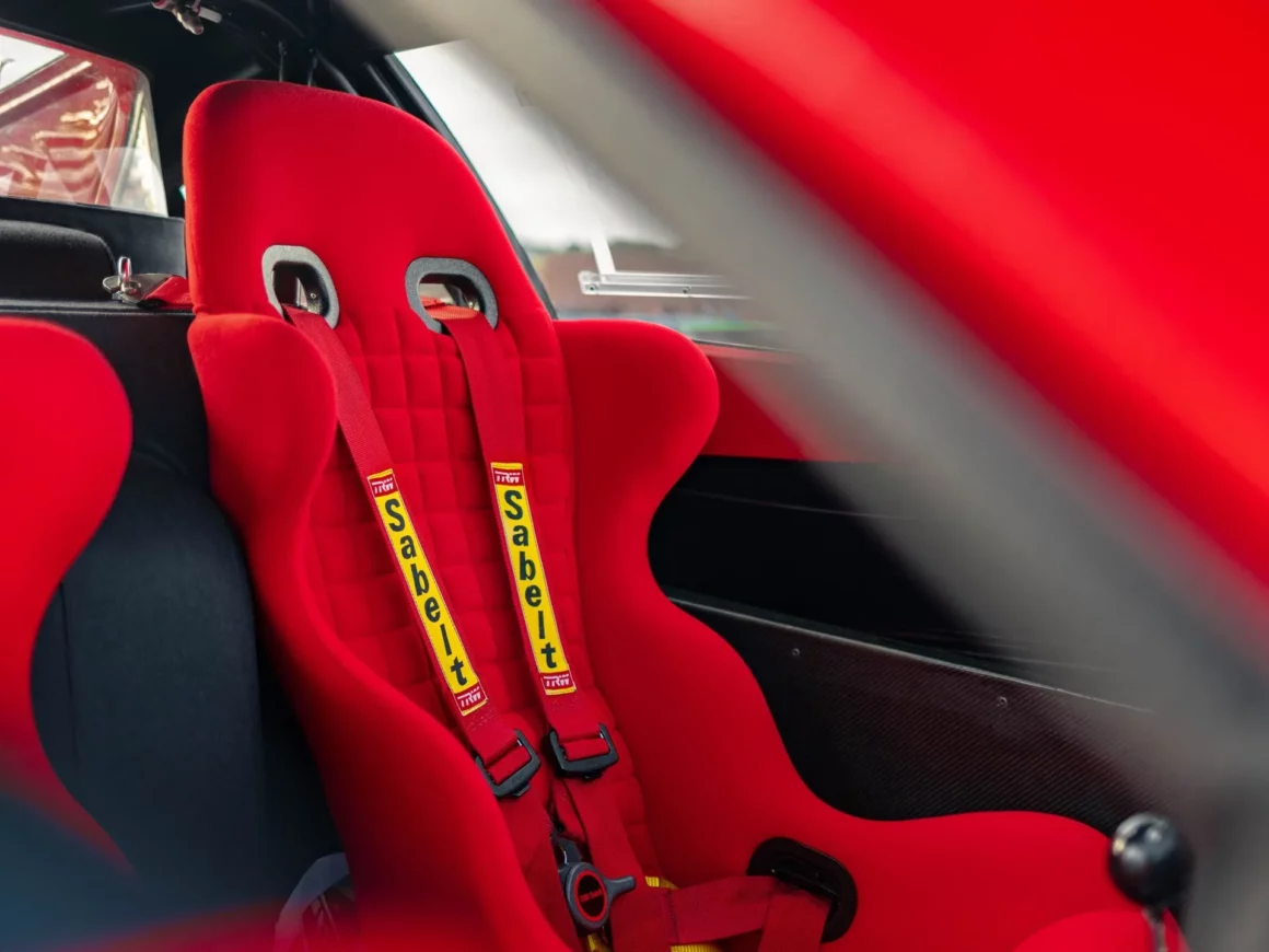 Les amortisseurs de suspension et les étriers de frein ont été révisés, ainsi que la pompe à eau et les deux turbos. De nouveaux pneus ont été montés et les quatre jantes changées tandis que la boîte de vitesses d’origine a également été révisée afin que tous les joints internes et l’arbre d’embrayage puissent être remplacés. Esthétiquement, la voiture a été entièrement repeinte dans la teinte Rosso Corsa d’origine, et les housses de tableau de bord, les housses de siège, les ceintures de sécurité, les vitres de porte et les vitres des rétroviseurs ont toutes été remplacées. Dans le compartiment moteur, le système d’admission et l’échangeur de chaleur ont été polis, tandis que les couvercles de culasse ont été repeints.
