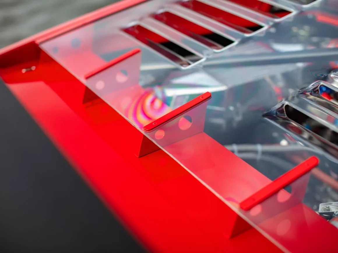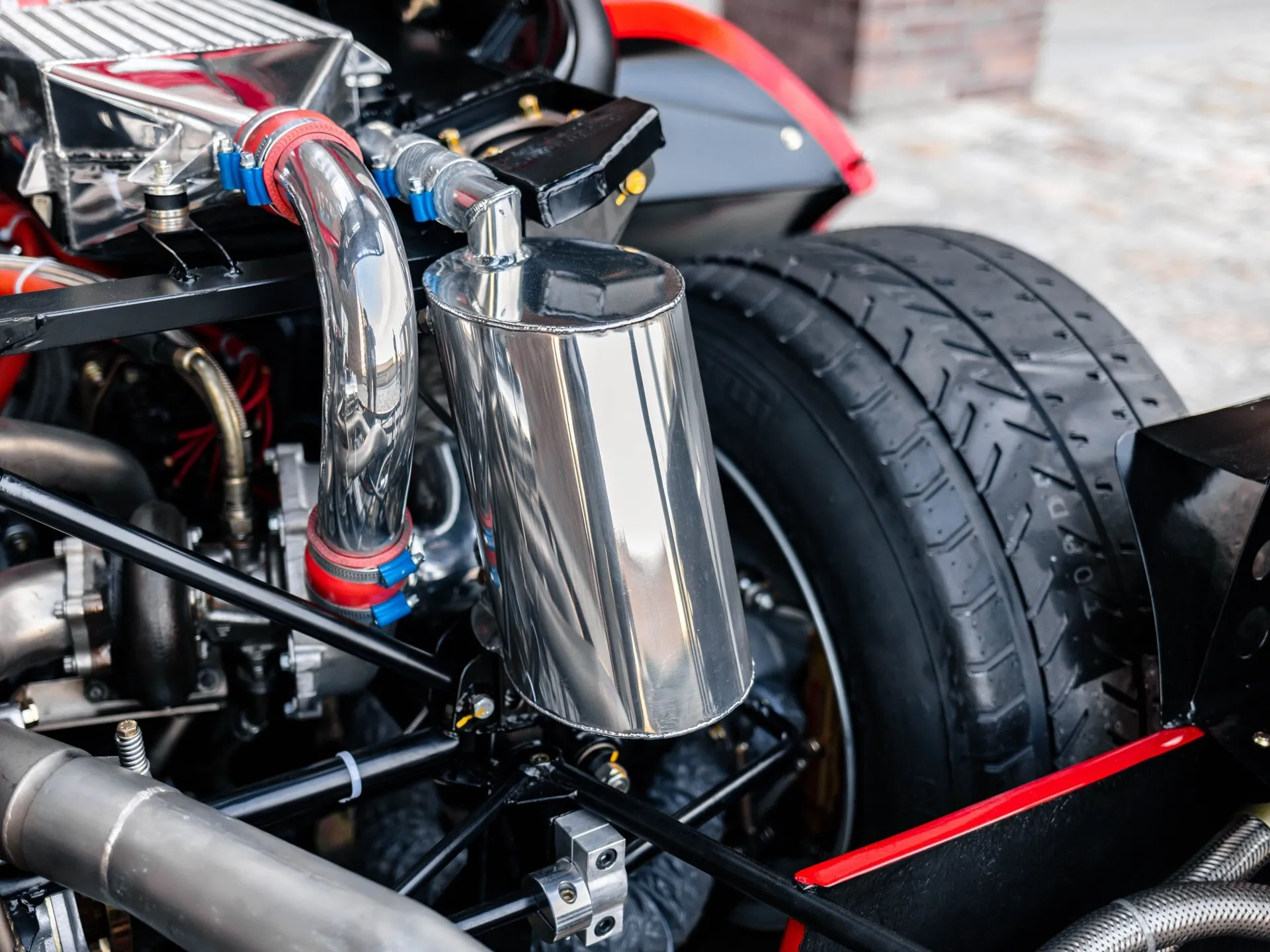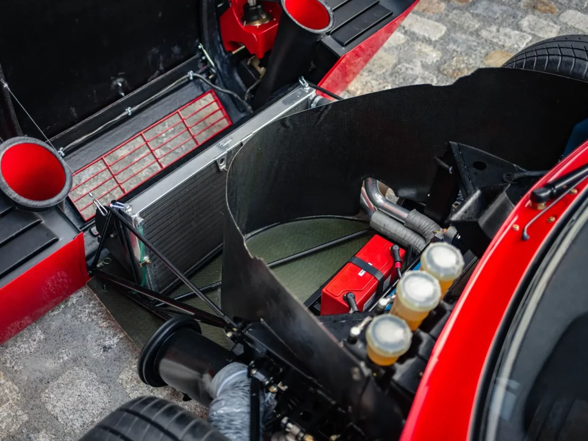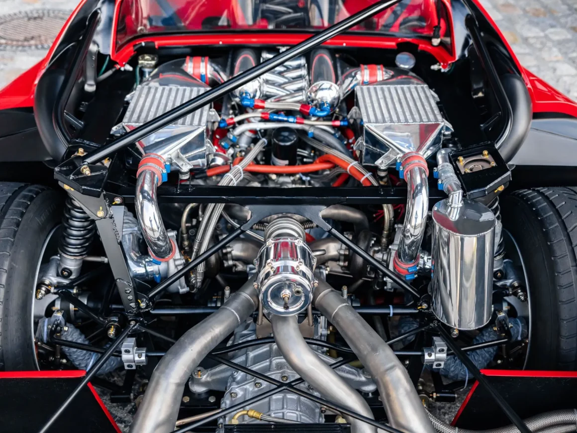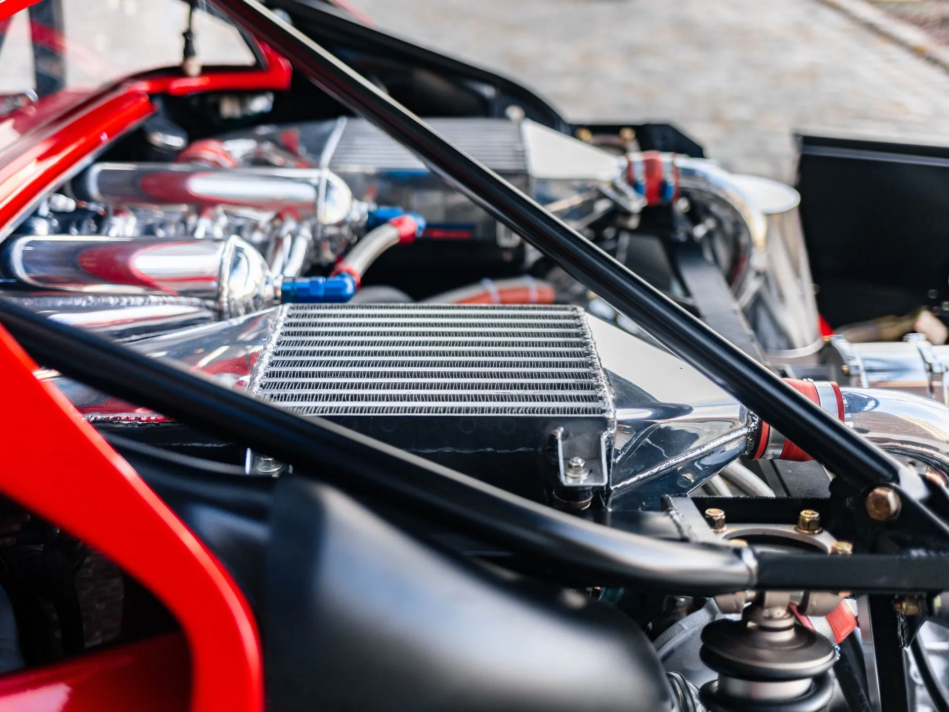 Les amortisseurs de suspension et les étriers de frein ont été révisés, ainsi que la pompe à eau et les deux turbos. De nouveaux pneus ont été montés et les quatre jantes changées tandis que la boîte de vitesses d’origine a également été révisée afin que tous les joints internes et l’arbre d’embrayage puissent être remplacés. Esthétiquement, la voiture a été entièrement repeinte dans la teinte Rosso Corsa d’origine, et les housses de tableau de bord, les housses de siège, les ceintures de sécurité, les vitres de porte et les vitres des rétroviseurs ont toutes été remplacées. Dans le compartiment moteur, le système d’admission et l’échangeur de chaleur ont été polis, tandis que les couvercles de culasse ont été repeints.