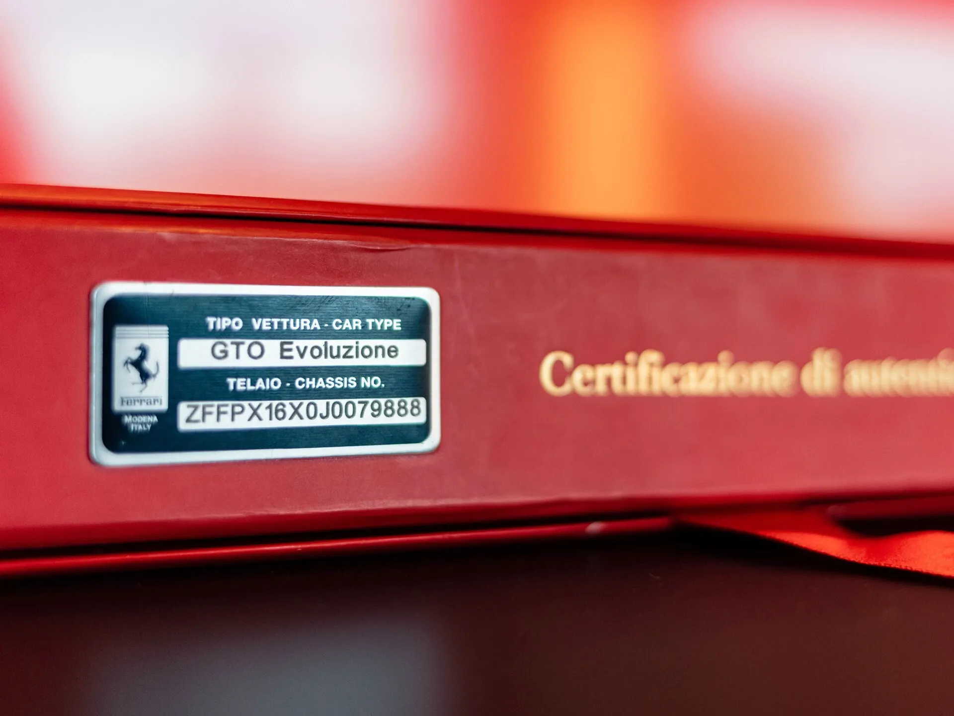Au cours de 1985, 5 exemplaires 288 GTO Evoluzione ont été construits afin de les déployer dans les courses ouvertes en groupe B. L’interdiction de cette catégorie pour des raisons de sécurité, depuis 1987, a persuadé Ferrari de les transformer en voitures de laboratoire. Les changements comprenaient une forme nouvelle aérodynamique pour l’armature de trame et l’éclaircissement des interventions de carrosserie (avec la masse totale réduite à 940 kg) et le traitement du moteur (stimulé à 650 hp grâce à l’utilisation de turbocompresseurs plus grands, des pistons redessinés et autres ajustements) : à la suite de ces mesures, la vitesse maximale est montée à environ 360 km/h très proche des prototypes qui ont dominé la scène dans les années suivantes !