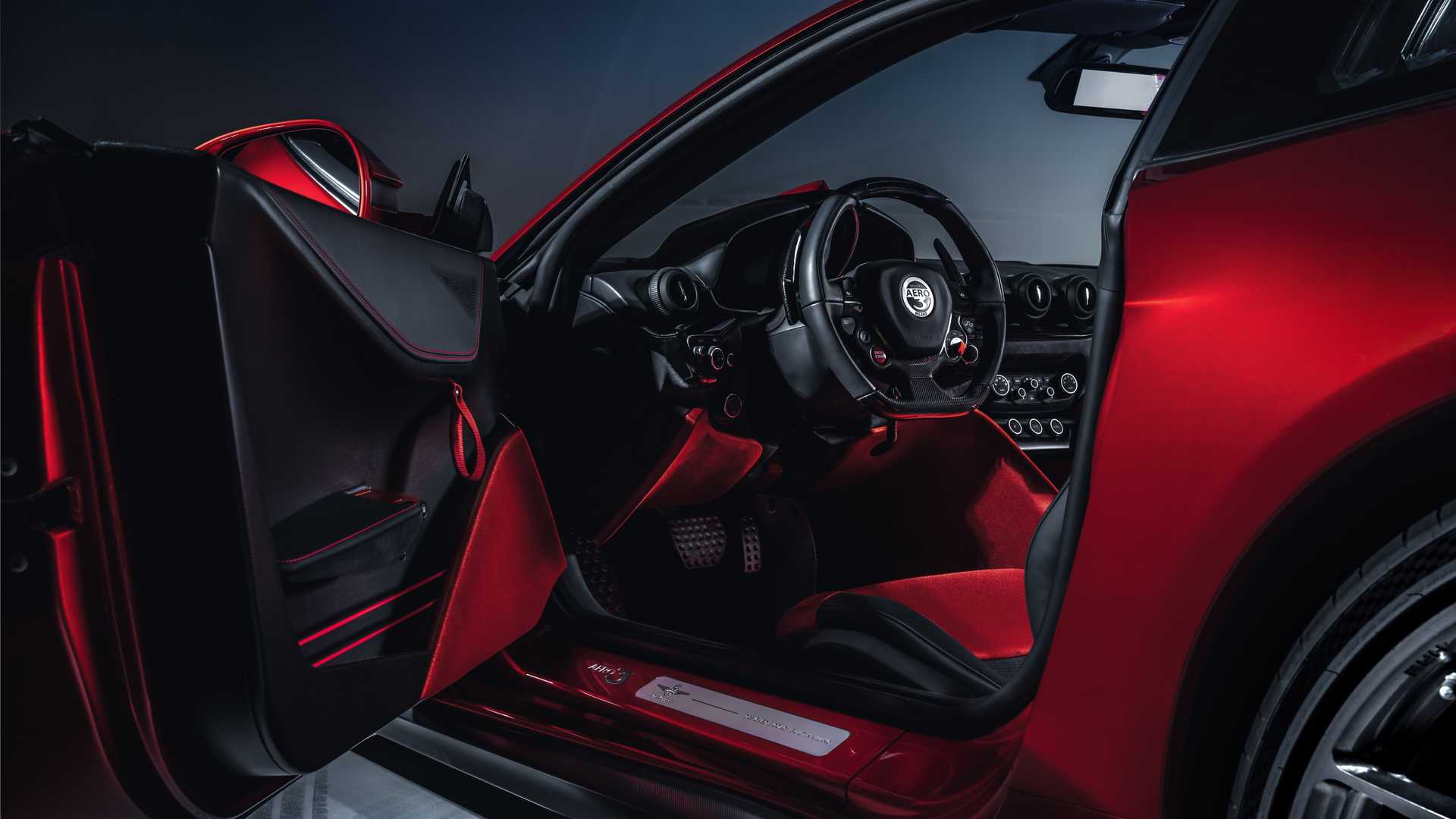 Tout cela en plus de la garniture en fibre de carbone requise, l’extérieur Alfaquesque de l’Aero 3 préserve les proportions des Alfa de course d’avant-guerre : long capot, cabine à l’arrière. Cependant, toutes les Aero 3 ne feront pas de cosplay en tant que Vintage ; Touring a fourni des images d’un autre Aero 3 pour illustrer les changements cosmétiques disponibles pour les clients exigeants : incluant des mesures d’angle pour l’aileron arrière inscrites sur l’aileron ; le délicat badge “Superleggera” sur le capot, les bouchons d’essence surélevés et les embouts d’échappement rectangulaires aux dimensions généreuses.