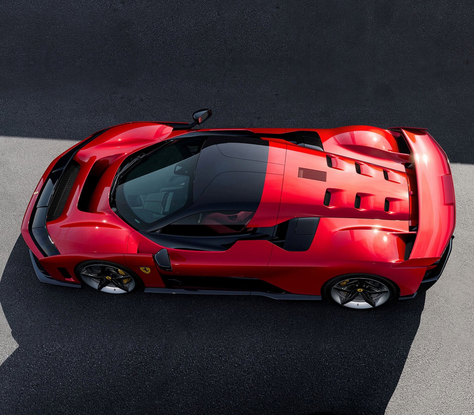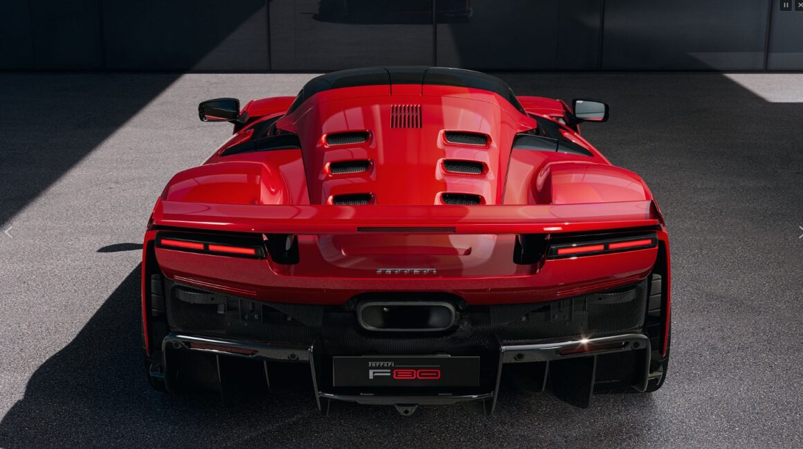 La carrosserie de la Ferrari F80 est entièrement fabriquée en fibre de carbone pré-imprégnée, créée de la même manière que les voitures de Formule 1, et la F80 est livrée avec des “portes papillons” similaires à celles vues sur la “LaFerrari”, avec un mécanisme de charnière à double axe de rotation leur permettant de s’ouvrir verticalement à un angle de près de 90°, et tout comme le reste de la carrosserie, ces portes sont fabriquées en fibre de carbone haute performance pour devenir une partie structurelle de la carrosserie en cas de choc latéral lors d’un accident, de plus le capot moteur arrière s’inspire du style de la porte, avec six bouches d’aération pour permettre à l’air chaud du moteur V6 de s’échapper, avec une calandre supplémentaire pour évacuer encore plus d’air… La F80 a des références claires à l’aérospatiale dans sa conception globale pour obtenir un impact futuriste dans son look, défini par une section transversale dièdre avec ses deux coins inférieurs clairement posés sur les roues tandis que la vue latérale s’accompagne d’un flux visuel qui montre l’importance de l’aileron arrière massif sur la F80….