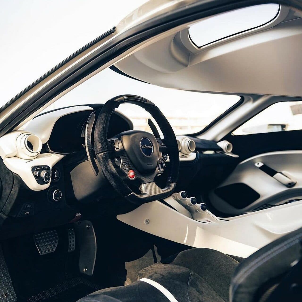 En regardant les photos de la Ferrari F12 TRS et celles de la Veloqx Fangio, il y a de trop nombreux points communs entre les deux formes avec un décalage dans le temps bien trop long pour croire qu’un Designer réellement créatif aurait passé du temps sur une ancienne caisse “périmée”, l’hypercar de Sam Li a trop de Gimmick débiles via un trop plein de nombreux appendices aérodynamiques encombrants, tels que l’aileron arrière, qui se démarque trop façon design des autres pièces. Le moteur annoncé est le “vieux” V12 de 6,3 litres qui développe 800 chevaux et 710 Nm de couple, bien loin de l’orientation “électrique” mais qui pour faire grande parade aurait reçu des modifications (lesquelles ?) lui permettant de fonctionner avec différents carburants “durables”.