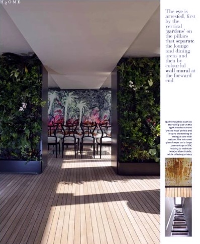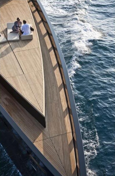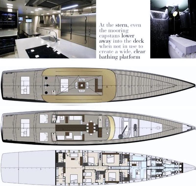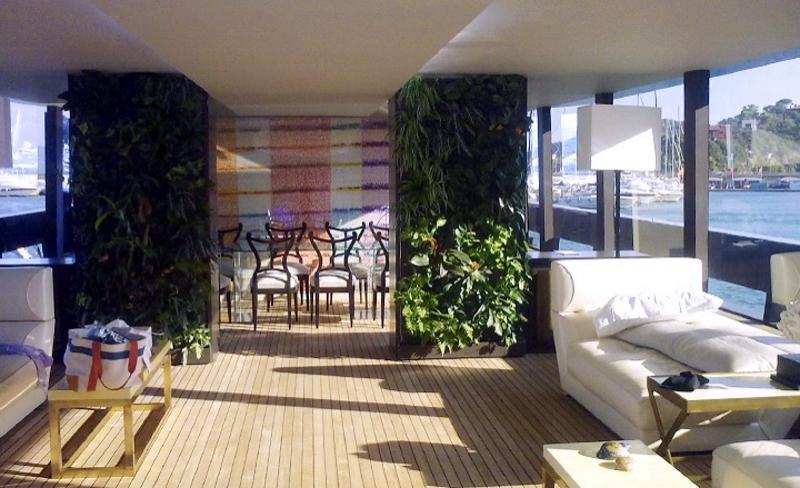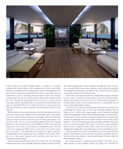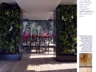 An overall appearance of a sailing yacht (void of mast) with the ability to plane at high speeds were considerations. At 25 knots continuously she has a range of just about 700 nautical miles but her cruising speed is around 18 knots. H2ome was slated to carry 3 X MTU 2000 M93 series engines but apparently uses 3 X CATs that can push her near 200-tonne frame to just under 40 knots. When I say green walls I mean living walls with plants growing on them.
