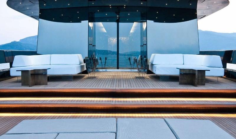 The Dining area can accommodate 10 to 12 guests for a formal dinner on a gorgeous crystal table. The wonderful aft deck and the wide spaces on motor yacht H2OME are made of nature-whitened teak offering a sense of continuity with inside and out, which ends in a very spectacular stern which features 3 terraces receding to the sea level without any interruption. The expansive views of the sea make M/Y H2OME a real ‘navigating villa’ equipped with a wonderful hall dinette on the main deck, a magnificent full beam master cabin and four luxurious guest cabins. Luxury charter yacht H2OME has a professional crew of 7 and will be based in the South of France and will cruise the West Mediterranean. Motor yacht H2OME is the ideal yacht for entertaining with vast amount of deck space that can accommodate for up to 100 guests.