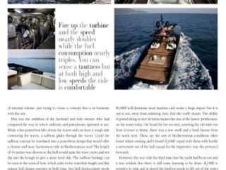 Thanks to her narrow and long bottom, the ‘double speed’ hull at 20 knots, allows navigation in displacement speed, for economical and comfortable navigation, whereas the planning hull allows navigation in surfing speed reaching a maximum speed up to 36 knots. The superyacht H2OME also has a 4.400hp Vericor gas turbine to feed a third waterjet that increases the total installed power to 8.250hp enabling a maximum speed of up to 36 knots.