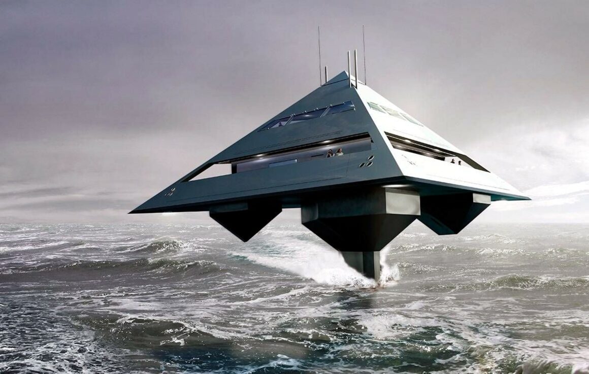 Cette scène surréaliste se superpose aux trois autres dont un AirYacht pouvant flotter dans l’air et plus sur l’eau, spermettant de s’envoyer en l’air, de voguer dans les airs et d’en avoir l’air afin de revenir épisodiquement sur terre pour mieux s’en détacher ! C’est lui sur lequel je vais me laisser aller. Les autres j’y reviendrai plus tard dans le temps qui me reste encore (peut-être) à vivre… 73 Printemps ce 16 mai 2022 ! Quoique je ne peux m’empêcher (par pur vice) de vous causer du Tétrahedron. Ce n’est pas l’œuvre d’un Egyptologue obsédé par les pyramides, ni par un adepte de films d’anticipation, c’est un concept de superyacht conçu par l’architecte Jonathan Schwinge, un designer basé à Londres qui s’est senti devenir le Pharaon Khéops ! Sa création s’éloigne de la conception traditionnelle des Yachts et propose une solution radicalement simple permettant de surfer sur les eaux même déchainées.