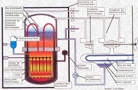 Un circuit d’eau primaire transmet la chaleur libérée, après passage dans un échangeur à un circuit d’eau secondaire. Dans un souci de discrétion acoustique, le circuit de vapeur primaire est en circulation naturelle. L’eau du circuit secondaire se transforme en vapeur, libère son énergie dans les turbo-alternateurs qui produisent de l’électricité, puis passe dans un condenseur ou elle est refroidie (revenant ainsi à l’état liquide) avant d’être réinjectée dans l’échangeur et vaporisée à nouveau. L’eau du circuit secondaire n’est jamais en contact avec les produits radioactifs. L’électricité alimente les équipements de l’ensemble du bâtiment et les moteurs électriques de propulsion qui font tourner l’hélice.