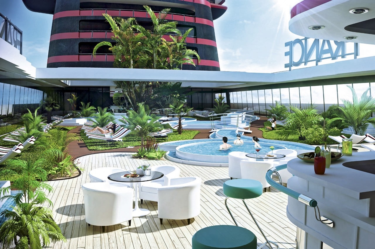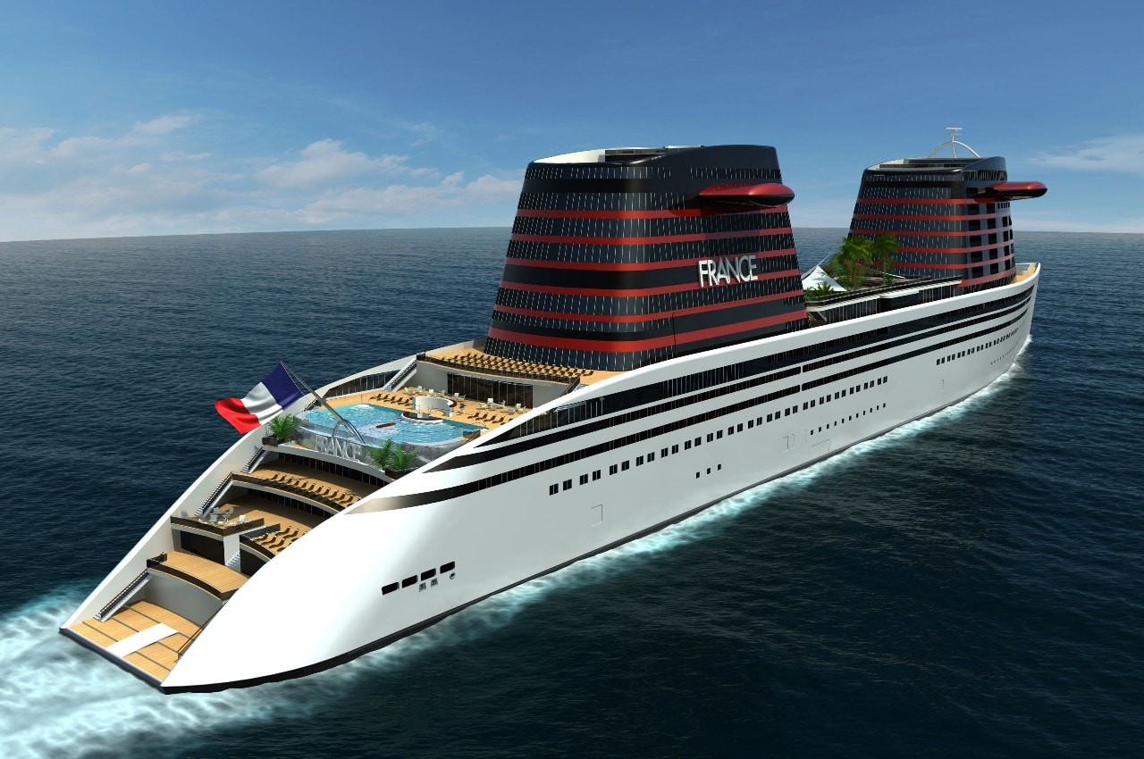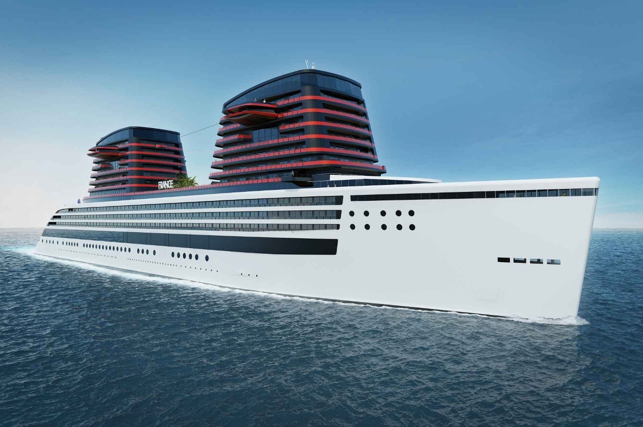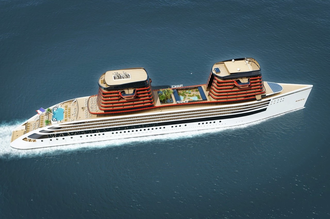 – Je voulais que ce nouveau France ait à la fois un design très différent des autres paquebots existants et qu’il soit immédiatement reconnaissable… explique-t-il… Les cheminées se sont imposées comme le trait le plus marquant de l’ancien France. Je les ai revisitées en créant des volumes habitables à l’intérieur : des suites et des extensions avec une vue à 360 degrés. Une palmeraie avec piscine s’étend sur le pont inférieur, plus huit restaurants, un spa, une salle de sport… Il y aura même un terrain de pétanque, une école de cuisine, un casino et une salle de cinéma panoramique…