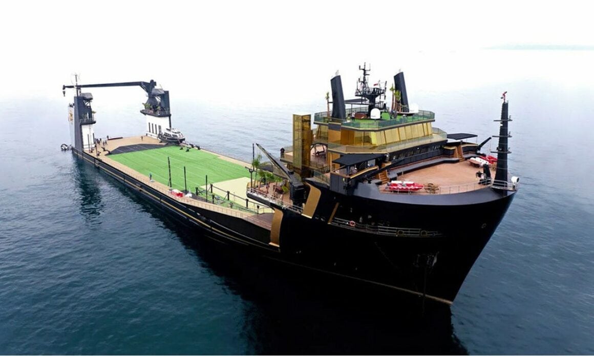 Cette structure de 146 mètres peut s’immerger partiellement pour faciliter l’arrivée et le départ de véhicules marins. Timur Bozca s’est fait plaisir sans limite de coût, l’impératif était d’aller plus loin que le luxe ostentatoire habituel.