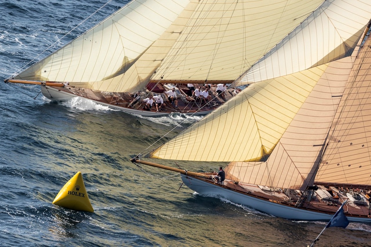 Passés les premiers bords certes lymphatiques mais ô combien stratégiques au fond du golfe, la grande sarabande des beaux classiques gîtés sur la houle pouvait débuter, pour trois heures et 14 milles de régate comme dans les rêves, parsemés de croisements de toutes formes de gréements et de longs bords à bords des coques les plus élancées créées voici plus d’un siècle par les Maîtres de l’architecture navale.