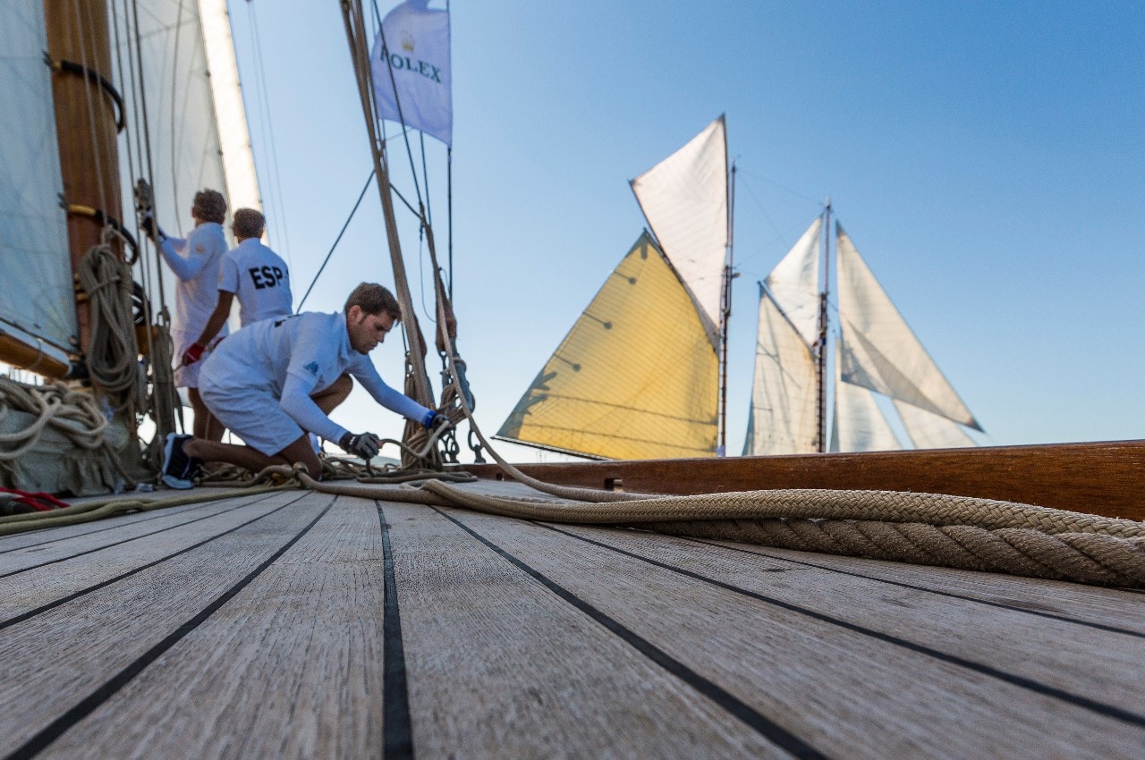 La bouée au vent n’est plus qu’à quelques encablures et la trentaine d’équipiers d’Elena of London, une goélette de 50 m de long lancée “pleine balle”, préparent le premier virement de bord et ça se bouscule au portillon…
