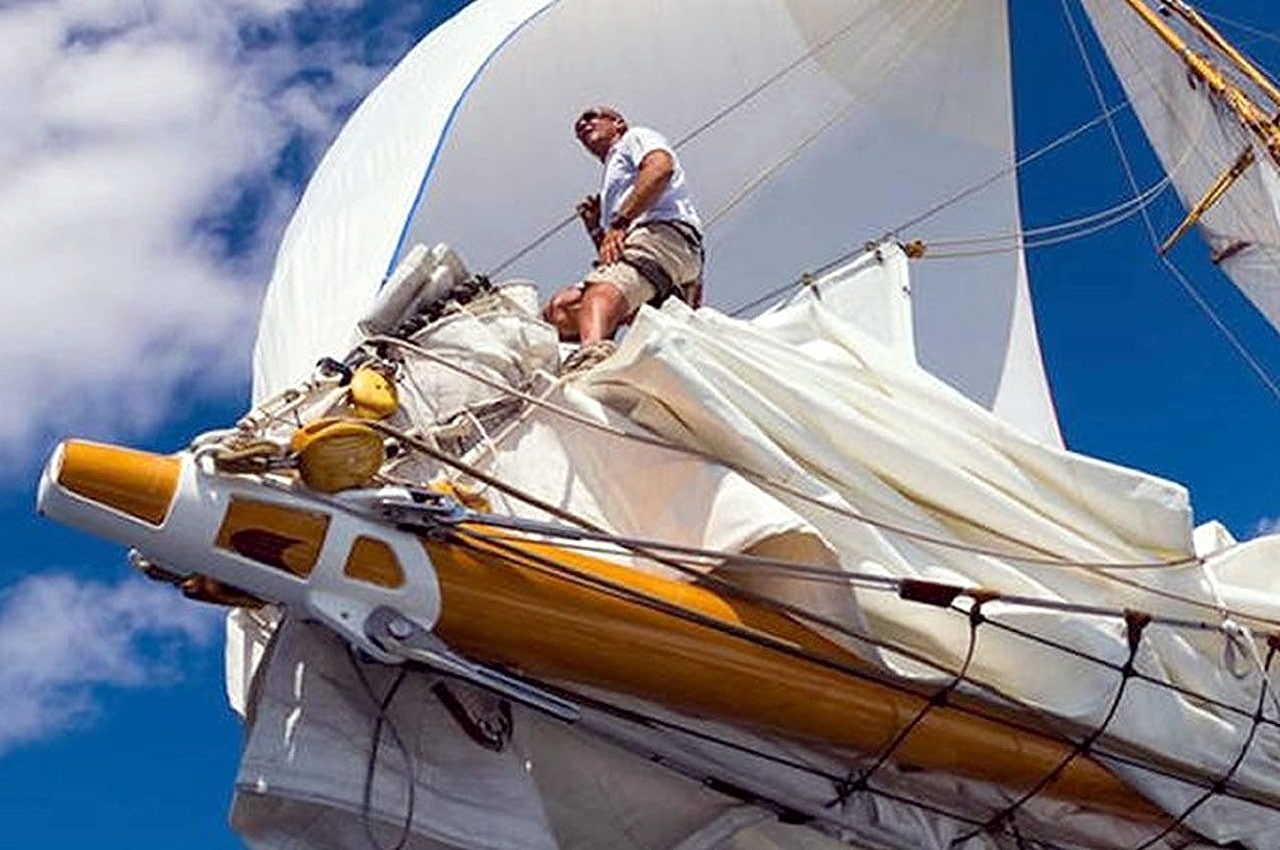L’immense spinnaker (environ 900 m2) d’Elena est maintenant en l’air, bien gonflé… et le bateau accélère tandis que l’équipage, épuisé, tente de récupérer, allongé sur le pont.