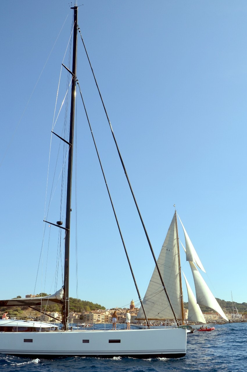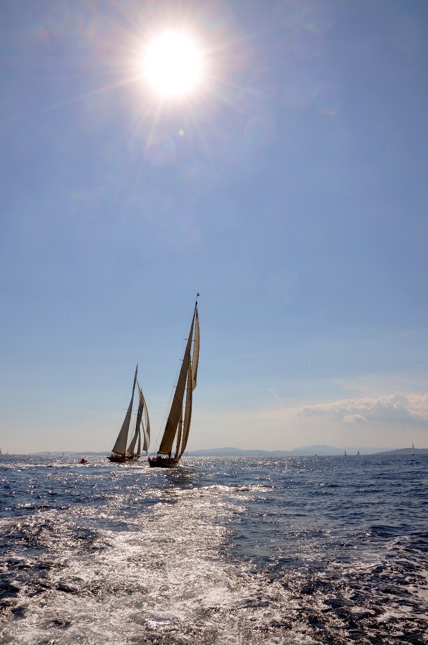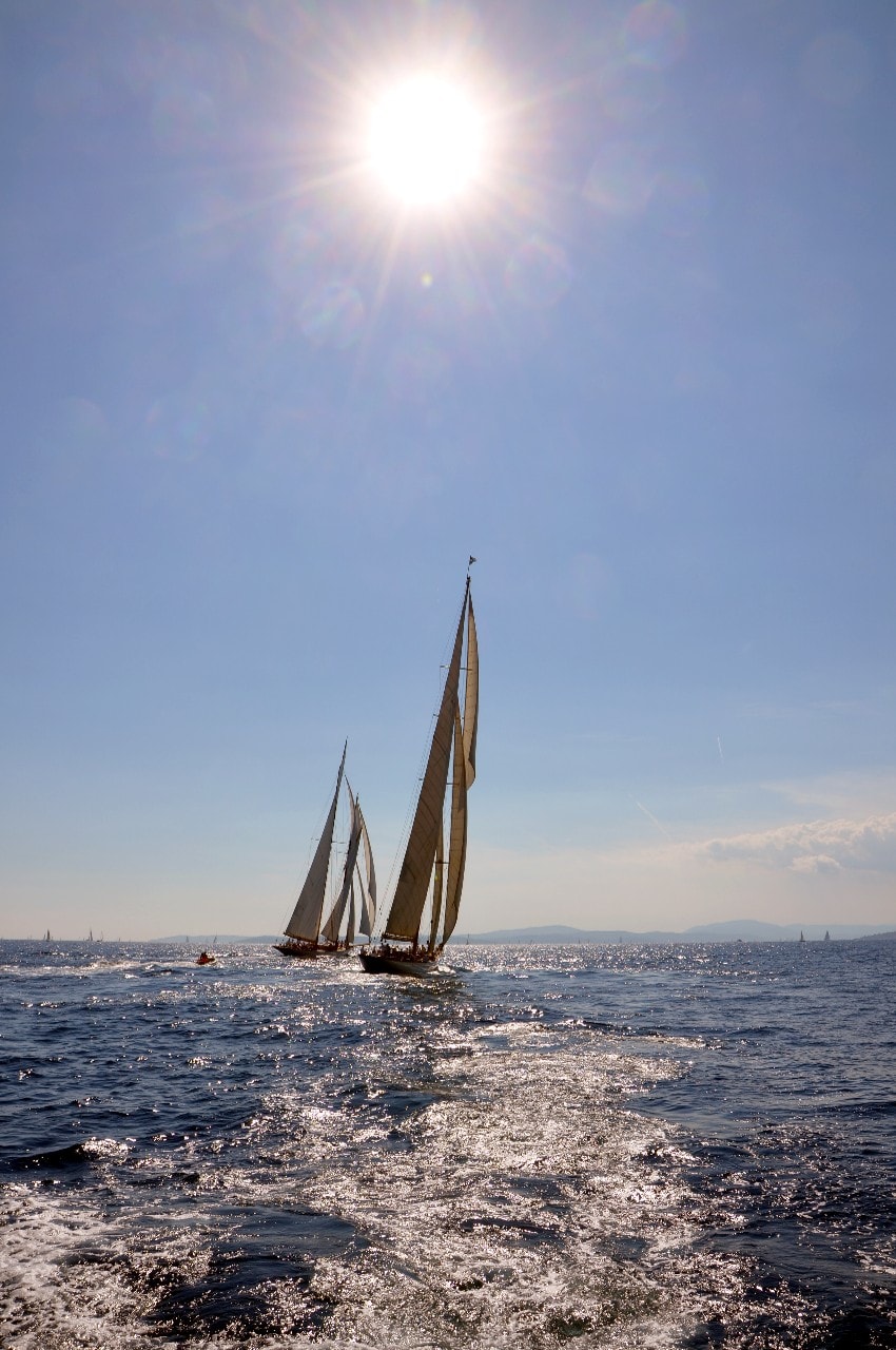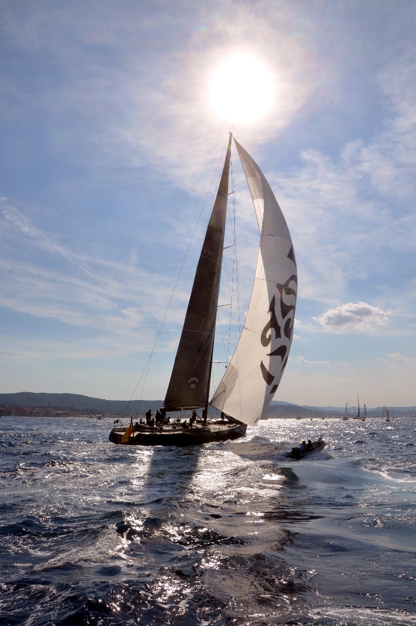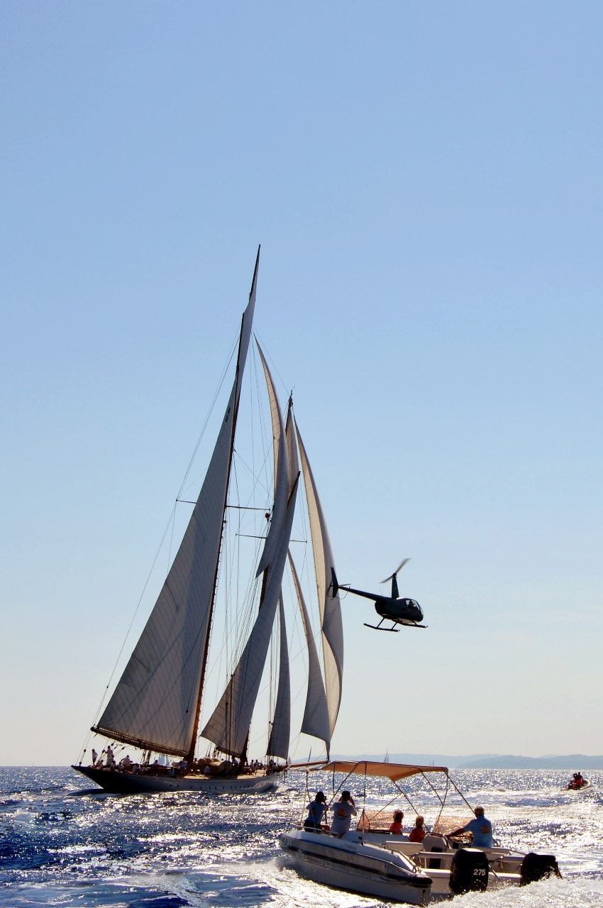 Dans le plan d’eau du golfe de Saint-Tropez, tout paraît si petit sur ces maxi-yachts infiniment grands, les autres bateaux semblent à l’arrêt, le clocher, au loin, a l’air si minuscule à l’ombre des mâts à la hauteur démesurée.