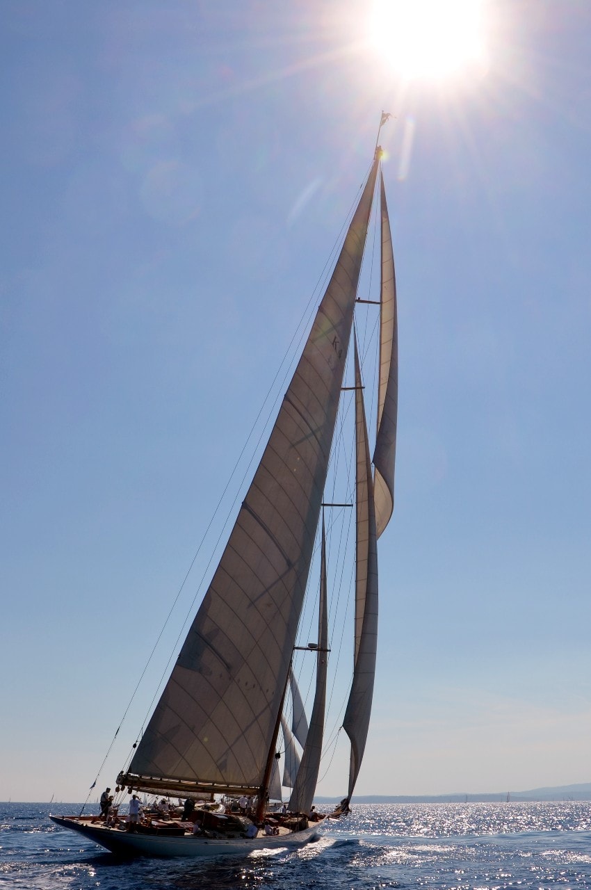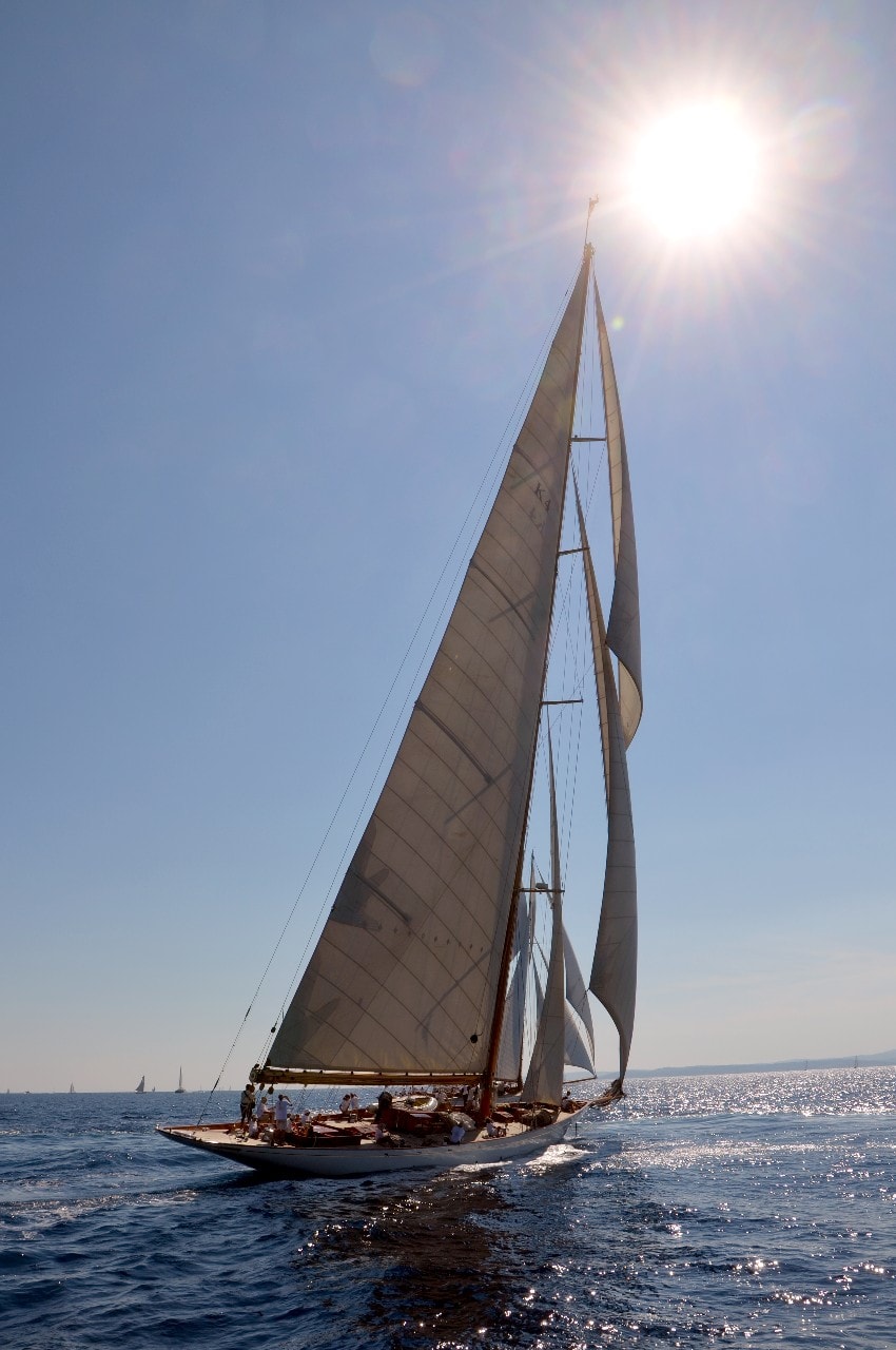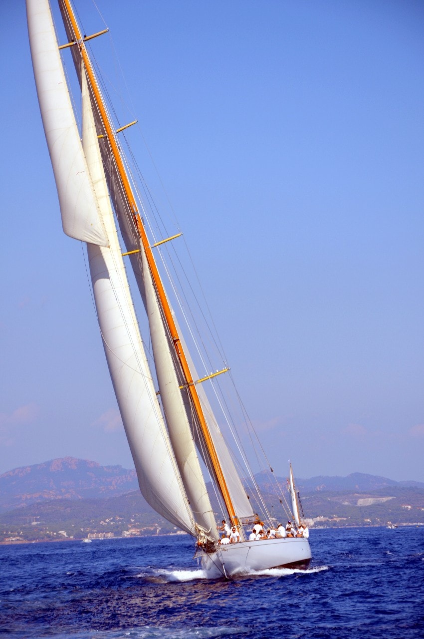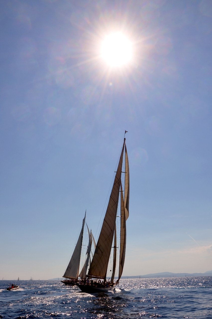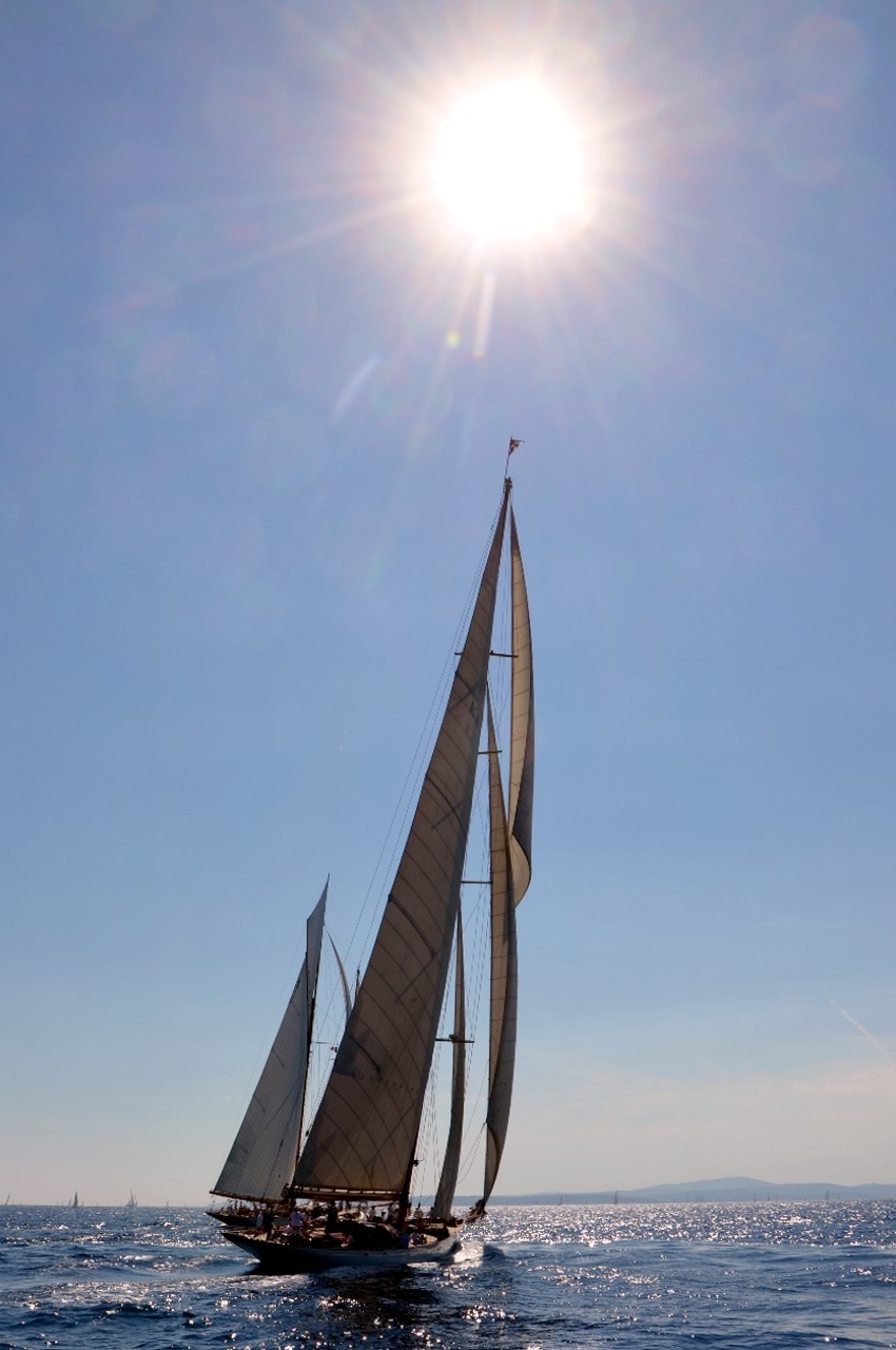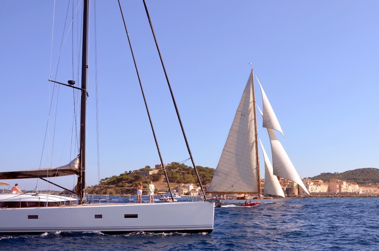 Dans le plan d’eau du golfe de Saint-Tropez, tout paraît si petit sur ces maxi-yachts infiniment grands, les autres bateaux semblent à l’arrêt, le clocher, au loin, a l’air si minuscule à l’ombre des mâts à la hauteur démesurée.