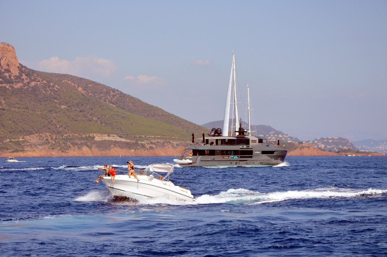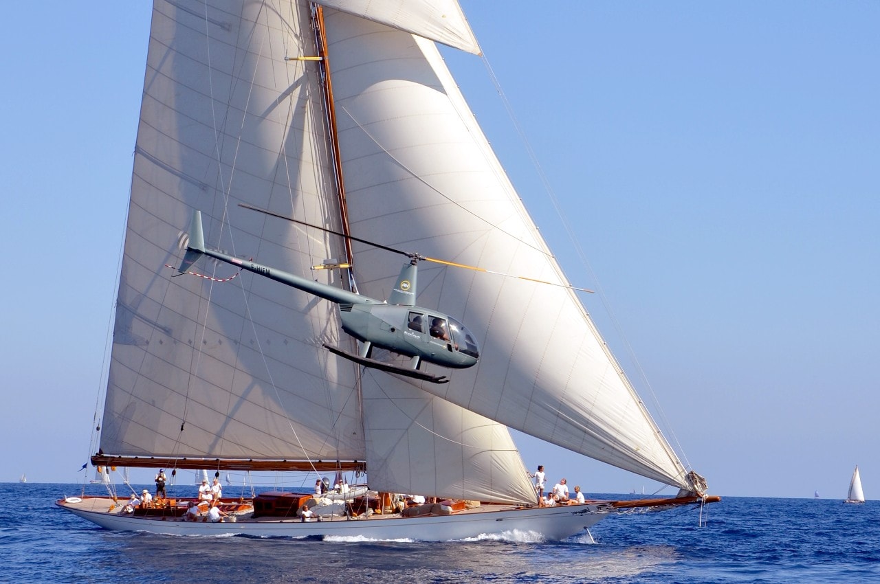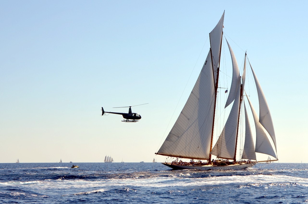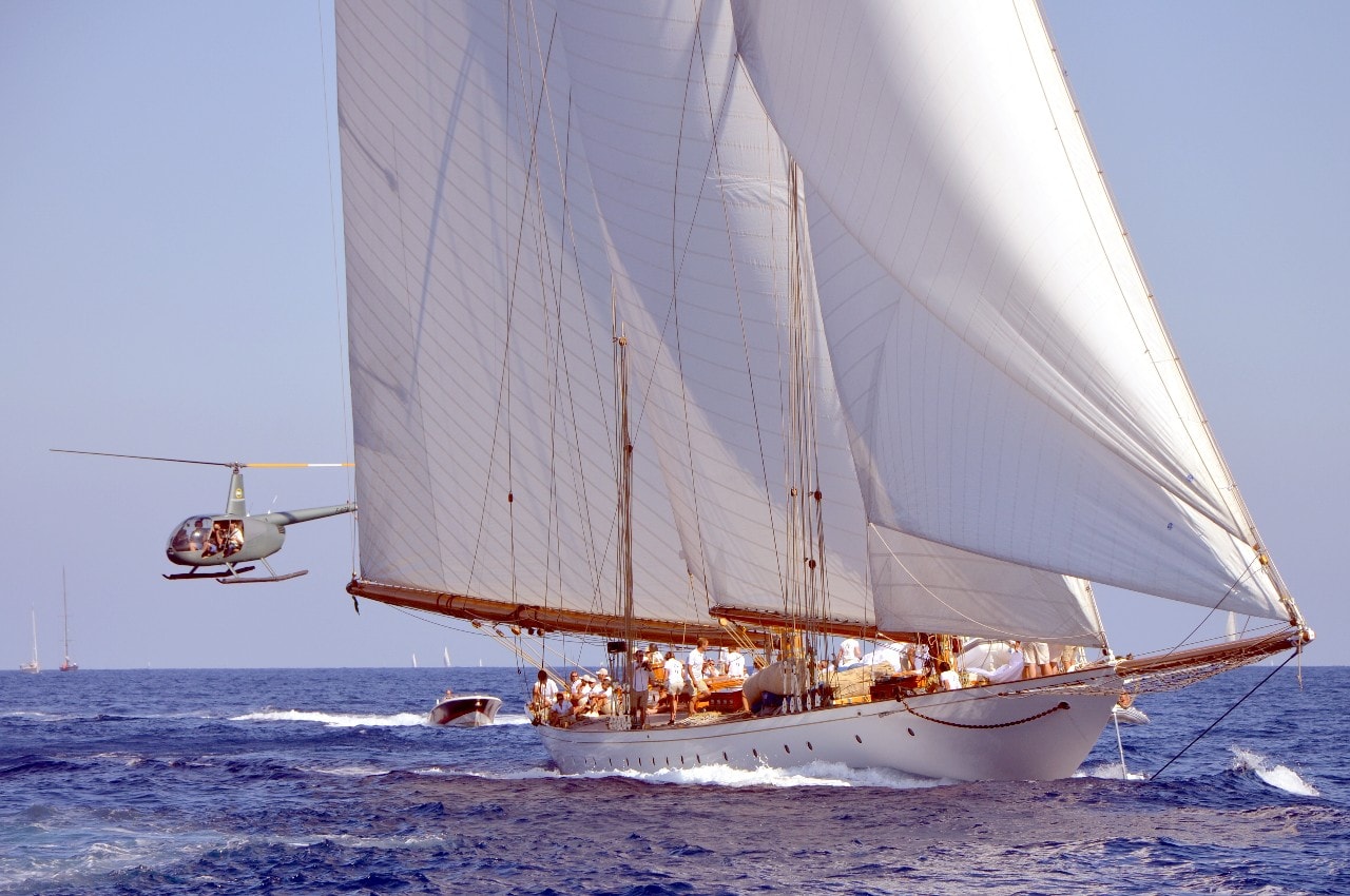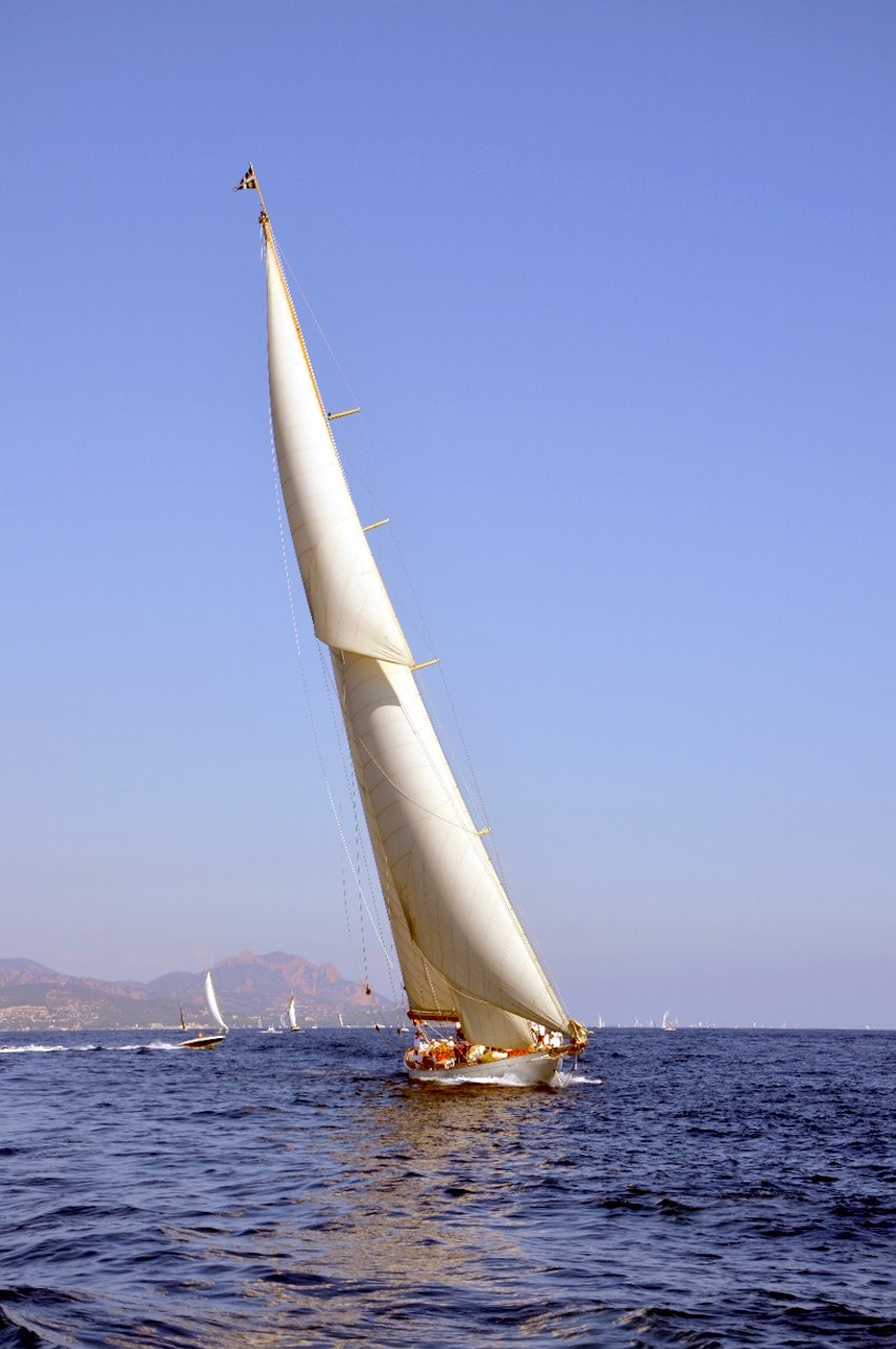 Dans le plan d’eau du golfe de Saint-Tropez, tout paraît si petit sur ces maxi-yachts infiniment grands, les autres bateaux semblent à l’arrêt, le clocher, au loin, a l’air si minuscule à l’ombre des mâts à la hauteur démesurée.