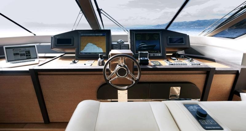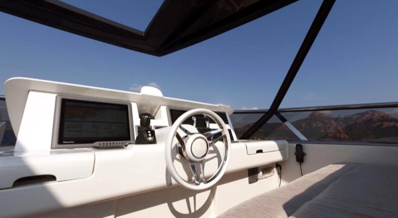 “Deux escaliers descendent vers les volumes de coque. Le premier dessert la cuisine principale et les deux couchettes équipage; le second les cabines armateur et passagers. La timonerie fait partie intégrante du salon salle à manger, mais demeure discrète. Elle offre une banquette biplace à qui il manque sur la droite un accoudoir, élément de confort, mais aussi de sécurité, étant donné que, pour l’instant, c’est le vide, juste au-dessus de l’escalier qui mène aux cabines. Le chantier étudie une formule. Sur le Monte Carlo Yachts 76 la suite a été conçue avec beaucoup de goût et d’intelligence”….