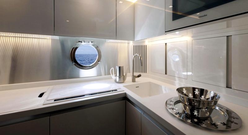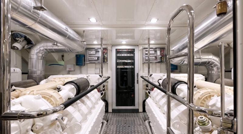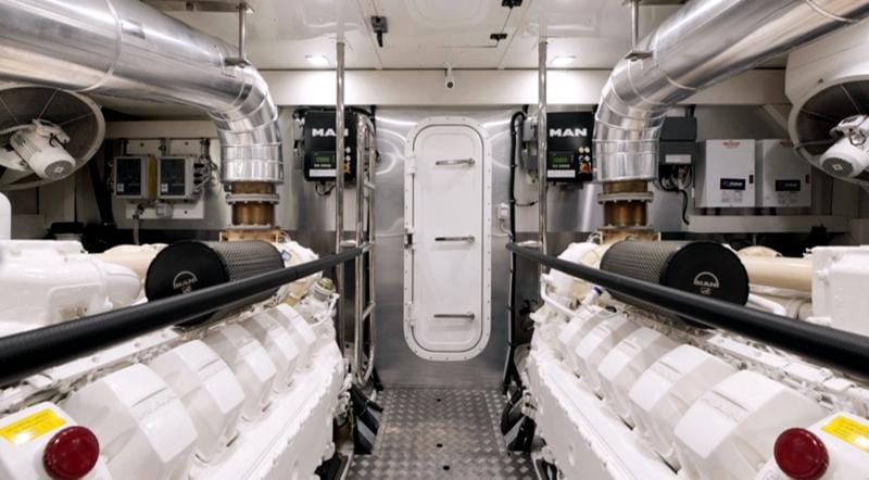 À l’arrière, la surface restante était occupée par l’annexe (3,85 mètres) destinée à y placer des transats et un tender sur une plate-forme hydraulique. Je n’ai pu résister à visiter la salle des machines, la cale moteur recèlait une paire de 1400 chevaux MAN, nouvelle génération, accouplée à des lignes d’arbre.