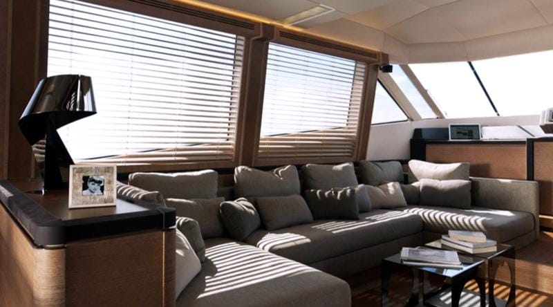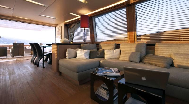 “Pour rejoindre le cockpit, on emprunte un pont à la “Portugaise” et des coursives. Et là, bien sûr, pour les designers, la seule solution était un plancher de plain-pied et une baie vitrée s’ouvrant au maximum sur le salon intérieur. Son volume s’en est vu sublimé. La salle à manger, pour qu’elle soit opérationnelle et puisse accueillir les huit convives, on doit déplacer la table très design (plateau en verre et pieds en cuir) vissée au plancher pour des raisons de sécurité en navigation. Le salon (banquette en U, table basse et poufs) se situe à l’avant de cet espace est baigné de lumière naturelle par des vitres latérales qui naissent à mi-hauteur. Le plafond est doté de nombreux panneaux d’éclairage de type Led. Sur tribord, face à la salle à manger, se trouvent des rangements conçus pour la vaisselle et, en vis-à-vis du salon, un écran TV s’extirpe électriquement grâce à une télécommande”… Je l’écoutais en demi-teinte, bercé par sa voix autant que par le léger balancement du yacht…