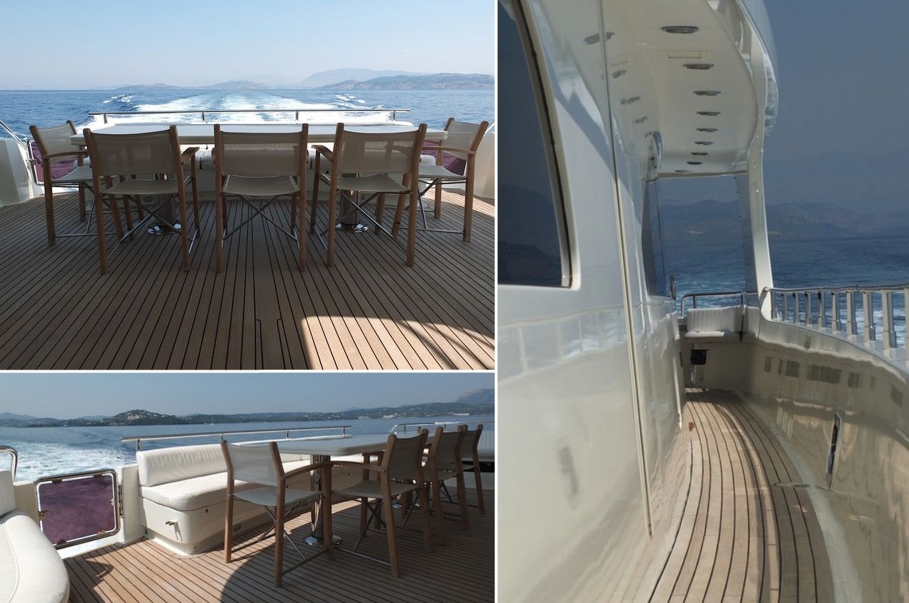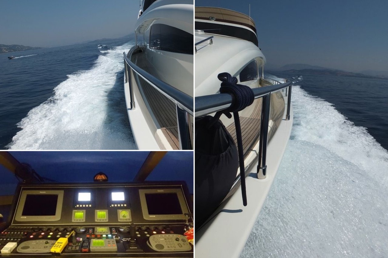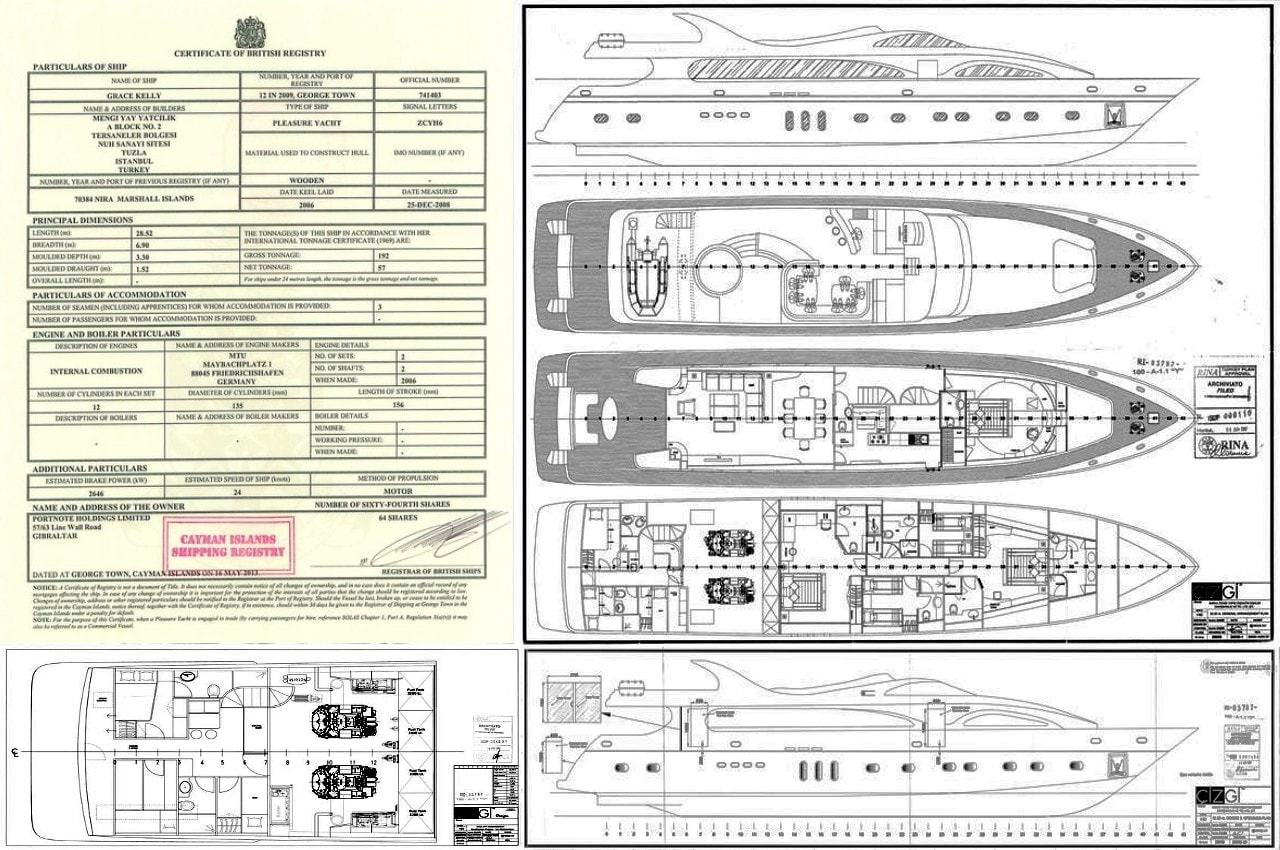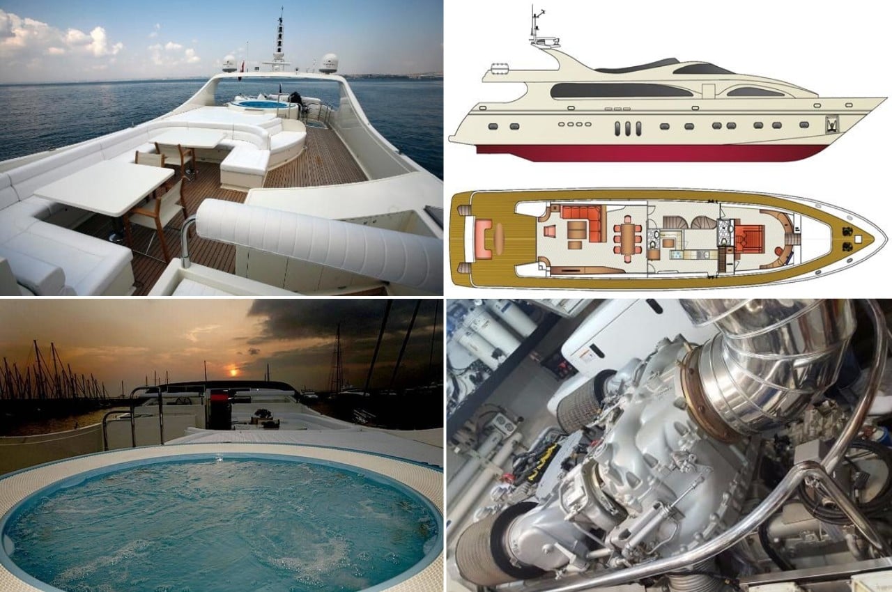 – Quel bonheur… Pendant les préparatifs, je vous ai apporté quelques documents que je vous laisse examiner… Longueur : 33,00 m/108,27 ft Largeur : 6.90 m/22,64 ft Moteurs : 2 x 1.800 CV (heures de fonctionnement 2.450) Ponts (étages) : 3 Suite de propriétaire : 1 (sur 2 ponts : pont principal & pont inférieur, lit double King-Size, avec salle de bains et salle de bains de luxe) Suites d’hôtes : 2 (à la fois sur le pont inférieur, au-dessus du niveau de l’eau, chacune avec sa propre salle de bains et lit double king size) Cabines d’hôtes : 2 (les deux avec 2 lits simples) Cabines équipage : 1 cabine de capitaine, 2 cabines équipage (2 membres dans chaque cabine ) Capacité passagers : 12 personnes + 5 membres d’équipage Vitesse. Max / croisière : 22 nœuds/14 nœuds Société de classification : RINA Le navire a eu une remarquable révision classe de cale annuelle sur rive. Le navire sera livré entièrement en classe par les propriétaires actuels, dans les 30 jours après paiement. RINA no : 83787 Drapeau : Cayman Islands Port d’immatriculation : George Town No de registre : 012IN2009 Date de construction (fin) : juin 2010 (quille posée : juin 2006) Le navire est équipé de tous les équipements habituels pour les yachts haut de gamme et est mis en vente, avec tous les inventaires, accessoires, équipements, mobilier, appareils, appareils de cuisine & engrenage, literies, Chine, verrerie, glacières, réfrigérateurs, bateau auxiliaire, bâche de pont supérieur, terrasse arrière avec coupe vent, équipement marine & navigation, audio & systèmes tv, climatisation et toutes les machines à bord & équipement technique : Electronique : Radar, Radio, sondeur, GPS, lecteurs DVD, téléviseurs plasma, lecteurs de CD, peintures, ordinateur, boussole, Repeater, centre de navigation, haut-parleurs cockpit , journal de compteur de vitesse, pilote automatique, traceur, VHF, vitesse et direction vent, détecteur de radar, voiles, bimini-top Equipement intérieur, réfrigérateur, pompe de cale électrique, climatisation, congélateur, chauffage, four à micro-ondes, air compresseur, pompe de cale manuelle, tête électrique, four, dessalinisateur, pompe pour eau de mer, chargeur de batterie, eau chaude, machine à laver, propulseur d’étrave, générateur, alimentation de rive, onduleur, Equipement extérieur : réflecteur radar, coussins de cockpit, radeaux de sauvetage, table de cockpit, pont en teck, bateau auxiliaire, douche de cockpit, passerelle hydraulique, cockpit teck, échelle de baignade, bâches, taud de cockpit, jacuzzi extérieur, transat pont supérieur, table de pont supérieur & canapés, barreau du haut-pont, table de pont arrière & canapés, terrasse lounge sur pont avant et de nombreux éléments & équipements