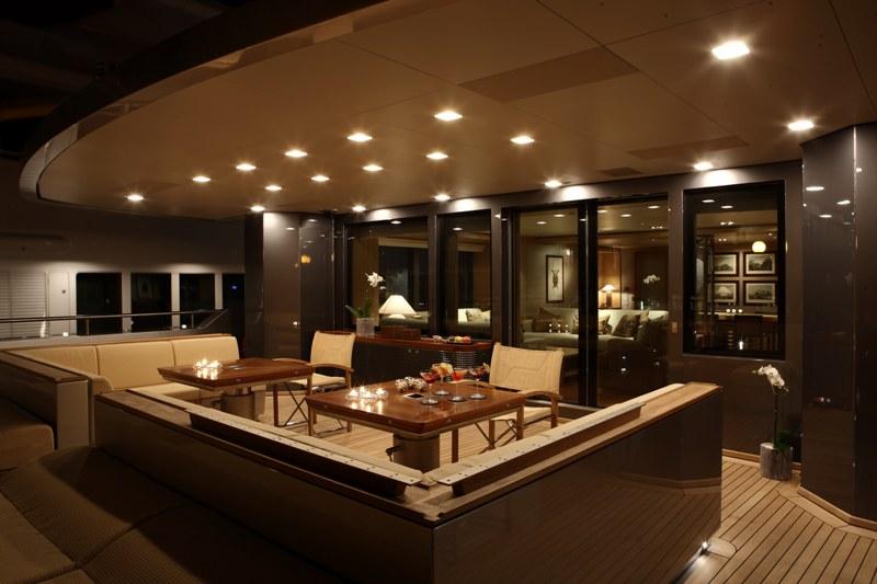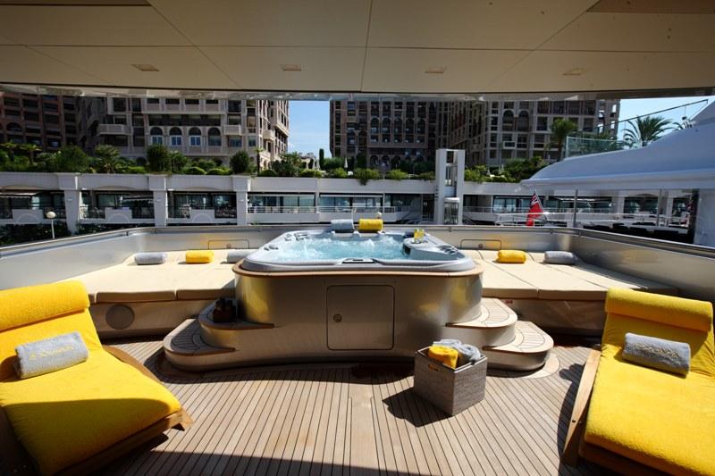 La coque comporte une quille qui rigidifie la structure, protège les hélices et limitera les dommages en cas d’un éventuel échouage. Les espaces extérieurs sont répartis de la manière suivante : un grand cockpit avec canapés, table et bains de soleil, un jacuzzi entouré d’un immense solarium sur le pont supérieur, puis un vaste espace à l’avant qui peut être aménagé avec des fauteuils et des matelas bains de soleil.
