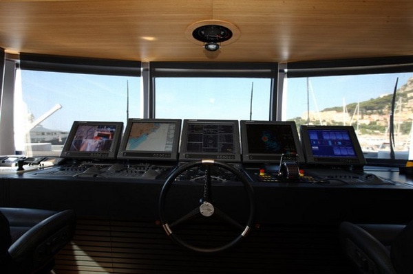 En montant sur le pont supérieur, on accède à la magnifique timonerie accolée à un petit salon panoramique.