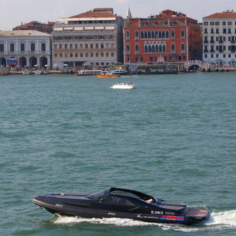 Le Powerboat Lancia laisse les reflets multicolores se perdre dans le bleu lagunaire.