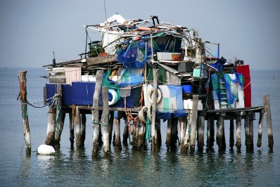 Il en est une plus folle que les autres, un fatras improbable de vieilles portes peintes, d’anciens volets de plastiques gris, de tubes rouillés et tordus entre lesquels achèvent de sécher des bouts de filets bleus et verts…, de pots où s’épanouissent quelques plantes faméliques.